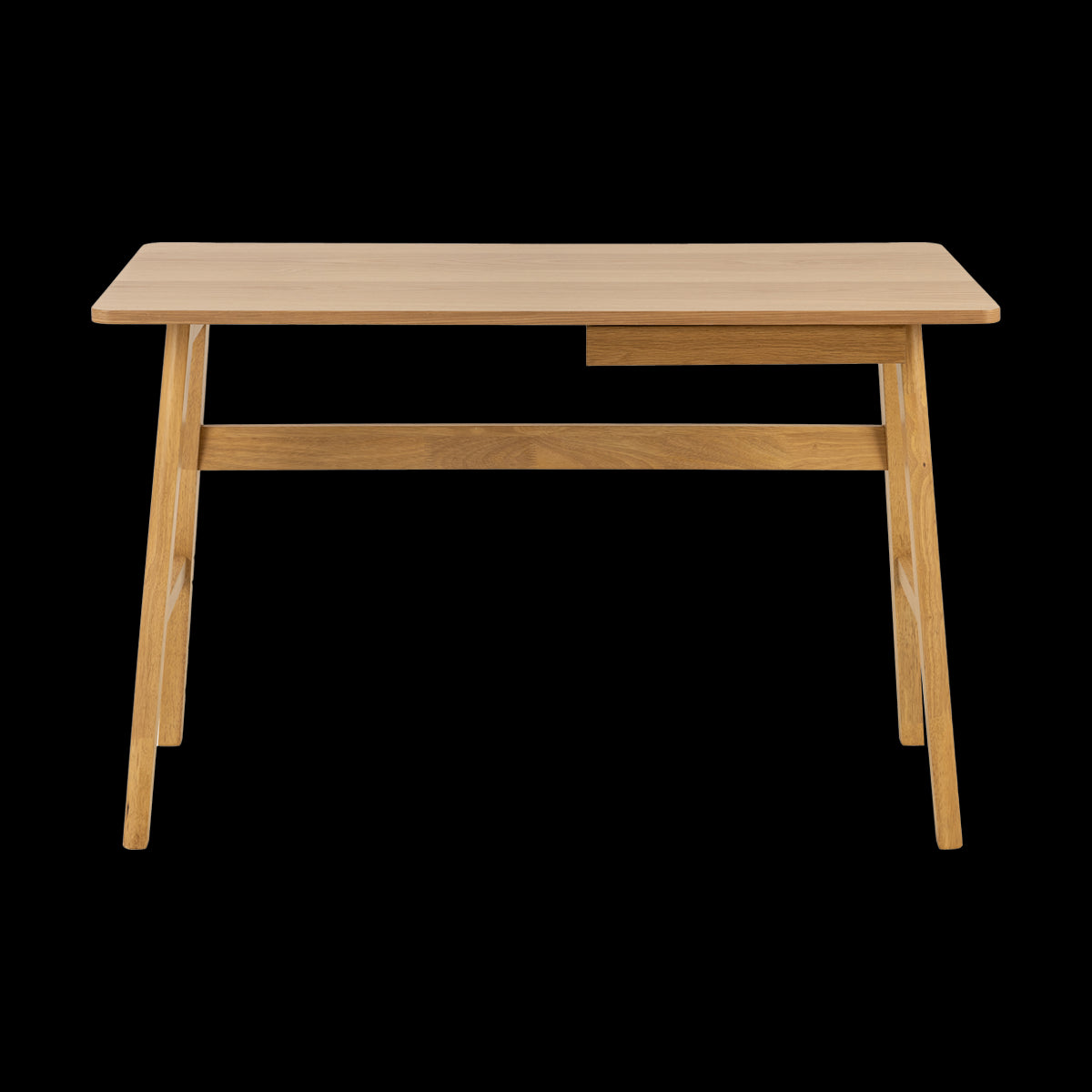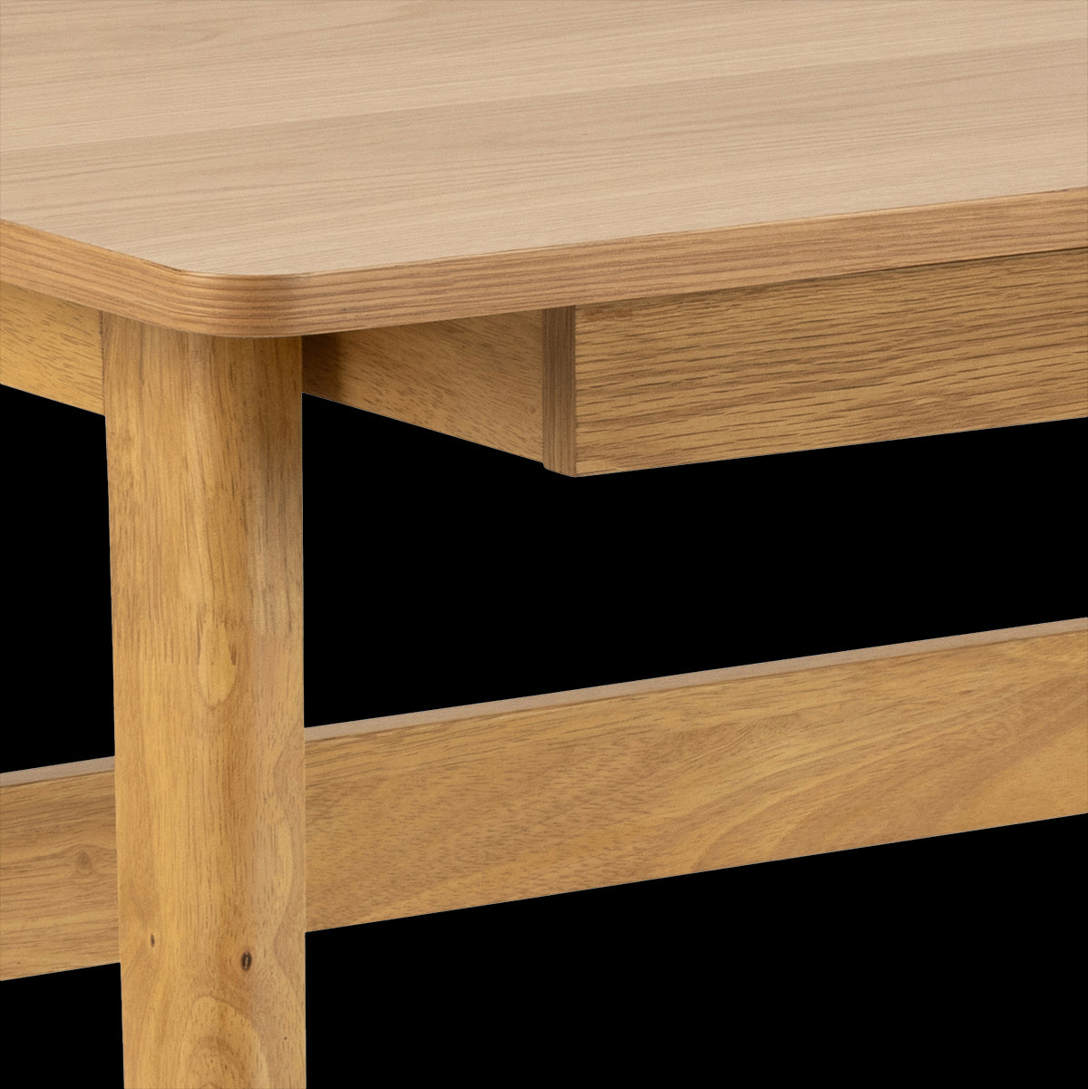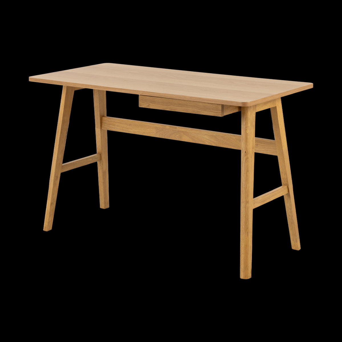 Dit leuke bureau is niet alleen functioneel maar staat ook nog eens leuk in je werkruimte. Het bureau heeft een tafelblad gemaakt van hout met een laag eikenfineer. Het frame en de poten zijn gemaakt van rubberhout, wat een zeer ecologisch vriendelijke houtsoort is, en zijn afgewerkt met een beits in naturel eiken kleur. Dit houten bureau heeft een handige lade voor het opbergen van spullen. Zo blijft je werkruimte netjes en georganiseerd. Op het tafelblad is er voldoende ruimte voor je computer, boeken, documenten en andere benodigdheden, terwijl je losse spullen uit het zicht houdt in de opberglade. Zo is dit bureau met opbergruimte ideaal voor zowel werk als studie.