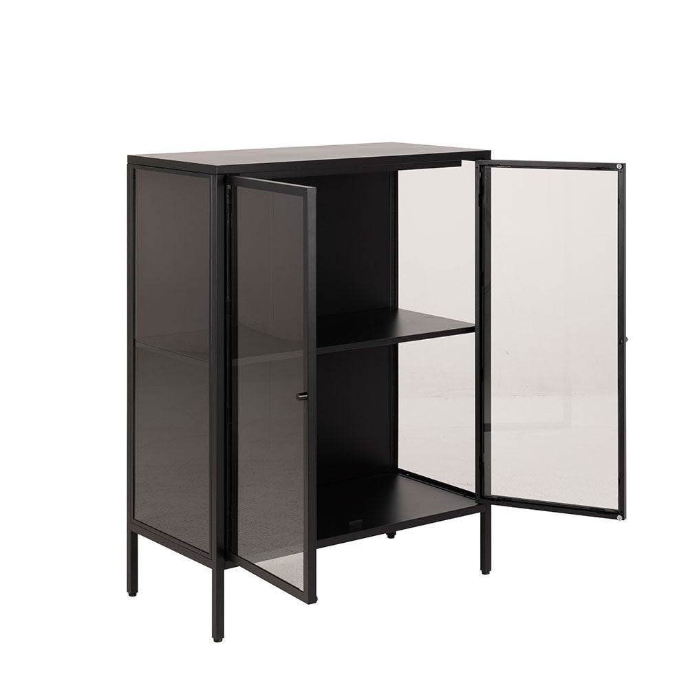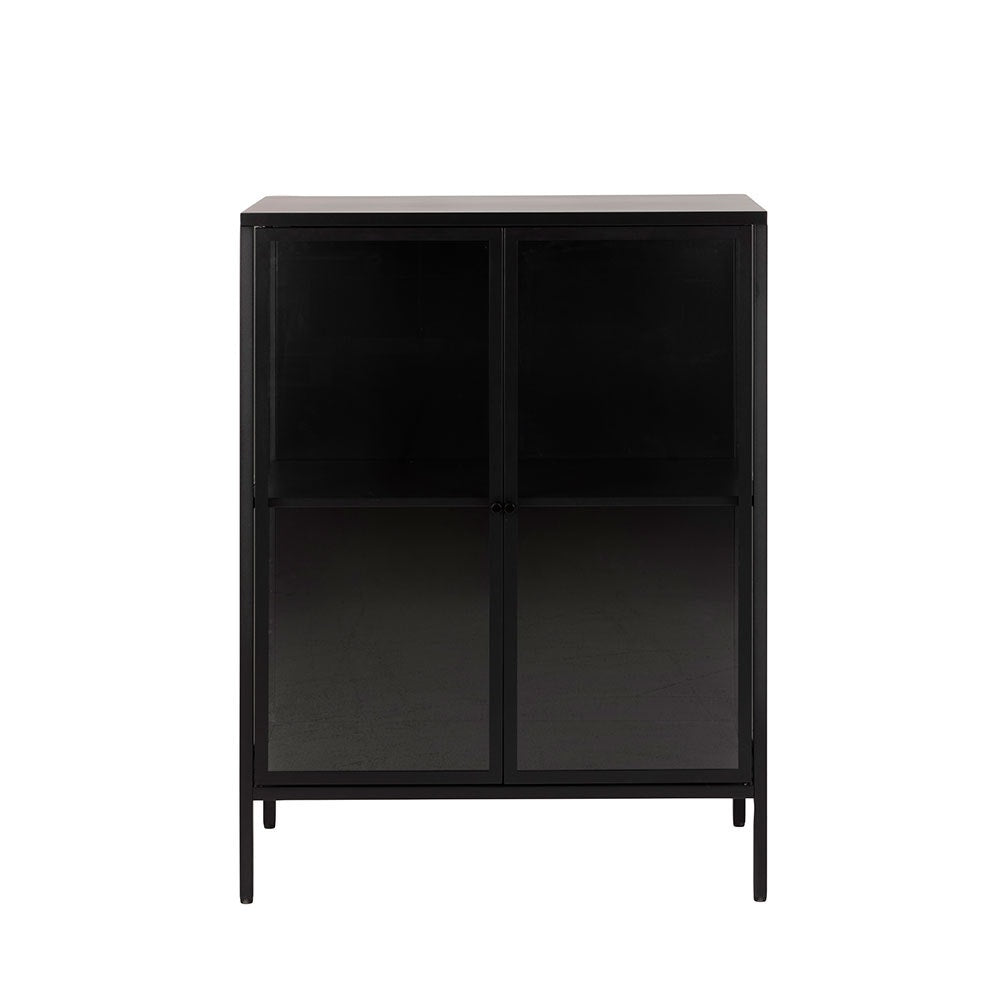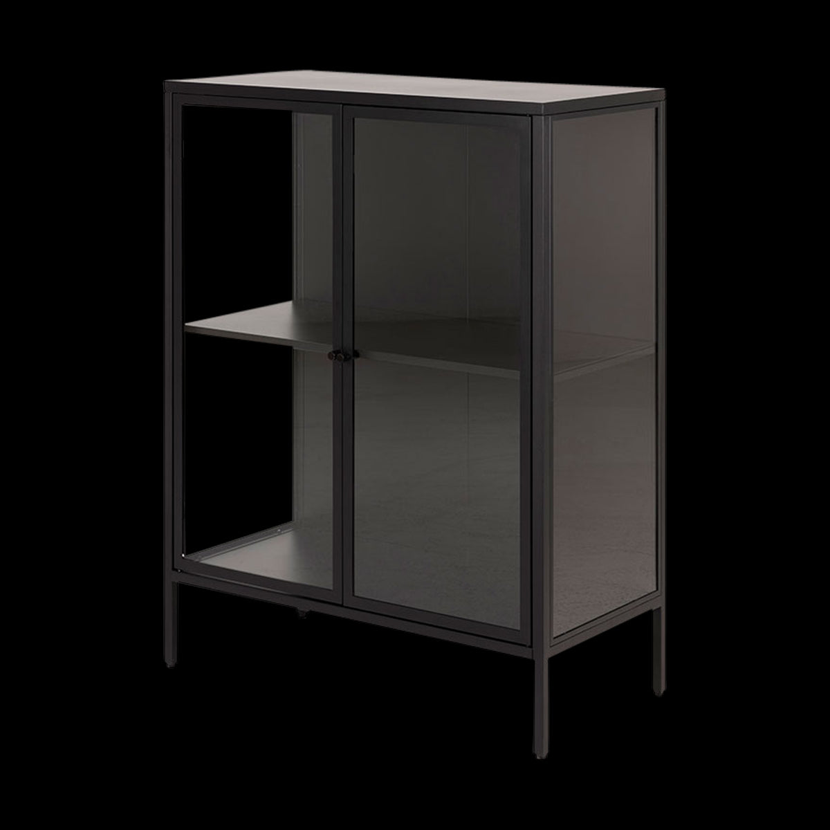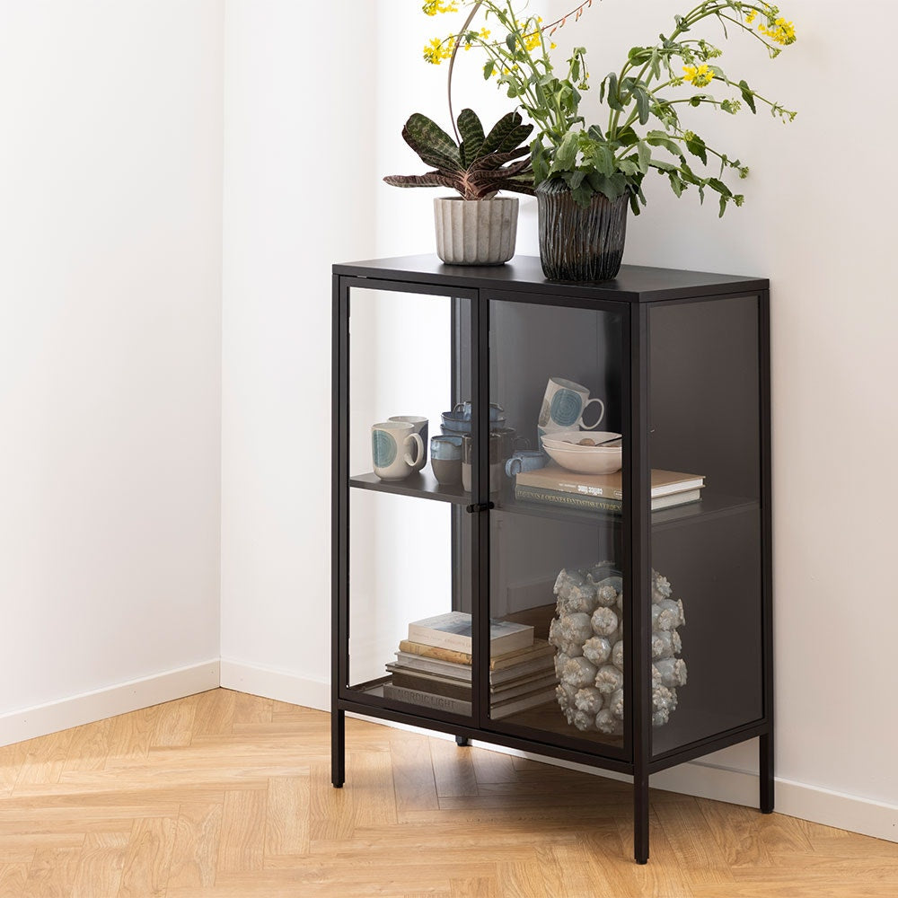 De Roy metalen vitrinekast heeft een industriële uitstraling door het metalen frame. De kast biedt voldoende ruimte om je mooiste servies of andere accessoires in neer te zetten. Achter de glazen deurtjes vind je één legplank waar je netjes je spullen kunt neerleggen.