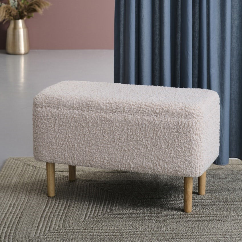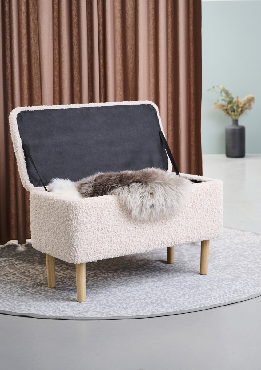 Het Sem bankje met teddy bekleding van Lisomme staat niet alleen mooi in huis, je krijgt er ook nog eens extra opbergruimte bij.