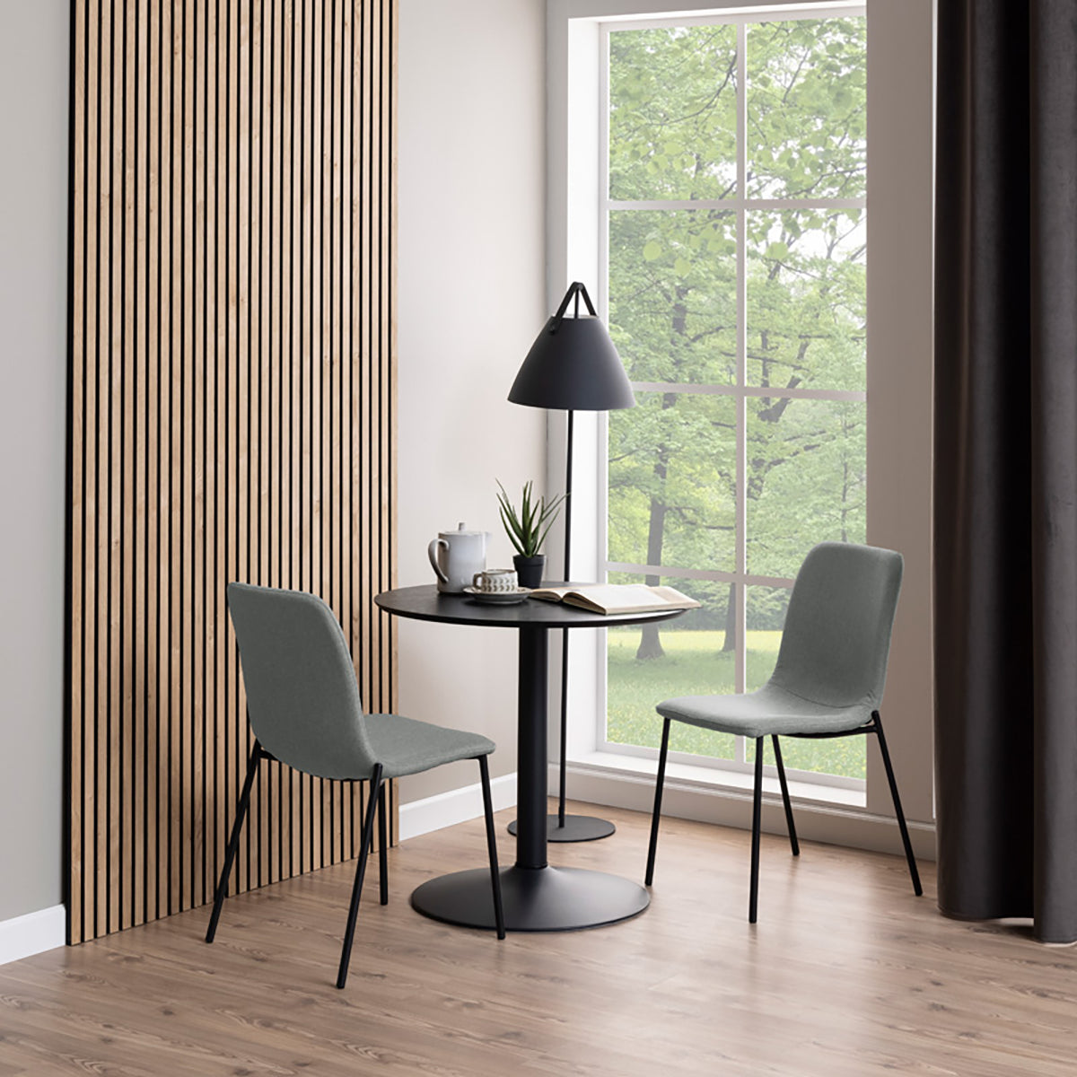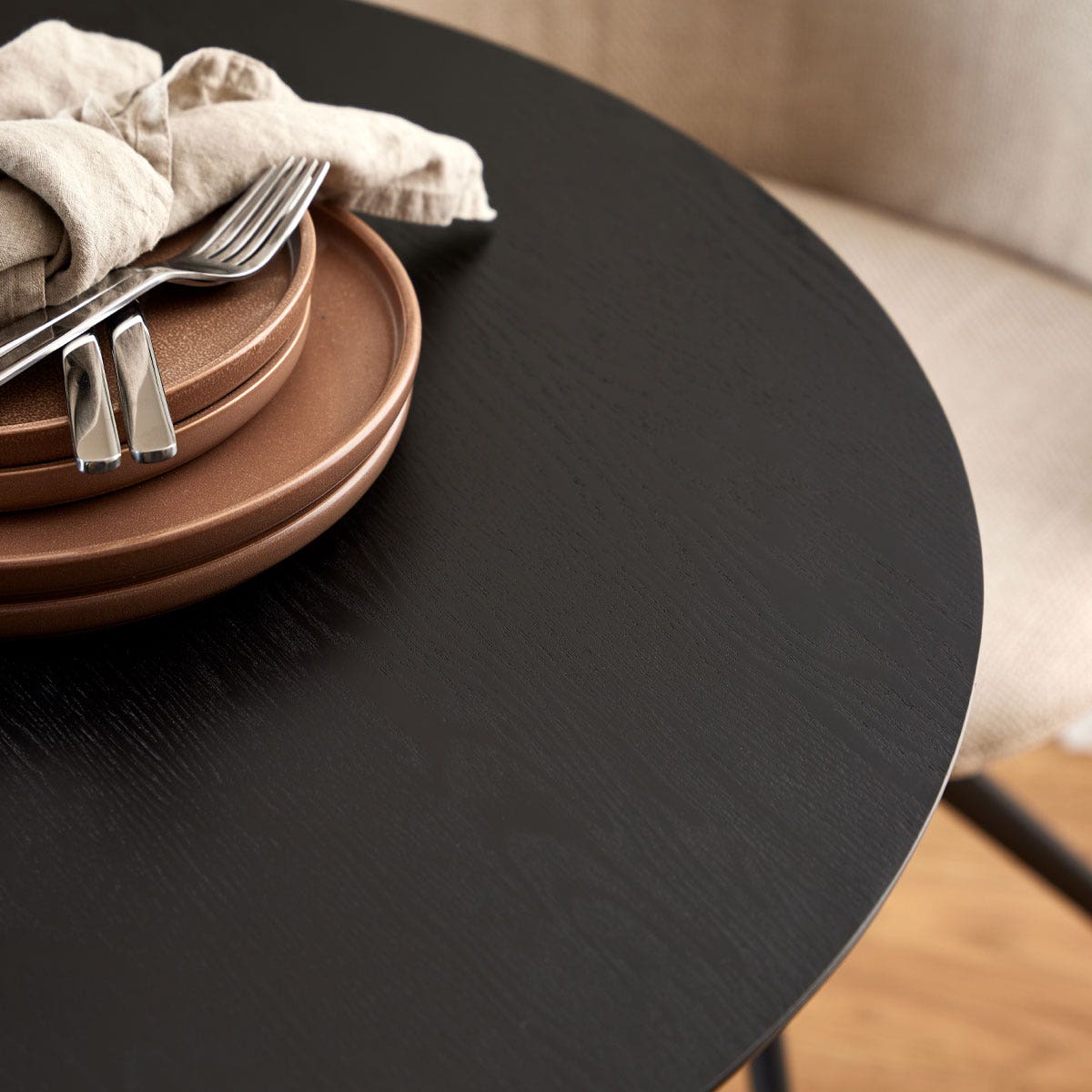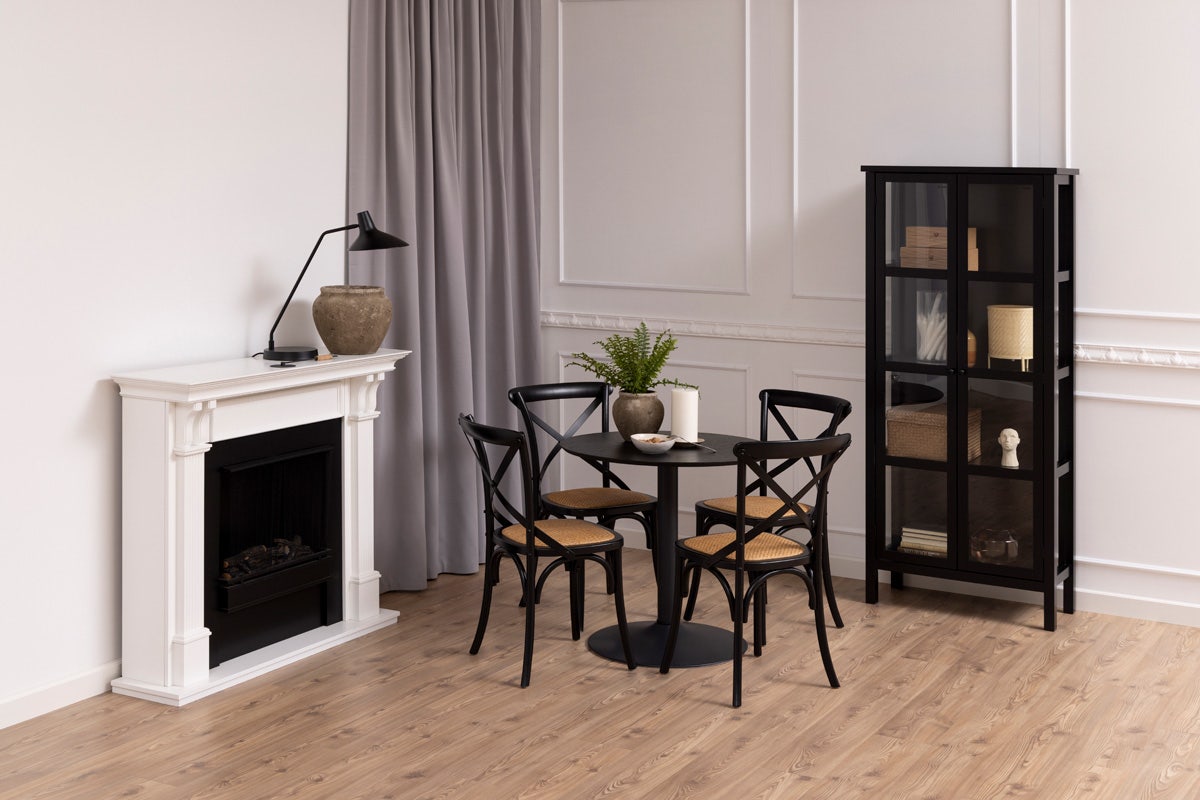 Het metalen onderstel vormt een modern contrast tegen het houten tafelblad. De strakke poot van de tafel zorgt ervoor dat de tafel licht en modern oogt. Dankzij de ronde vorm neemt de tafel weinig ruimte in beslag en door het ronde onderstel zit er nooit een tafelpoot in de weg. En bovendien zit je altijd gezellig tegenover elkaar.