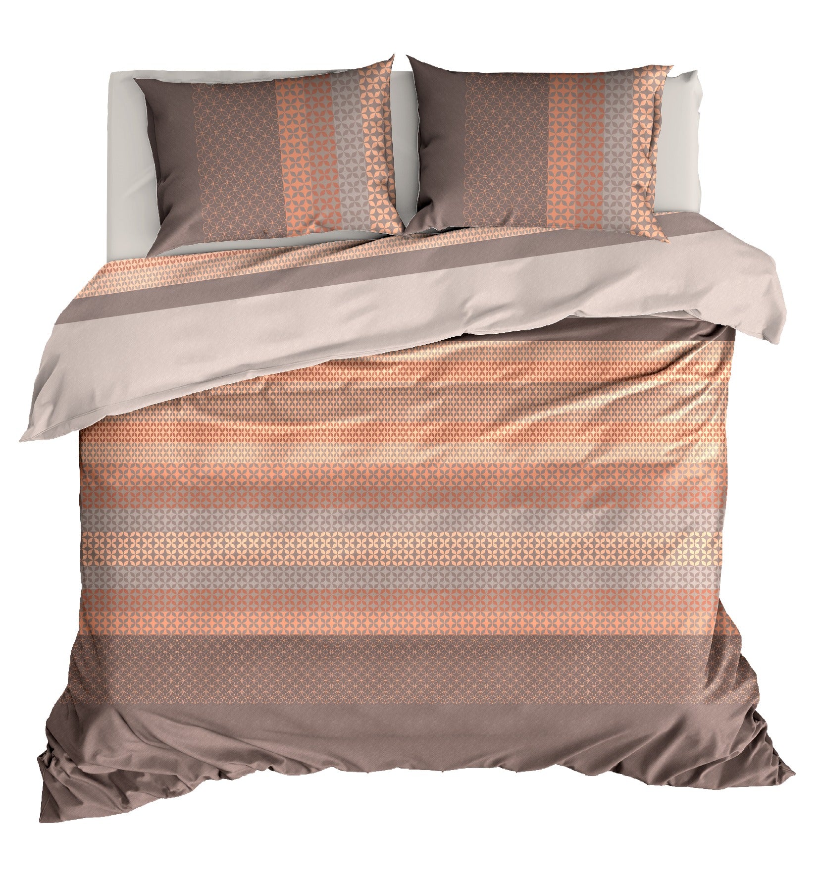 Dekbedovertrek Kirana Terra van Livello is gemaakt van 100% katoen kwaliteit. Het dekbedovertrek heeft een terra kleur en bestaat uit verschillende horizontale banen met verschillende motieven op zowel de voor- als achterkant van het overtrek. De motieven staan ook in verticale banen op het kussensloop.
