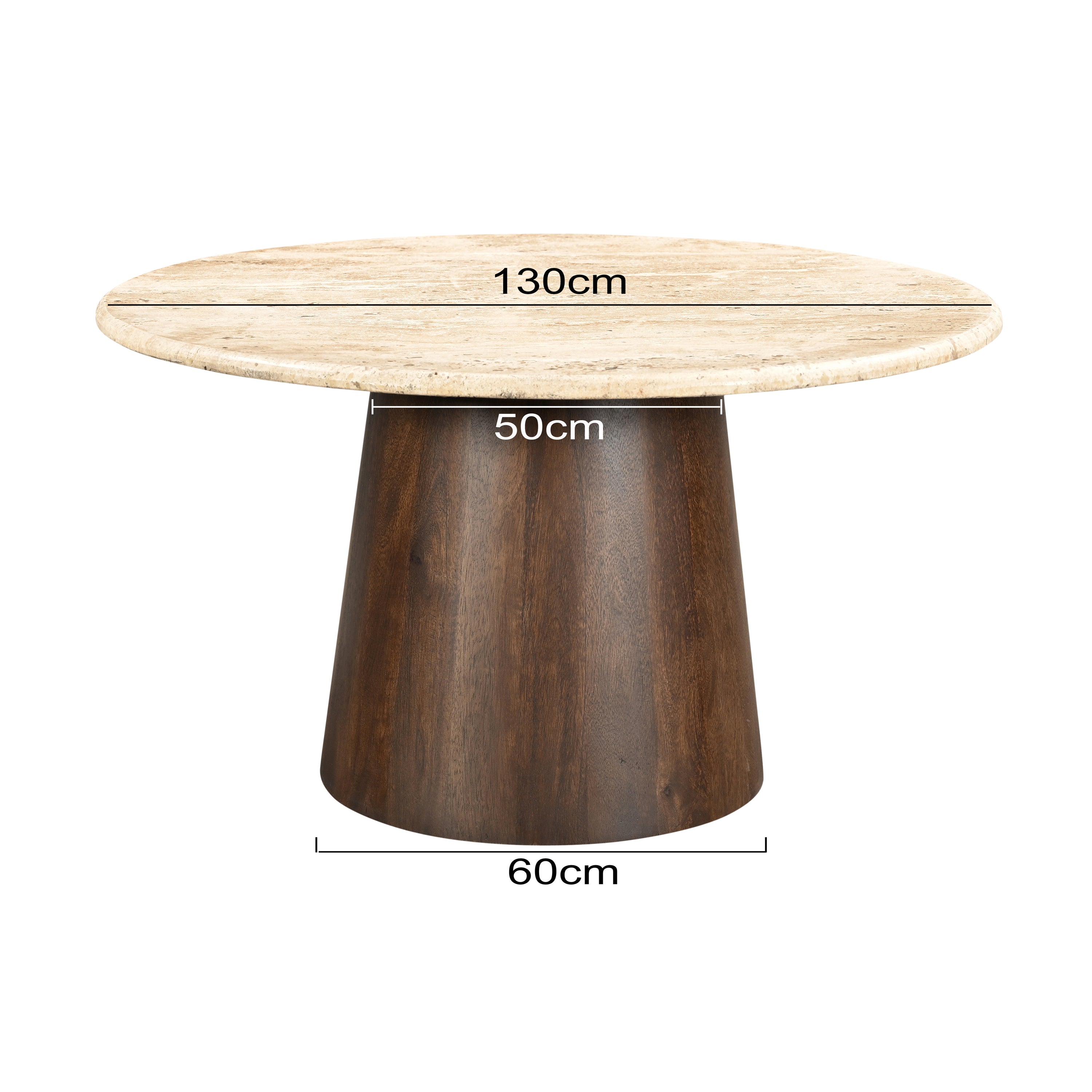 De belangrijkste informatie op een rijtje: - Onderhoudstip: afnemen met een zachte vochtige doek - Gemaakt van hoogwaardig mangohout - Vorm: rond - Kleur: beige/ donkerbruin - Afmetingen: lengte 130, breedte 130 en hoogte 76cm - Aantal personen: 5