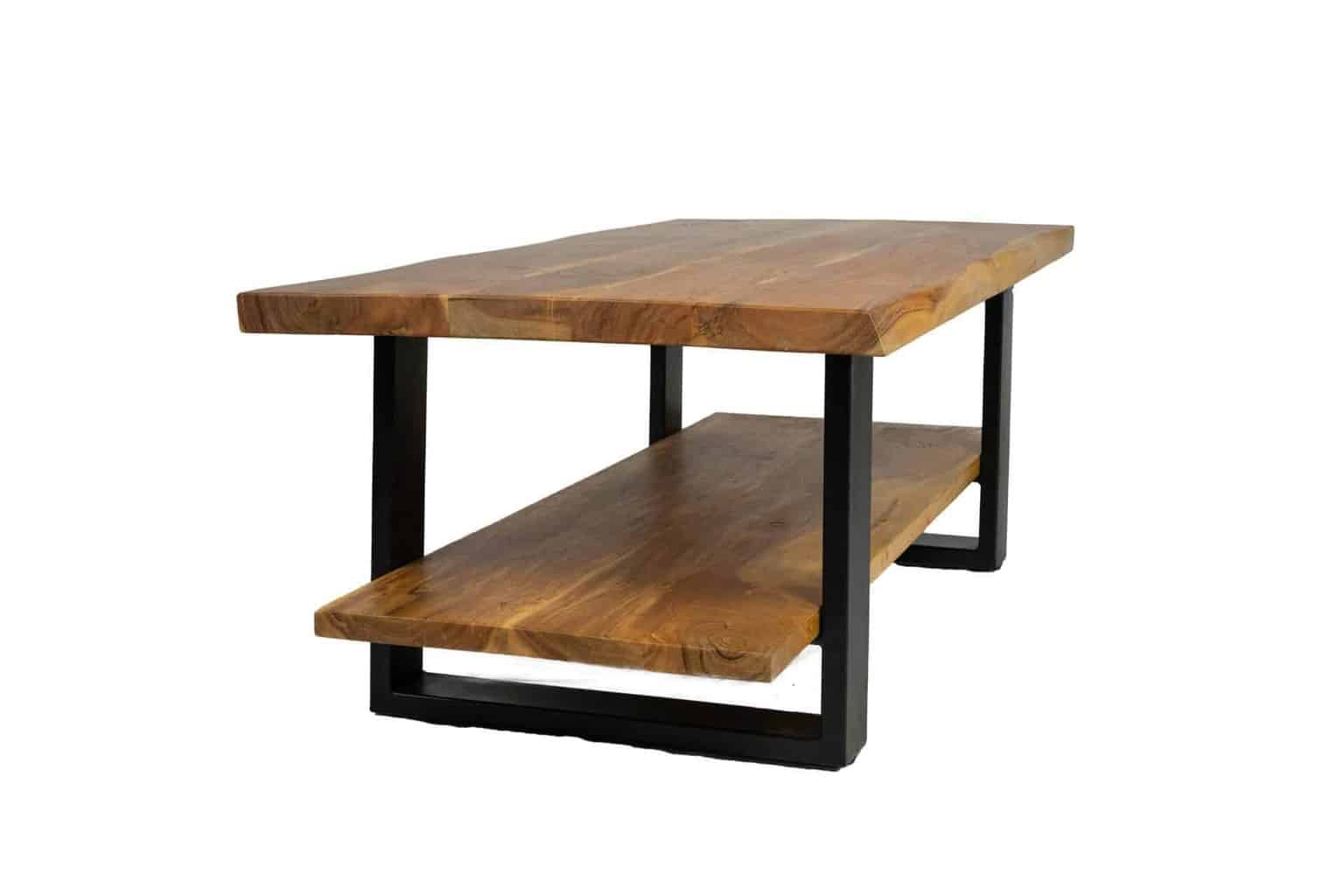 Deze industriële salontafel heeft zachte en vriendelijke vormen, maar wel een stoere uitstraling door het materiaal dat voor deze tafel is gebruikt. De rechthoekige salontafel is voorzien van twee bladen, die gemaakt zijn van mangohout. De mangohouten bladen zijn één meter twintig lang en 60 centimeter (hoofdblad) en 44 centimeter (onderblad) breed. Het houten onderblad zorgt voor extra opbergruimte en dat maakt deze salontafel erg functioneel. Het ranke frame bestaat volledig uit metaal en is afgewerkt met een fijne zwarte poedercoating. De robuuste uitstraling en het stoere metalen onderstel maken de salontafel Cova een interessant interieurartikel voor in huis.