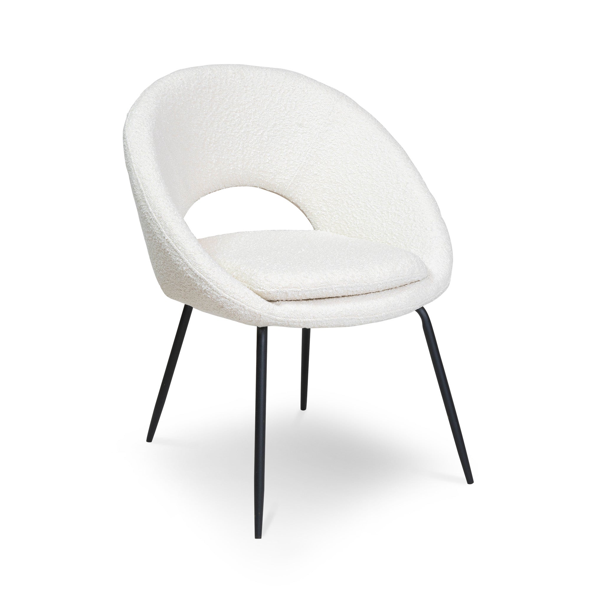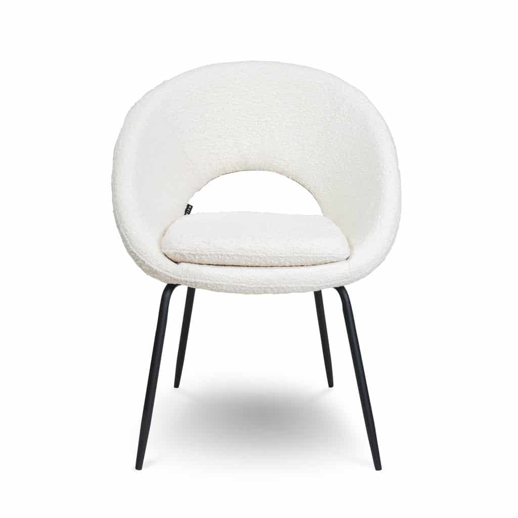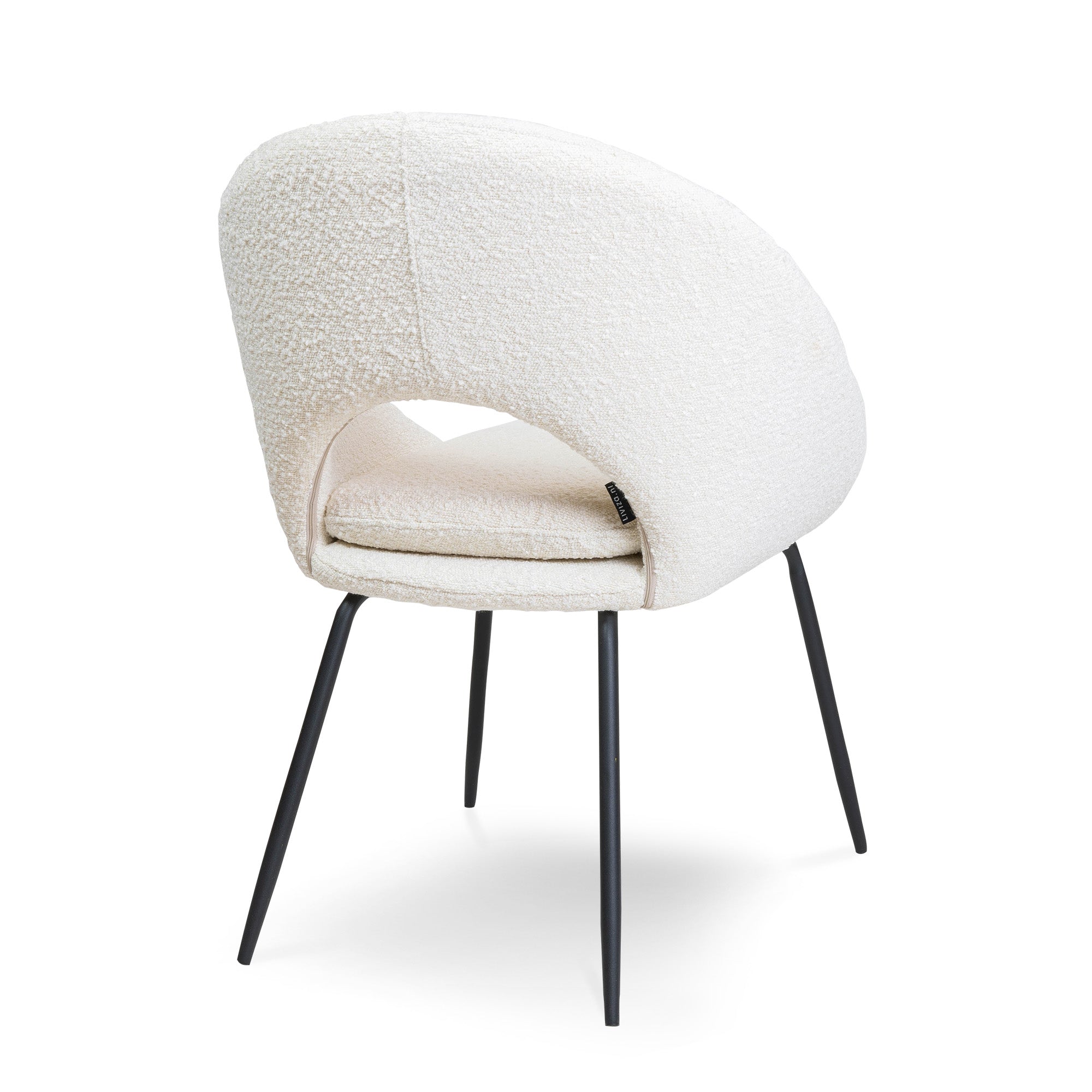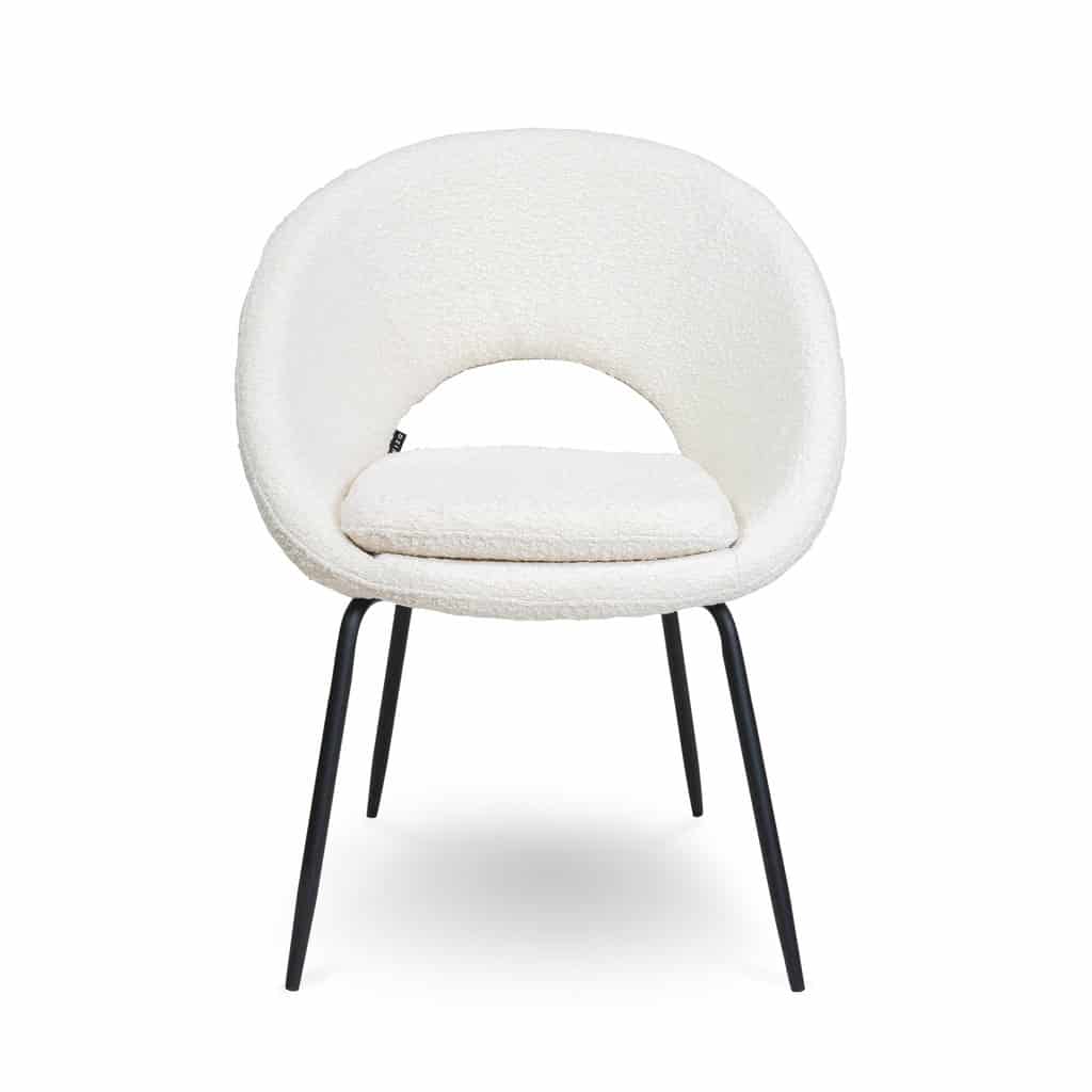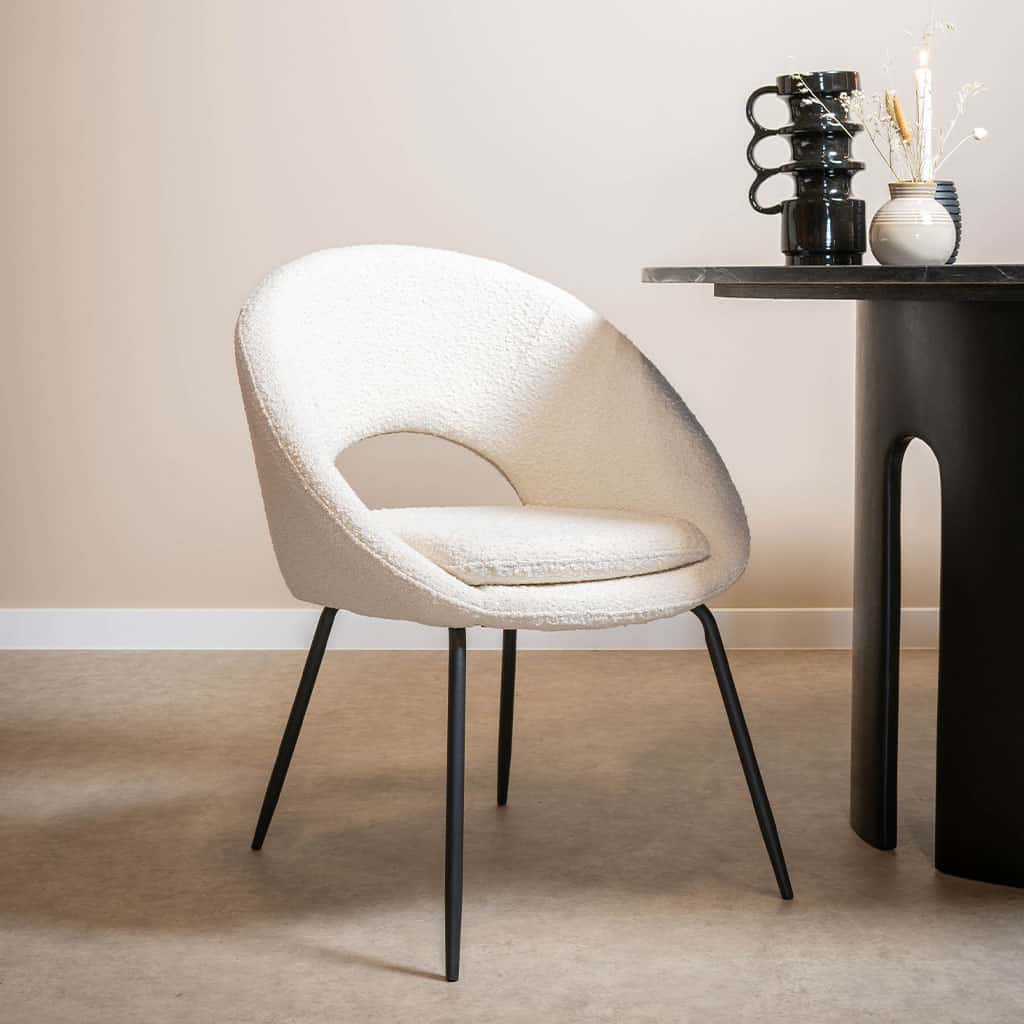 Urenlang tafelen met de Liviza eetkamerstoel Mazo wit. De witte teddy eetkamerstoel is bekleed met bouclé stof en heeft een comfortabele hoge rugleuning. Doordat de rugleuning van de eetkamerstoel iets rond doorloopt voelt dit stevig aan in jouw rug. De bouclé stof maakt dat stoel Mazo wit extra comfortabel is. De poten van deze teddy eetkamerstoel moeten nog gemonteerd worden, maar dat is eenvoudig en gemakkelijk gedaan. De combinatie van bouclé stof en de zwarte wijd staande stalen poten zorgt ervoor dat Liviza stoel Mazo wit een luchtige en moderne toevoeging aan je woonkamer is.