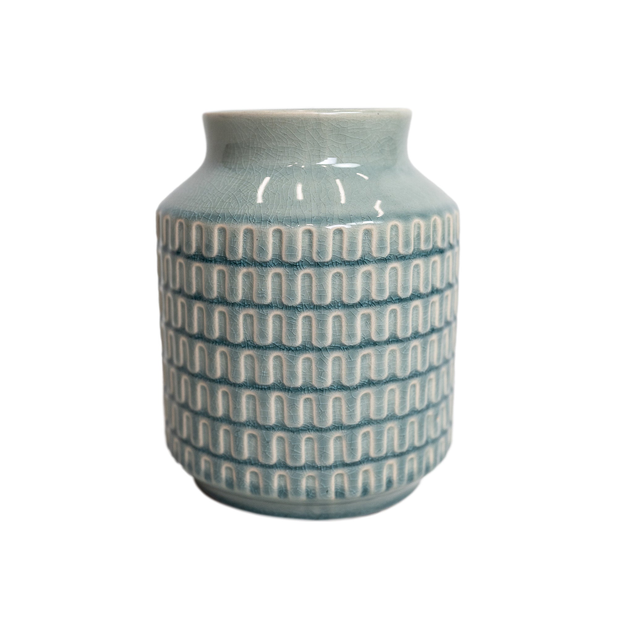Specificaties • Afmeting: 17,5 cm hoog • Materiaal: Keramiek • Kenmerk: Golvend patroon • Kleur: Lichtblauw