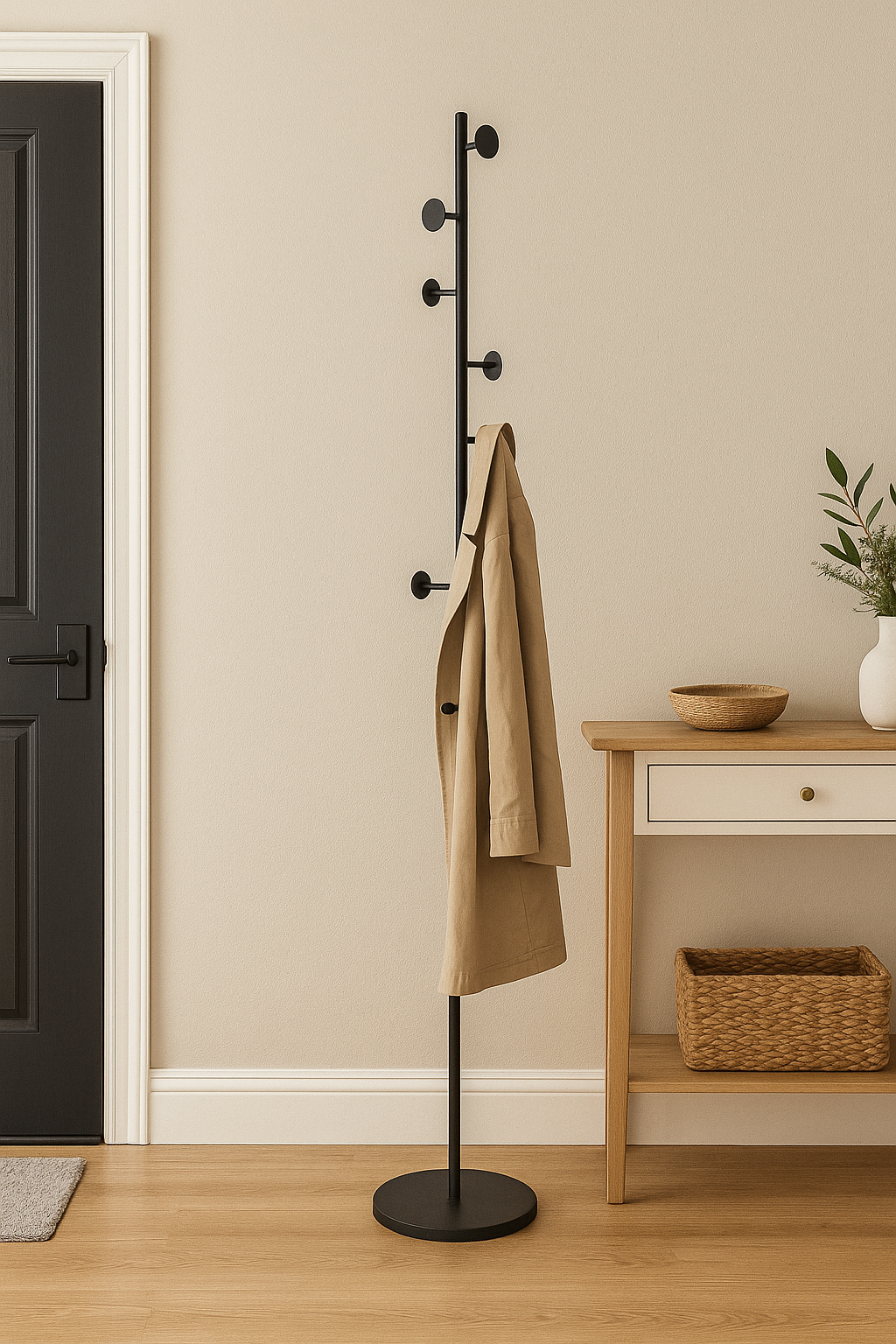 Deze stijlvolle kapstok is meer dan alleen praktisch — het is een design statement. De matte zwarte kleur en het minimalistische silhouet brengen rust, balans en moderniteit in elk interieur.