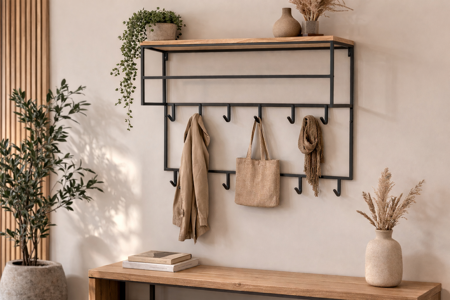 Breng stijl en functionaliteit samen in je hal met deze industriële wandkapstok met houten plank. De combinatie van een stevig zwart metalen frame en een warme houten plank zorgt voor een moderne uitstraling die perfect past in een industrieel, Japandi of Scandinavisch interieur.