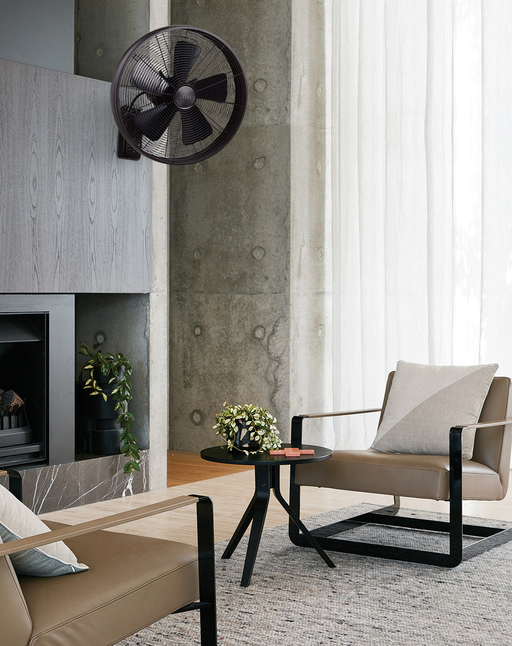 Wandventilator Breeze van het designmerk Lucci air in de kleur. Hij is te bedienen met de bijgeleverde afstandsbediening of direct op de houder. De stalen behuizing van de ventilator heeft een diameter van 46cm.