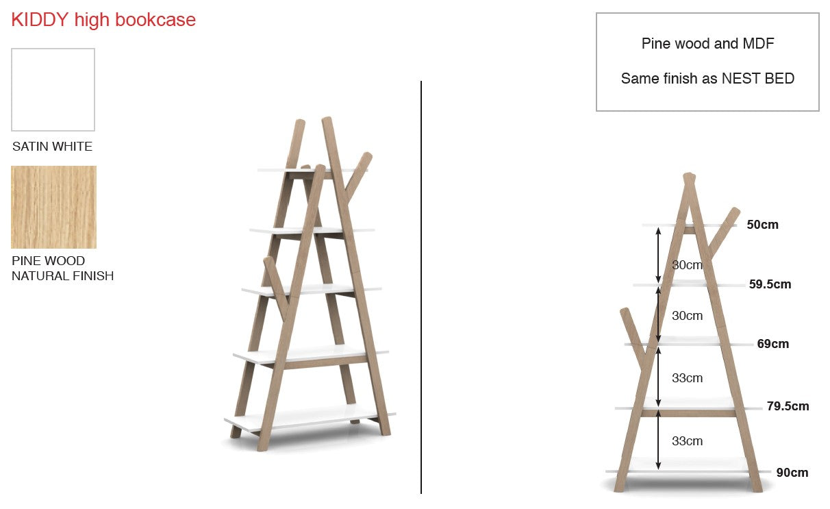 Deze KIDDY boekenkast in de vorm van een tipi heeft een Scandinavische stijl door de combinatie van strakke witte plankjes in gelakte MDF en de natuurkleurige afwerking in massieve den. Dit speelse en functionele design past in elk interieur. Ontdek de belangrijkste kenmerken van dit product in onderstaande punten: