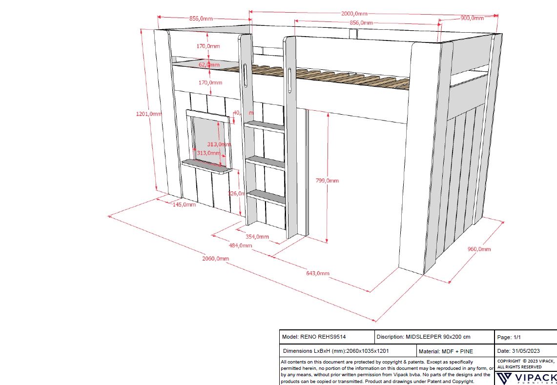 De RENO halfhoogslaper (90 x 200 cm) in wit is vervaardigd uit hoogwaardig gelakte MDF. De ruimte onder het bed is multifunctioneel en kan ingericht worden als speel- of leeshoek of gebruikt worden als opbergruimte. Het open raam geeft het bed een speelse uitstraling. Ontdek de belangrijkste kenmerken van dit product in onderstaande punten: