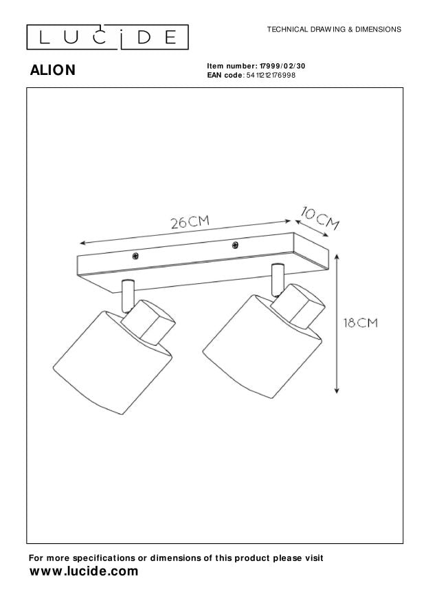 Zoek je plafondspots met net dat ietsje meer? Dan is Alion de ideale keuze. Deze plafondlamp met twee lichtpunten is 18 centimeter hoog, met een rechthoekig, metalen plafondplaat van 26 op 10 centimeter. De lampenkappen bestaan uit fuméglas in een afgerond vierkant dat zich rond de twee lichtbronnen bevindt. Zo krijgt de klassieke vormgeving van Alion meteen een moderne toets. De plafondlamp is draai- en kantelbaar en sluit je eenvoudig aan op een dimmer. Het perfecte licht waar en waneer je het nodig hebt? Alion is er klaar voor. Unieke productkenmerken: • Geschikt voor toepassing met LED lichtbronnen • Deze lamp is draaibaar en kantelbaar • Eenvoudig aan te sluiten op een dimmer (excl.) • Vervaardigd uit hoogwaardig metaal Belangrijke productkenmerken: • Verbruik: 2x25W / 230V / Dimbaar (lichtbronnen niet inbegrepen) • Afmetingen: L.26 x B.10 x H.18 cm • 2 Jaar garantie op het armatuur / Passende lichtbron is EAN: 5411212491343 Waarom kiezen voor Lucide verlichting? Lucide staat voor trendsettend design, vakmanschap en betrouwbaarheid. Als Belgisch familiebedrijf met ruim drie decennia aan expertise ontwerpen wij hoogwaardige verlichting die elke ruimte – binnen én buiten – verrijkt en transformeert. Onze veelzijdige collectie omvat duurzame armaturen en energiezuinige lichtbronnen, zorgvuldig ontworpen door onze eigen experts en geproduceerd volgens de strengste CE-normen. Met ons uitgebreide assortiment bieden we jou altijd een geschikte lichtoplossing, ongeacht stijl of ruimte. Zo verlichten we niet enkel jouw leefruimte maar ook jouw keuzeproces in de zoektocht naar kwalitatieve betaalbare verlichting. Bij Lucide combineren we innovatie met vakmanschap, voor verlichting die niet alleen sfeer toevoegt, maar van ieder huis een thuis maakt.