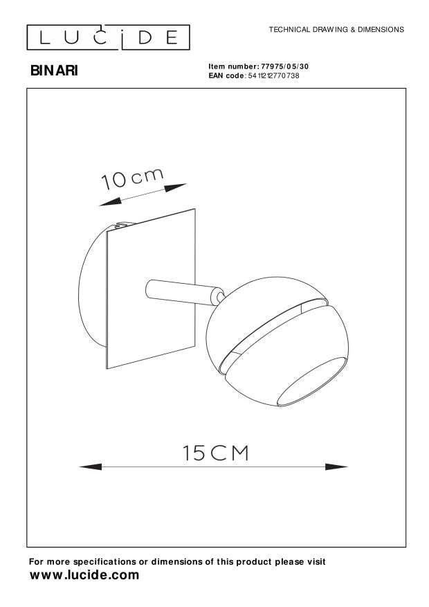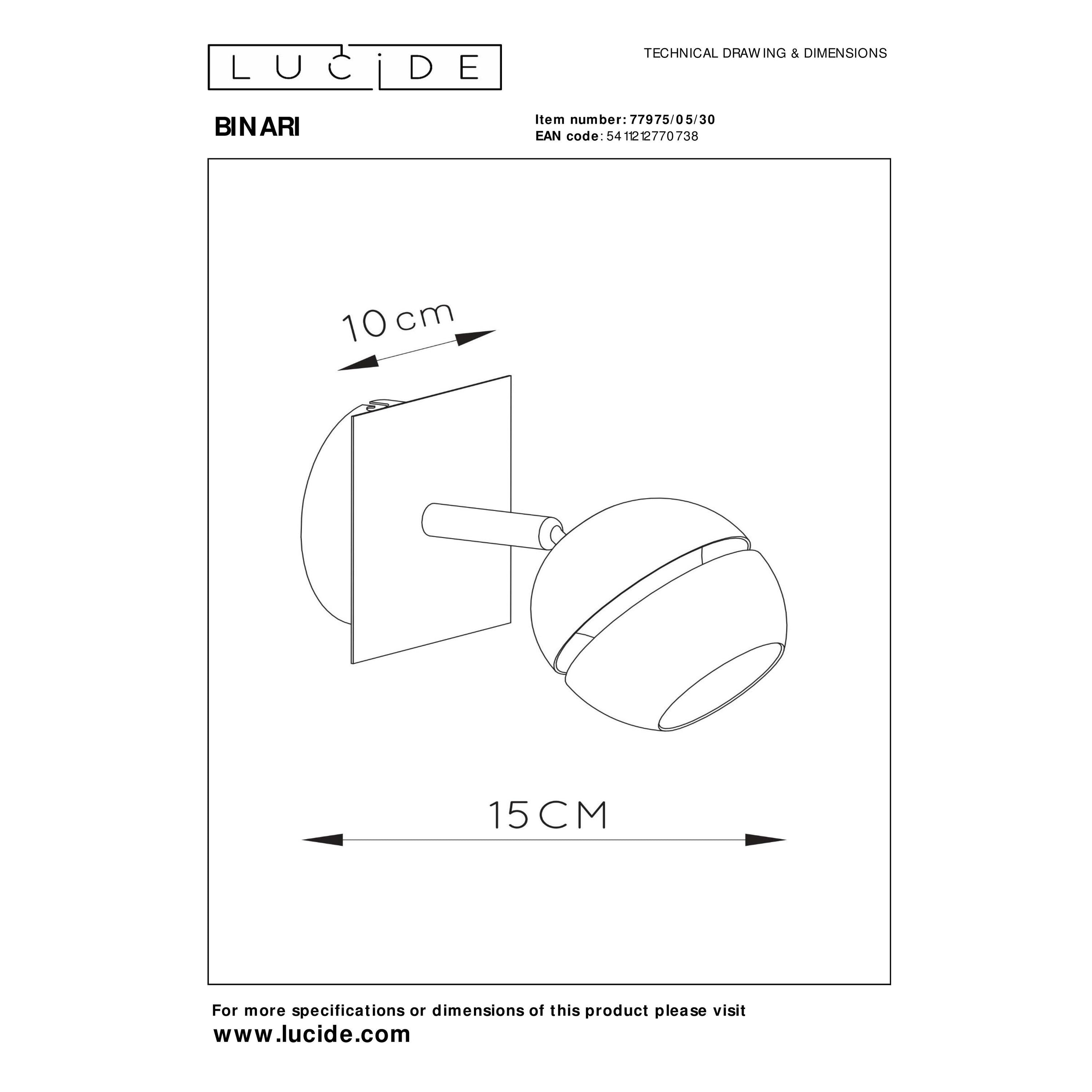Een wand- of plafondspot. Noem Binari wat je wil. Sowieso geeft deze topper wat je wil: klasse aan je woning. Als wandspot krijgen je muren een warme gloed over zich heen. Zet je hem in als plafondspot? Dan krijgt je interieur de aandacht die het verdient. Energiezuinige spotlampen zijn de toekomst. Daar werkt Binari met een geïntegreerde led-lichtbron graag aan mee. Deze multifunctionele lamp heeft aan 10 centimeter genoeg om zijn klasse te tonen. De Binari-familie is uitgebreid. In het gamma van Lucide vind je veel verschillende uitvoeringen van deze topper. Unieke productkenmerken: • Uitgerust met geïntegreerde LED lamp • Uitgerust met warm wit licht (2700K) • Deze lamp is draaibaar en kantelbaar • Eenvoudig aan te sluiten op een wandschakelaar (excl.) • Vervaardigd uit hoogwaardig metaal Belangrijke productkenmerken: • Verbruik: 1x4,5W / 230V / (incl.) • Afmetingen: L.10 x B.15 x H.10 cm • 3 Jaar garantie op het armatuur Waarom Lucide verlichting kopen? Lucide ontwikkelt en produceert sinds haar oprichting in 1992 hoogwaardige en trend zettende lichtoplossingen. Deze 2 elementen zijn de basis voor het toonaangevend assortiment van het in Antwerpen gevestigde bedrijf. Een team van Lucide designers, aangevuld met freelance ontwerpers, ontwikkelen dagelijks tal van nieuwe producten. Innovatieve materiaalkeuze, vormgeving en kleurtoepassing in combinatie met de meest actuele lichttechnologie stelt Lucide daarbij continue centraal.