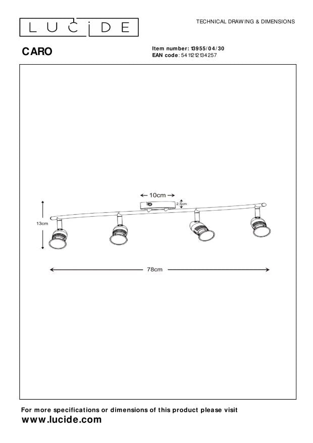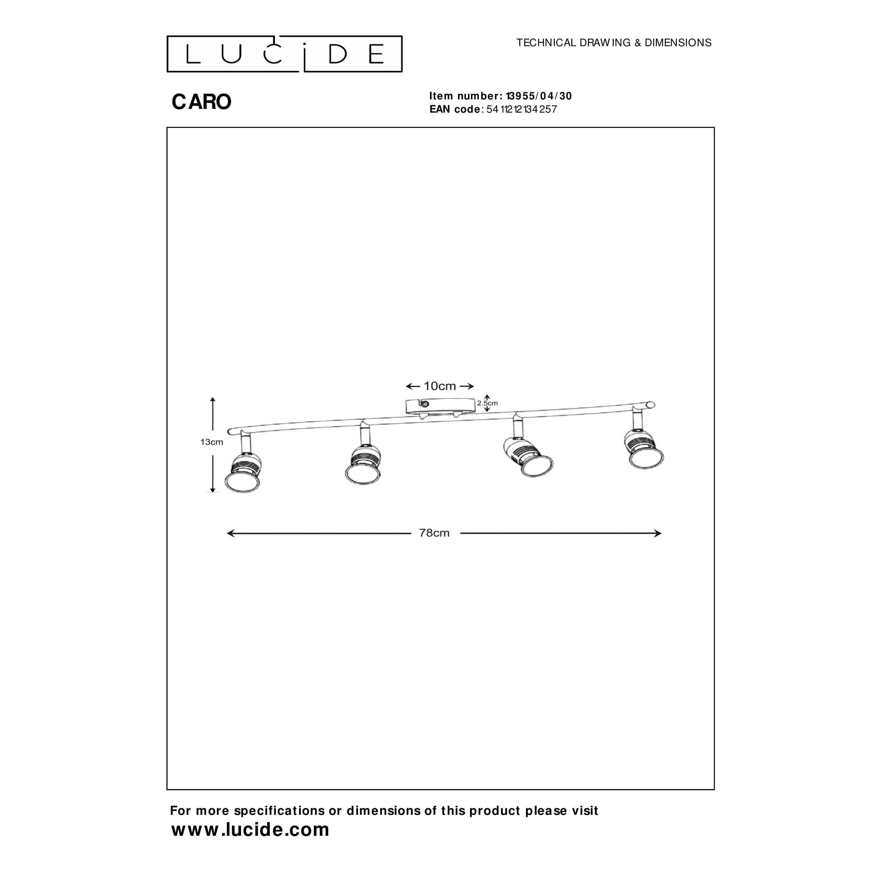 De Caro-spot is perfect voor iedereen onder ons die houdt van een minimalistische vormgeving. Deze strakke lamp valt hierdoor op natuurlijke wijze in jouw interieur te integreren. Unieke productkenmerken: • Geschikt voor toepassing met LED lichtbronnen • Deze lamp is draaibaar en kantelbaar • Eenvoudig aan te sluiten op een dimmer (excl.) • Vervaardigd uit hoogwaardig metaal Belangrijke productkenmerken: • Verbruik: 4x5W / 230V / Dimbaar (lichtbronnen niet inbegrepen) • Afmetingen: L.76 x B.9 x H.13 cm • 2 Jaar garantie op het armatuur / Passende lichtbron is EAN: 5411212490643 Waarom kiezen voor Lucide verlichting? Lucide staat voor trendsettend design, vakmanschap en betrouwbaarheid. Als Belgisch familiebedrijf met ruim drie decennia aan expertise ontwerpen wij hoogwaardige verlichting die elke ruimte – binnen én buiten – verrijkt en transformeert. Onze veelzijdige collectie omvat duurzame armaturen en energiezuinige lichtbronnen, zorgvuldig ontworpen door onze eigen experts en geproduceerd volgens de strengste CE-normen. Met ons uitgebreide assortiment bieden we jou altijd een geschikte lichtoplossing, ongeacht stijl of ruimte. Zo verlichten we niet enkel jouw leefruimte maar ook jouw keuzeproces in de zoektocht naar kwalitatieve betaalbare verlichting. Bij Lucide combineren we innovatie met vakmanschap, voor verlichting die niet alleen sfeer toevoegt, maar van ieder huis een thuis maakt.