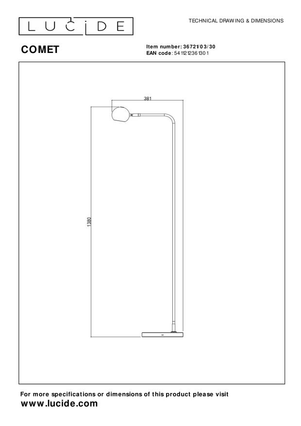 Met Comet kies je voor stijl en verantwoordelijkheid. Deze discrete oplaadbare vloerlamp is een schitterende aanvulling in elk interieur. Vervaardigd uit hoogwaardig metaal bevat deze staande lamp een geïntegreerde dimbare ledlichtbron met een warme kleur. Studeren, lezen of gezellig tafelen? Met Comet creëer je steeds de juiste sfeer bij elke activiteit. De duurzame lichtbron maakt Comet bovendien uiterst energie-efficiënt. Zijn tijdloze karakter past zich overal aan en voegt een vleugje elegantie toe aan je woning. Comet is 138 centimeter hoog. Unieke productkenmerken: • Uitgerust met geïntegreerde dimbare LED lamp • Uitgerust met warm wit licht (2700K) • Deze lamp is kantelbaar (verticaal) • Vervaardigd uit hoogwaardig metaal Belangrijke productkenmerken: • Werkt op een hoogwaardige accu (tot wel 8 branduren op maximaal wattage) • Verbruik: 1x3W / 230V / Dimbaar (Lichtbron inbegrepen) • Afmetingen: L.38,1 x B.22 x H.138 cm • 3 Jaar garantie op het armatuur Waarom kiezen voor Lucide verlichting? Lucide staat voor trendsettend design, vakmanschap en betrouwbaarheid. Als Belgisch familiebedrijf met ruim drie decennia aan expertise ontwerpen wij hoogwaardige verlichting die elke ruimte – binnen én buiten – verrijkt en transformeert. Onze veelzijdige collectie omvat duurzame armaturen en energiezuinige lichtbronnen, zorgvuldig ontworpen door onze eigen experts en geproduceerd volgens de strengste CE-normen. Met ons uitgebreide assortiment bieden we jou altijd een geschikte lichtoplossing, ongeacht stijl of ruimte. Zo verlichten we niet enkel jouw leefruimte maar ook jouw keuzeproces in de zoektocht naar kwalitatieve betaalbare verlichting. Bij Lucide combineren we innovatie met vakmanschap, voor verlichting die niet alleen sfeer toevoegt, maar van ieder huis een thuis maakt.