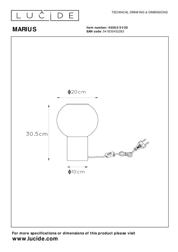 Licht mag gezien worden. Althans als Marius het vasthoudt. Deze speelse tafellamp blinkt uit door eenvoud. Met een compacte cilindervormige sokkel uit metaal en een glazen fumé lampenkap doet Marius het goed op de commode, aan het bureau, op de salontafel of zelfs het nachtkastje. Deze schemerlamp knip je snel aan en uit door de schakelaar op het snoer. Marius is iets hoger dan 32 centimeter en is 20 centimeter breed. Deze tafelverlichting combineer je makkelijk met retro accenten in je interieur voor een stijlvol totaalplaatje. Unieke productkenmerken: • Geschikt voor toepassing met LED lichtbron • Bedienbaar via aan/uit schakelaar in het snoer • Vervaardigd uit hoogwaardig glas Belangrijke productkenmerken: • Verbruik: 1x40W / 220V / (lichtbron niet inbegrepen) • Afmetingen: Ø20 cm \ H.32,5 cm • 2 Jaar garantie op het armatuur / Passende lichtbron is EAN: 5411212491046 Waarom kiezen voor Lucide verlichting? Lucide staat voor trendsettend design, vakmanschap en betrouwbaarheid. Als Belgisch familiebedrijf met ruim drie decennia aan expertise ontwerpen wij hoogwaardige verlichting die elke ruimte – binnen én buiten – verrijkt en transformeert. Onze veelzijdige collectie omvat duurzame armaturen en energiezuinige lichtbronnen, zorgvuldig ontworpen door onze eigen experts en geproduceerd volgens de strengste CE-normen. Met ons uitgebreide assortiment bieden we jou altijd een geschikte lichtoplossing, ongeacht stijl of ruimte. Zo verlichten we niet enkel jouw leefruimte maar ook jouw keuzeproces in de zoektocht naar kwalitatieve betaalbare verlichting. Bij Lucide combineren we innovatie met vakmanschap, voor verlichting die niet alleen sfeer toevoegt, maar van ieder huis een thuis maakt.