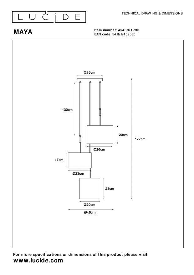 Een spel van 3 hedendaagse, katoenen lampenkapjes op verschillende niveaus: Maya weet de blik van je bezoek te vangen met zijn speelse karakter en diffuse licht. Het katoenen koord van de hanglamp is in hoogte verstelbaar tot 177 centimeter. Maya heeft een diameter van 46 centimeter en is daarmee de perfecte eyecatcher in een grote hal, maar even goed in een intiem hoekje in je woonkamer of slaapkamer. Een externe dimmer maakt het plaatje compleet. Deze moderne pendellamp is geschikt voor ledlichtbronnen. Unieke productkenmerken: • Geschikt voor toepassing met LED lichtbronnen • Deze lamp is in hoogte verstelbaar • Eenvoudig aan te sluiten op een dimmer (excl.) • Vervaardigd uit hoogwaardig katoen Belangrijke productkenmerken: • Verbruik: 3x40W / 230V / Dimbaar (lichtbronnen niet inbegrepen) • Afmetingen: Ø46 cm \ H.177 cm • 2 Jaar garantie op het armatuur / Passende lichtbron is EAN: 5411212491152 Waarom kiezen voor Lucide verlichting? Lucide staat voor trendsettend design, vakmanschap en betrouwbaarheid. Als Belgisch familiebedrijf met ruim drie decennia aan expertise ontwerpen wij hoogwaardige verlichting die elke ruimte – binnen én buiten – verrijkt en transformeert. Onze veelzijdige collectie omvat duurzame armaturen en energiezuinige lichtbronnen, zorgvuldig ontworpen door onze eigen experts en geproduceerd volgens de strengste CE-normen. Met ons uitgebreide assortiment bieden we jou altijd een geschikte lichtoplossing, ongeacht stijl of ruimte. Zo verlichten we niet enkel jouw leefruimte maar ook jouw keuzeproces in de zoektocht naar kwalitatieve betaalbare verlichting. Bij Lucide combineren we innovatie met vakmanschap, voor verlichting die niet alleen sfeer toevoegt, maar van ieder huis een thuis maakt.