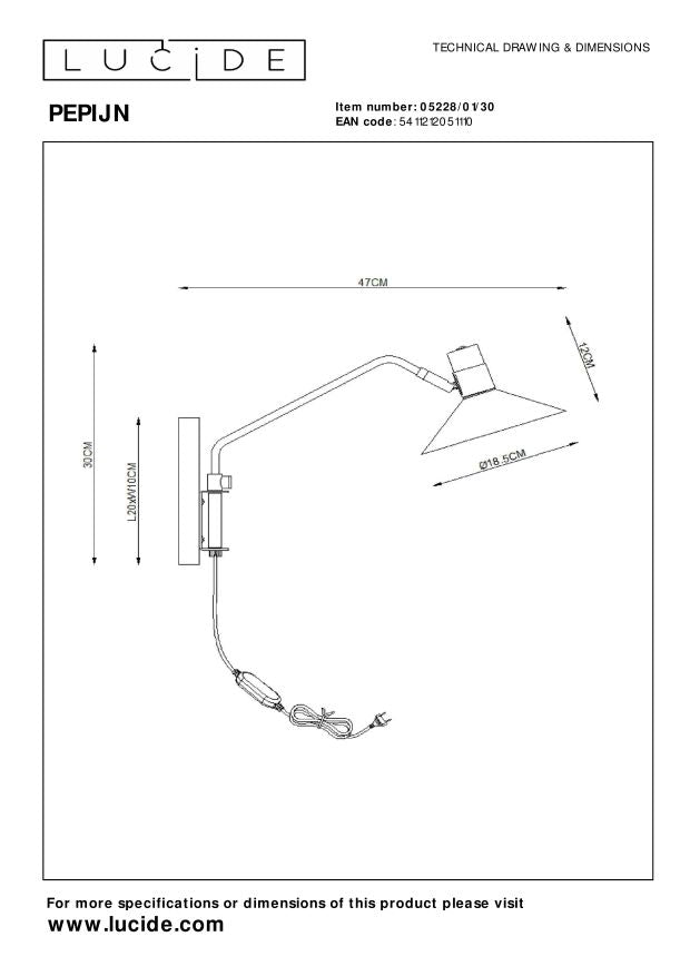 Pepijn, de naam klinkt even vrolijk als het ontwerp van deze wandlamp. De moderne vormgeving combineert zwart staal met messing. Zo brengt Pepijn niet enkel licht, maar ook extra veel warmte in je ruimte. Deze wandlamp voelt zich thuis in hedendaagse interieurs. Pepijn is een blikvanger in strakke woonkamers. Met een breedte van 47 centimeter en een hoogte van 30 centimeter past hij ook in een gang, of zelfs in de slaapkamer als nachtlamp. Je hebt voor Pepijn wel een stopcontact nodig want je schakelt deze wandlamp aan en uit met de schakelaar in het snoer. Unieke productkenmerken: • Geschikt voor toepassing met LED lichtbron • Deze lamp is draaibaar en kantelbaar • Vervaardigd uit hoogwaardig staal Belangrijke productkenmerken: • Verbruik: 1x40W / 230V / Dimbaar (lichtbron niet inbegrepen) • Afmetingen: L.18,5 x B.47 x H.30 cm • 2 Jaar garantie op het armatuur / Passende lichtbron is EAN: 5411212491343 Waarom kiezen voor Lucide verlichting? Lucide staat voor trendsettend design, vakmanschap en betrouwbaarheid. Als Belgisch familiebedrijf met ruim drie decennia aan expertise ontwerpen wij hoogwaardige verlichting die elke ruimte – binnen én buiten – verrijkt en transformeert. Onze veelzijdige collectie omvat duurzame armaturen en energiezuinige lichtbronnen, zorgvuldig ontworpen door onze eigen experts en geproduceerd volgens de strengste CE-normen. Met ons uitgebreide assortiment bieden we jou altijd een geschikte lichtoplossing, ongeacht stijl of ruimte. Zo verlichten we niet enkel jouw leefruimte maar ook jouw keuzeproces in de zoektocht naar kwalitatieve betaalbare verlichting. Bij Lucide combineren we innovatie met vakmanschap, voor verlichting die niet alleen sfeer toevoegt, maar van ieder huis een thuis maakt.