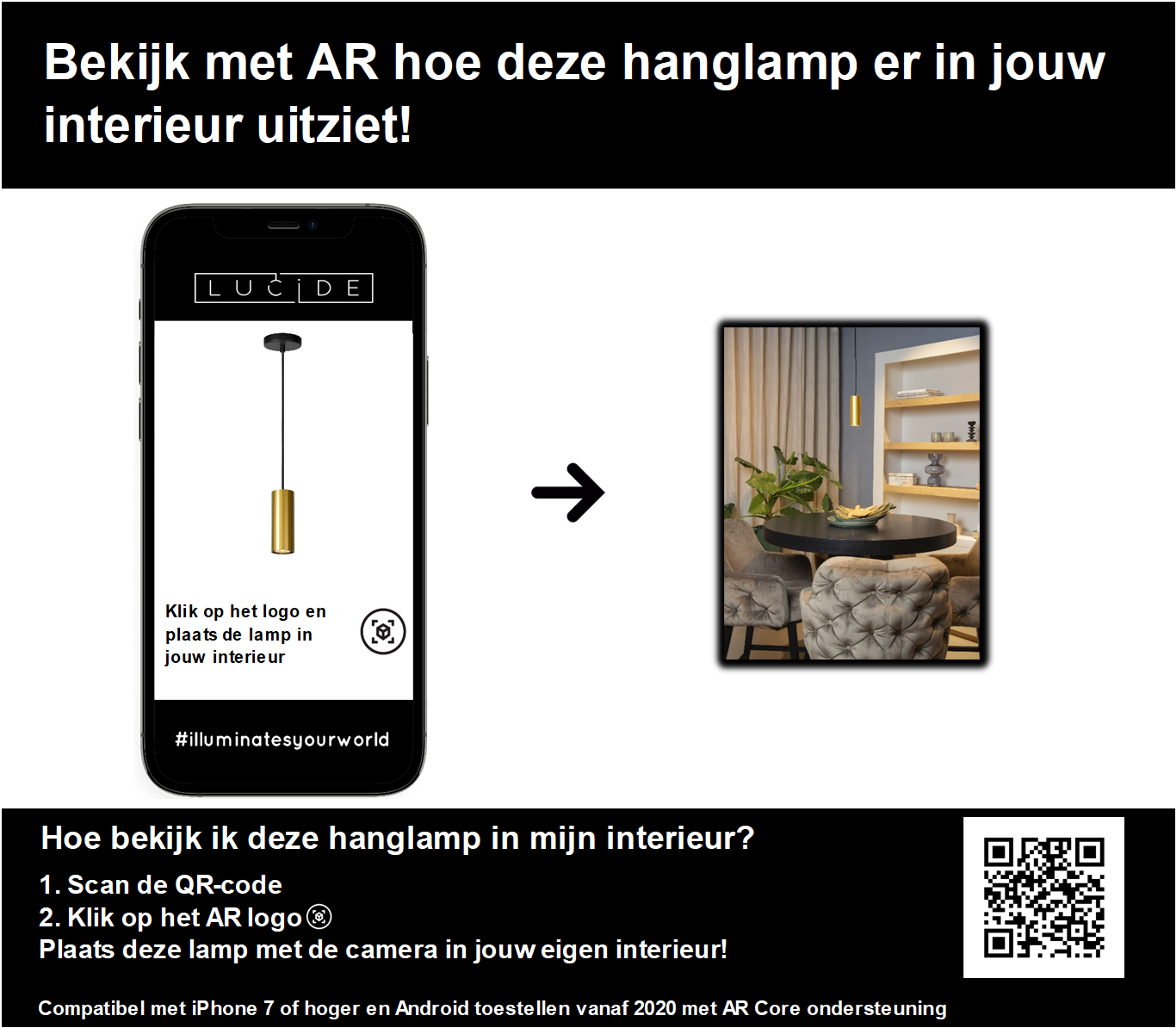 Richt de camera van je mobiele telefoon of tablet op de QR-code. Klik de link aan die in beeld verschijnt en het product wordt virtueel in je eigen huis geplaatst. Zo weet je zeker of het bij je past.