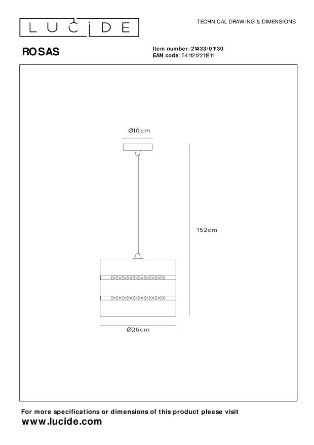 Honingzoet? Met Rosas kan je de heerlijke geur van honing bijna ruiken. Deze hanglamp doet wat denken aan een elegante bijenkorf, haar uitstraling is ronduit fenomenaal. Rosas heeft een diameter van 26 centimeter, is in hoogte verstelbaar en eenvoudig aan te sluiten op een dimmer. Zo bepaal je helemaal zelf in welke ruimte ze komt te hangen en welke sfeer je er creëert. Haal de pracht van moeder natuur in huis en ga voor een ongeziene gezelligheid. Unieke productkenmerken: • Geschikt voor toepassing met LED lichtbron • Deze lamp is in hoogte verstelbaar • Eenvoudig aan te sluiten op een dimmer (excl.) • Vervaardigd uit hoogwaardig metaal Belangrijke productkenmerken: • Verbruik: 1x40W / 230V / Dimbaar (lichtbron niet inbegrepen) • Afmetingen: Ø26 cm \ H.152 cm • 2 Jaar garantie op het armatuur / Passende lichtbron is EAN: 5411212491046 Waarom kiezen voor Lucide verlichting? Lucide staat voor trendsettend design, vakmanschap en betrouwbaarheid. Als Belgisch familiebedrijf met ruim drie decennia aan expertise ontwerpen wij hoogwaardige verlichting die elke ruimte – binnen én buiten – verrijkt en transformeert. Onze veelzijdige collectie omvat duurzame armaturen en energiezuinige lichtbronnen, zorgvuldig ontworpen door onze eigen experts en geproduceerd volgens de strengste CE-normen. Met ons uitgebreide assortiment bieden we jou altijd een geschikte lichtoplossing, ongeacht stijl of ruimte. Zo verlichten we niet enkel jouw leefruimte maar ook jouw keuzeproces in de zoektocht naar kwalitatieve betaalbare verlichting. Bij Lucide combineren we innovatie met vakmanschap, voor verlichting die niet alleen sfeer toevoegt, maar van ieder huis een thuis maakt.