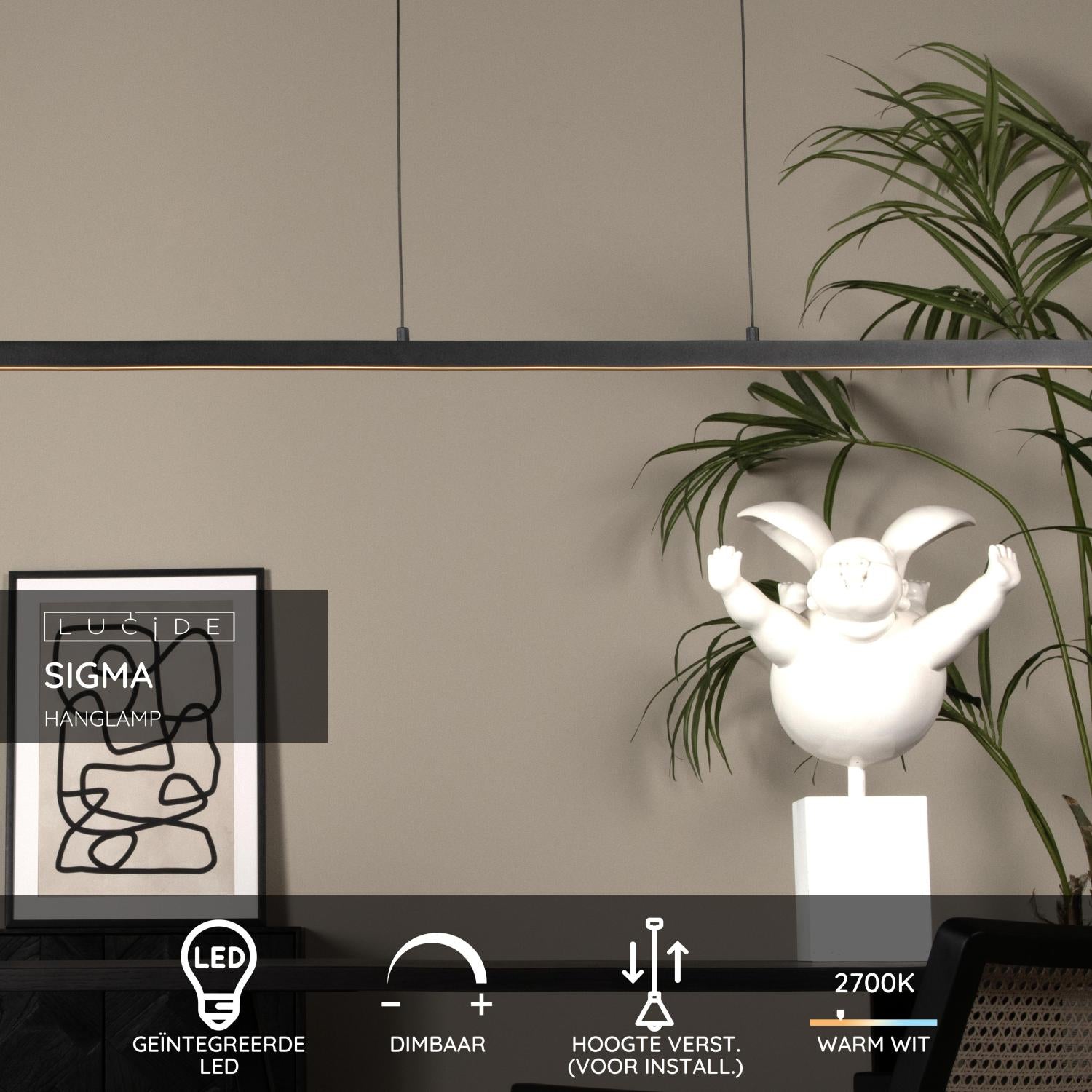 De tijdloze elegantie van hanglamp Sigma vormt een rustpunt in je interieur. Door zijn minimalistische uitvoering in strak aluminium is deze pendellamp grandioos in zijn eenvoud. De ideale sfeermaker aan de tafel in je eetruimte, boven een uitgestrekt keukeneiland of voor de waaghals aan een lange bureautafel. Uitgerust met een geïntegreerde dimbare ledlamp pas je de lichtsterkte van Sigma moeiteloos aan. De luchter kan naar wens geïnstalleerd worden tot een maximale hoogte van 200 centimeter. Sigma is net geen 148 centimeter lang en iets meer dan 8 centimeter breed. Unieke productkenmerken: • Uitgerust met geïntegreerde dimbare LED lamp • Uitgerust met warm wit licht (2700K) • Deze lamp is in hoogte verstelbaar • Eenvoudig aan te sluiten op een dimmer (excl.) • Vervaardigd uit hoogwaardig metaal Belangrijke productkenmerken: • Verbruik: 1x36W / 230V / Dimbaar (Lichtbron inbegrepen) • Afmetingen: L.147,7 x B.8,2 x H.150 cm • 3 Jaar garantie op het armatuur Waarom kiezen voor Lucide verlichting? Lucide staat voor trendsettend design, vakmanschap en betrouwbaarheid. Als Belgisch familiebedrijf met ruim drie decennia aan expertise ontwerpen wij hoogwaardige verlichting die elke ruimte – binnen én buiten – verrijkt en transformeert. Onze veelzijdige collectie omvat duurzame armaturen en energiezuinige lichtbronnen, zorgvuldig ontworpen door onze eigen experts en geproduceerd volgens de strengste CE-normen. Met ons uitgebreide assortiment bieden we jou altijd een geschikte lichtoplossing, ongeacht stijl of ruimte. Zo verlichten we niet enkel jouw leefruimte maar ook jouw keuzeproces in de zoektocht naar kwalitatieve betaalbare verlichting. Bij Lucide combineren we innovatie met vakmanschap, voor verlichting die niet alleen sfeer toevoegt, maar van ieder huis een thuis maakt.