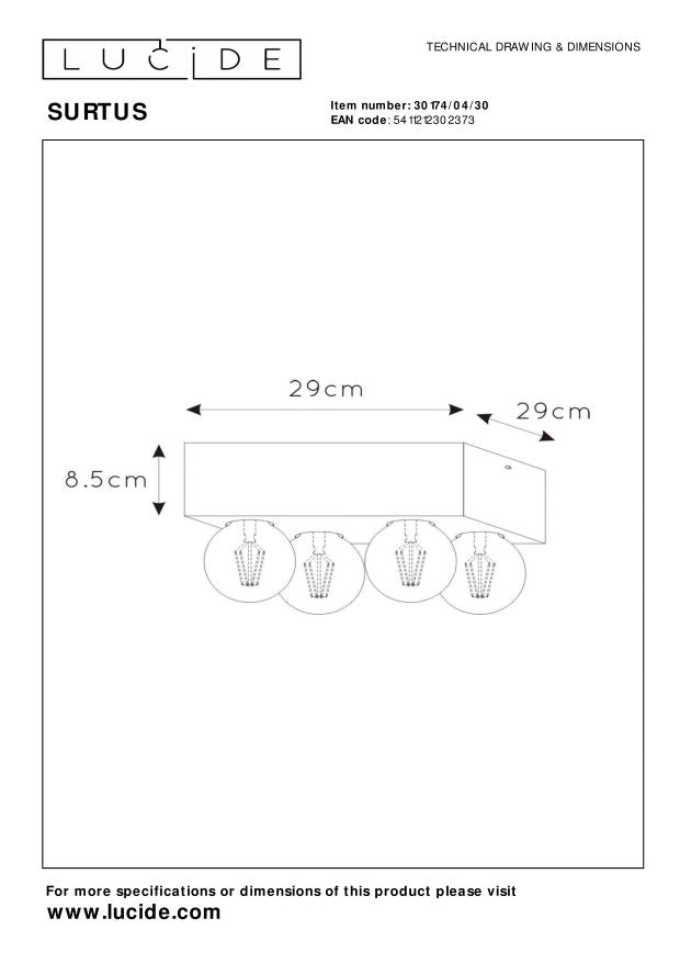 Met zijn vier lichtpunten brengt deze industriële plafonnière sfeervolle klasse in je interieur. De plafondlamp luistert naar de naam Surtus. De vier lichtpunten zijn gelijk verspreid over de strakke bevestigingsplaat. Surtus houdt niet van tierlantijntjes: de materialen en vormen spreken voor zich. Reden temeer om het ontwerp te combineren met filamentlampen. Zij krijgen alle ruimte om te schitteren en geven deze plafonnière een extra dimensie. Unieke productkenmerken: • Geschikt voor toepassing met LED lichtbronnen • Eenvoudig aan te sluiten op een dimmer (excl.) • Vervaardigd uit hoogwaardig staal Belangrijke productkenmerken: • Verbruik: 4x60W / 230V / Dimbaar (lichtbronnen niet inbegrepen) • Afmetingen: L.29 x B.29 x H.8,5 cm • 2 Jaar garantie op het armatuur / Passende lichtbron is EAN: 5411212491046 Waarom kiezen voor Lucide verlichting? Lucide staat voor trendsettend design, vakmanschap en betrouwbaarheid. Als Belgisch familiebedrijf met ruim drie decennia aan expertise ontwerpen wij hoogwaardige verlichting die elke ruimte – binnen én buiten – verrijkt en transformeert. Onze veelzijdige collectie omvat duurzame armaturen en energiezuinige lichtbronnen, zorgvuldig ontworpen door onze eigen experts en geproduceerd volgens de strengste CE-normen. Met ons uitgebreide assortiment bieden we jou altijd een geschikte lichtoplossing, ongeacht stijl of ruimte. Zo verlichten we niet enkel jouw leefruimte maar ook jouw keuzeproces in de zoektocht naar kwalitatieve betaalbare verlichting. Bij Lucide combineren we innovatie met vakmanschap, voor verlichting die niet alleen sfeer toevoegt, maar van ieder huis een thuis maakt.