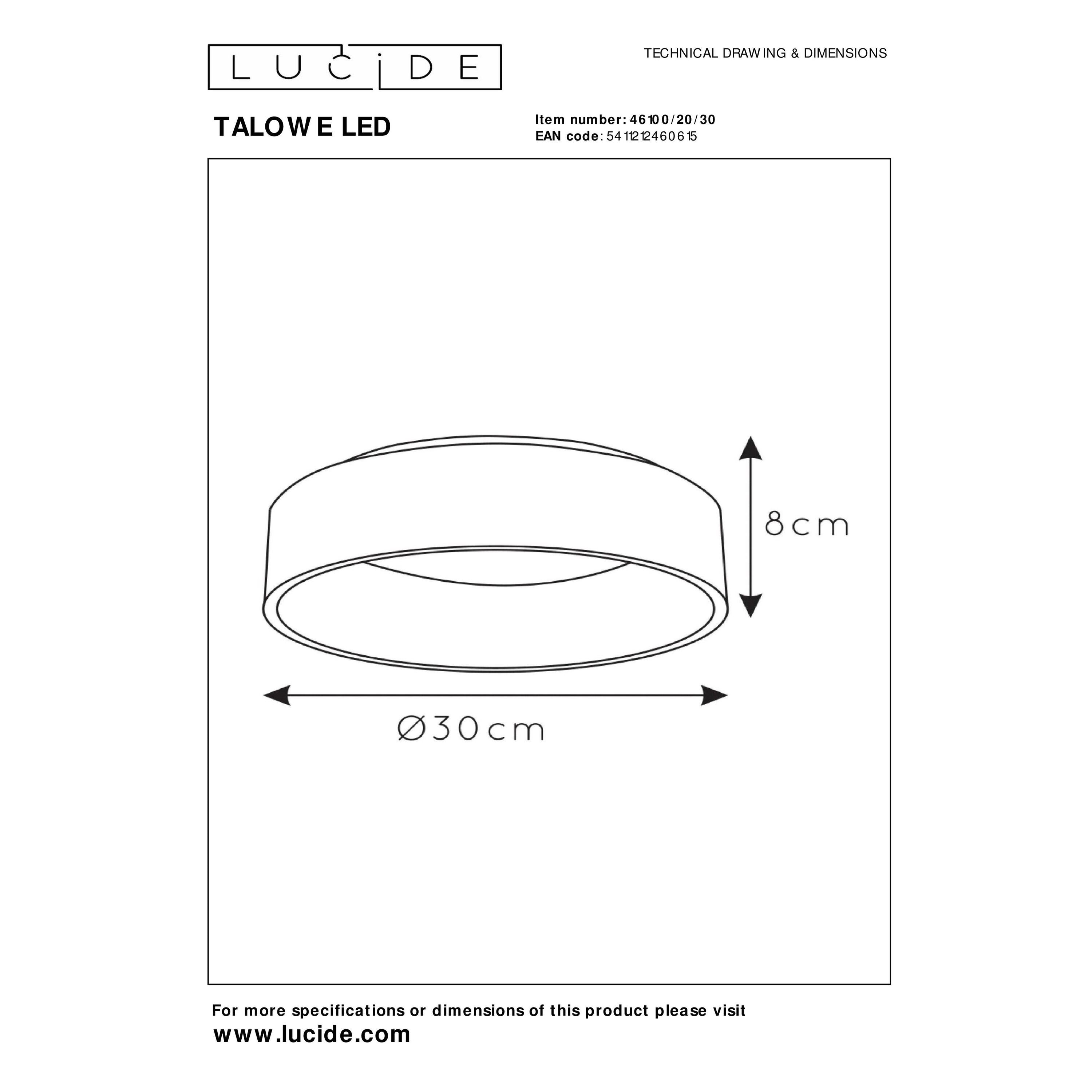 Een elegante en heldere plafondlamp voor een modern interieur. Deze Talowe LED lijkt een stijlicoon uit de jaren zestig, maar toont vooral dat hij tijdloos is. Dat heeft deze plafonniere te danken aan zijn mooie details en veelzijdig ontwerp. Het aluminium frame is robuust en bevat een doorschijnende diffuser in acryl. Daardoor geniet je in je gezellige leefruimte, hal of slaapkamer van warm wit licht dat mooi en evenwichtig in de ruimte verspreid wordt. Met 1800 lumen zie je ook 's nachts zoals bij klaarlichte dag. Dat de plafondlamp amper energie verbruikt, heeft hij dan weer te danken aan de geïntegreerde led-verlichting. En een vrijblijvende tip: als je het gezellig wil maken in je woonkamer voeg je simpelweg een dimmer toe. Unieke productkenmerken: • Uitgerust met geïntegreerde dimbare LED lamp • Uitgerust met warm wit licht (3000K) • Eenvoudig aan te sluiten op een dimmer (excl.) • Vervaardigd uit hoogwaardig aluminium Belangrijke productkenmerken: • Verbruik: 1x20W / 230V / Dimbaar (Lichtbron inbegrepen) • Afmetingen: Ø30 cm \ H.8 cm • 3 Jaar garantie op het armatuur Waarom kiezen voor Lucide verlichting? Lucide staat voor trendsettend design, vakmanschap en betrouwbaarheid. Als Belgisch familiebedrijf met ruim drie decennia aan expertise ontwerpen wij hoogwaardige verlichting die elke ruimte – binnen én buiten – verrijkt en transformeert. Onze veelzijdige collectie omvat duurzame armaturen en energiezuinige lichtbronnen, zorgvuldig ontworpen door onze eigen experts en geproduceerd volgens de strengste CE-normen. Met ons uitgebreide assortiment bieden we jou altijd een geschikte lichtoplossing, ongeacht stijl of ruimte. Zo verlichten we niet enkel jouw leefruimte maar ook jouw keuzeproces in de zoektocht naar kwalitatieve betaalbare verlichting. Bij Lucide combineren we innovatie met vakmanschap, voor verlichting die niet alleen sfeer toevoegt, maar van ieder huis een thuis maakt.