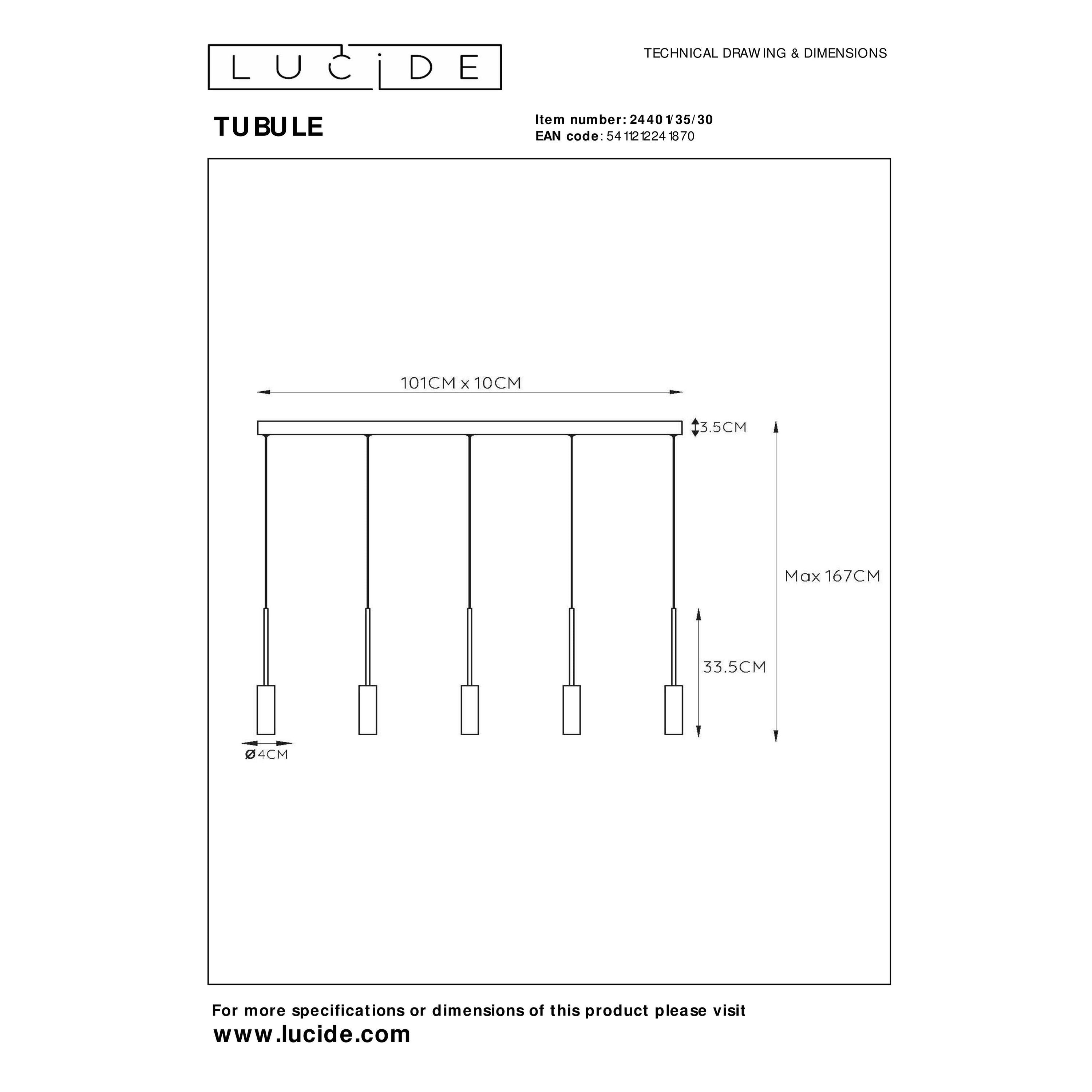 In een moderne eetkamer hoort een hedendaagse luchter. Welkom Tubule. De vijf lichtpunten zijn op een rechte lijn aan een strakke plafondplaat bevestigd. Een eenduidig en elegant ontwerp. Maak je het liever wat speelser? Varieer dan de hoogtes van de vijf lichtpunten. In de cilindervormige lampenkappen uit aluminium zijn de lichtbronnen geïntegreerd. Langs boven en onder ontsnapt sfeervol warm wit licht. Tubule is klaar voor het volgende etentje. Jij ook? Unieke productkenmerken: • Uitgerust met geïntegreerde LED lampen • Uitgerust met warm wit licht (2700K) • Deze lamp is in hoogte verstelbaar • Eenvoudig aan te sluiten op een wandschakelaar (excl.) • Vervaardigd uit hoogwaardig aluminium Belangrijke productkenmerken: • Verbruik: 5x7W / 230V / (Lichtbronnen inbegrepen) • Afmetingen: L.101 x B.10 x H.167 cm • 3 Jaar garantie op het armatuur Waarom kiezen voor Lucide verlichting? Lucide staat voor trendsettend design, vakmanschap en betrouwbaarheid. Als Belgisch familiebedrijf met ruim drie decennia aan expertise ontwerpen wij hoogwaardige verlichting die elke ruimte – binnen én buiten – verrijkt en transformeert. Onze veelzijdige collectie omvat duurzame armaturen en energiezuinige lichtbronnen, zorgvuldig ontworpen door onze eigen experts en geproduceerd volgens de strengste CE-normen. Met ons uitgebreide assortiment bieden we jou altijd een geschikte lichtoplossing, ongeacht stijl of ruimte. Zo verlichten we niet enkel jouw leefruimte maar ook jouw keuzeproces in de zoektocht naar kwalitatieve betaalbare verlichting. Bij Lucide combineren we innovatie met vakmanschap, voor verlichting die niet alleen sfeer toevoegt, maar van ieder huis een thuis maakt.