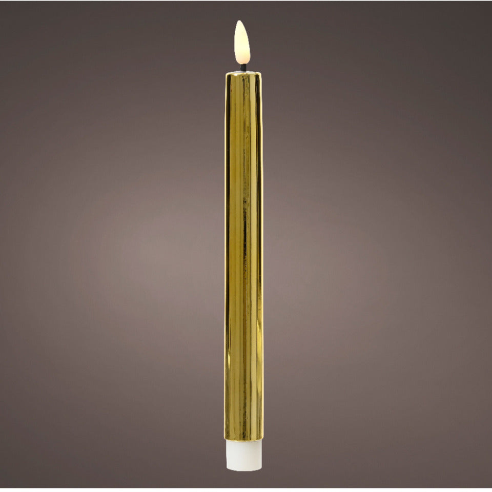 Deze LED dinerkaarsen zijn de perfecte accessoire voor op tafel. De set bestaat uit 2 kaarsen, elk in een gouden glimmende kleur. De kaarsen zijn 24,5 cm lang, 2,1 cm breed en werken op batterijen. Voeding per kaars: 2 AA batterijen (niet inbegrepen). 80 werkuren. Met timer functie.