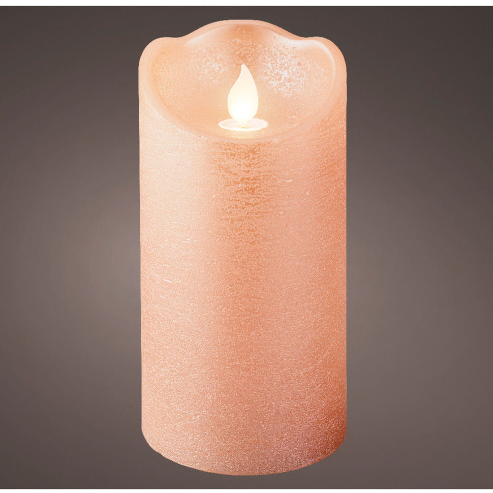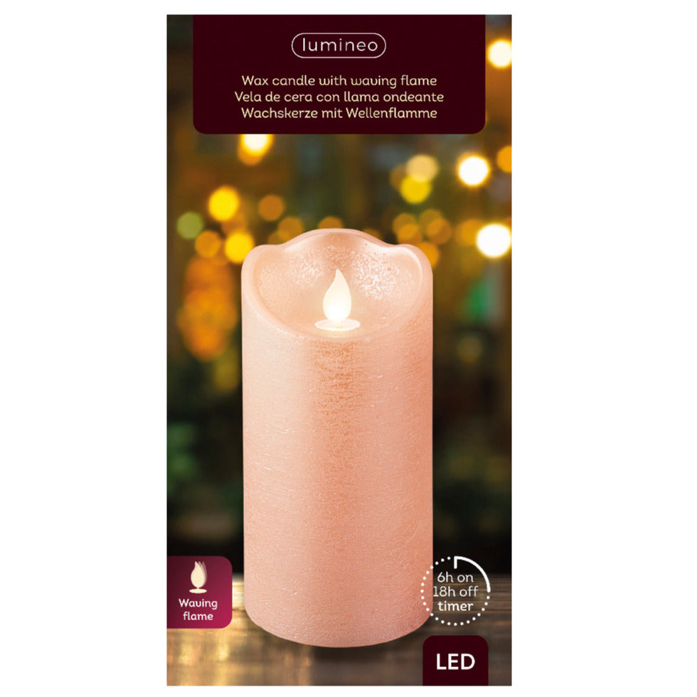 De Lumineo LED kaars/stompkaars is een elegante en stijlvolle kaars met bewegende vlam. Deze kaars is lichtroze van kleur en heeft een afmeting van D7,5 x H15 cm. De kaars is voorzien van een 6/18 uurs timer, waarmee je de verlichting kunt instellen op een tijd die je wilt. De LED verlichting is energiezuinig en geeft een warm, gezellig licht. Geschikt voor binnen. Voeding: 2 AA batterijen (niet inbegrepen. IP20. 250 werkuren.