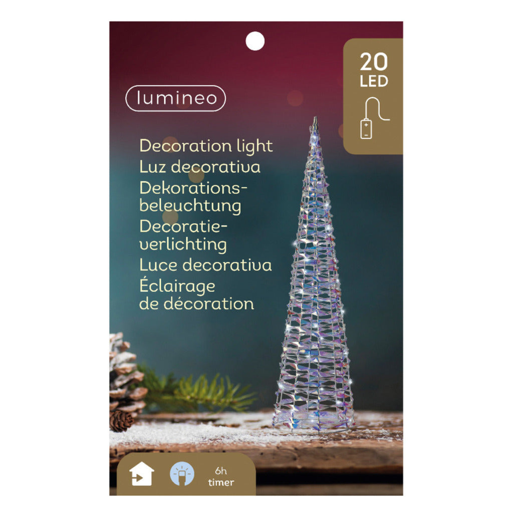 Kerstverlichting figuren LED kegel/piramide kerstboom lamp. Breng een betoverende gloed in je interieur met deze prachtige micro LED kegel kerstboom lamp in een zilveren kleur met parelmoer glans. Met zijn slanke ontwerp en sprankelende verlichting voegt deze kerstboomlamp een vleugje magie toe aan elke kamer. Met een indrukwekkende hoogte van 40 cm is deze lamp een opvallende decoratie die perfect is voor op een tafelblad, vensterbank of als onderdeel van een feestelijk tafereel. Gemaakt van PET-materiaal en voorzien van 20 koel/helder witte micro LED lampjes, biedt deze lamp zowel stijl als functionaliteit voor je kerstdecoratie. Met een aanloopsnoer van 50 cm en de mogelijkheid om op 3 AA batterijen te werken, is deze lamp gemakkelijk te installeren en overal in huis te plaatsen. De steady functie zorgt ervoor dat de verlichting continu brandt, terwijl de timerfunctie van 6 uur het gebruiksgemak vergroot.