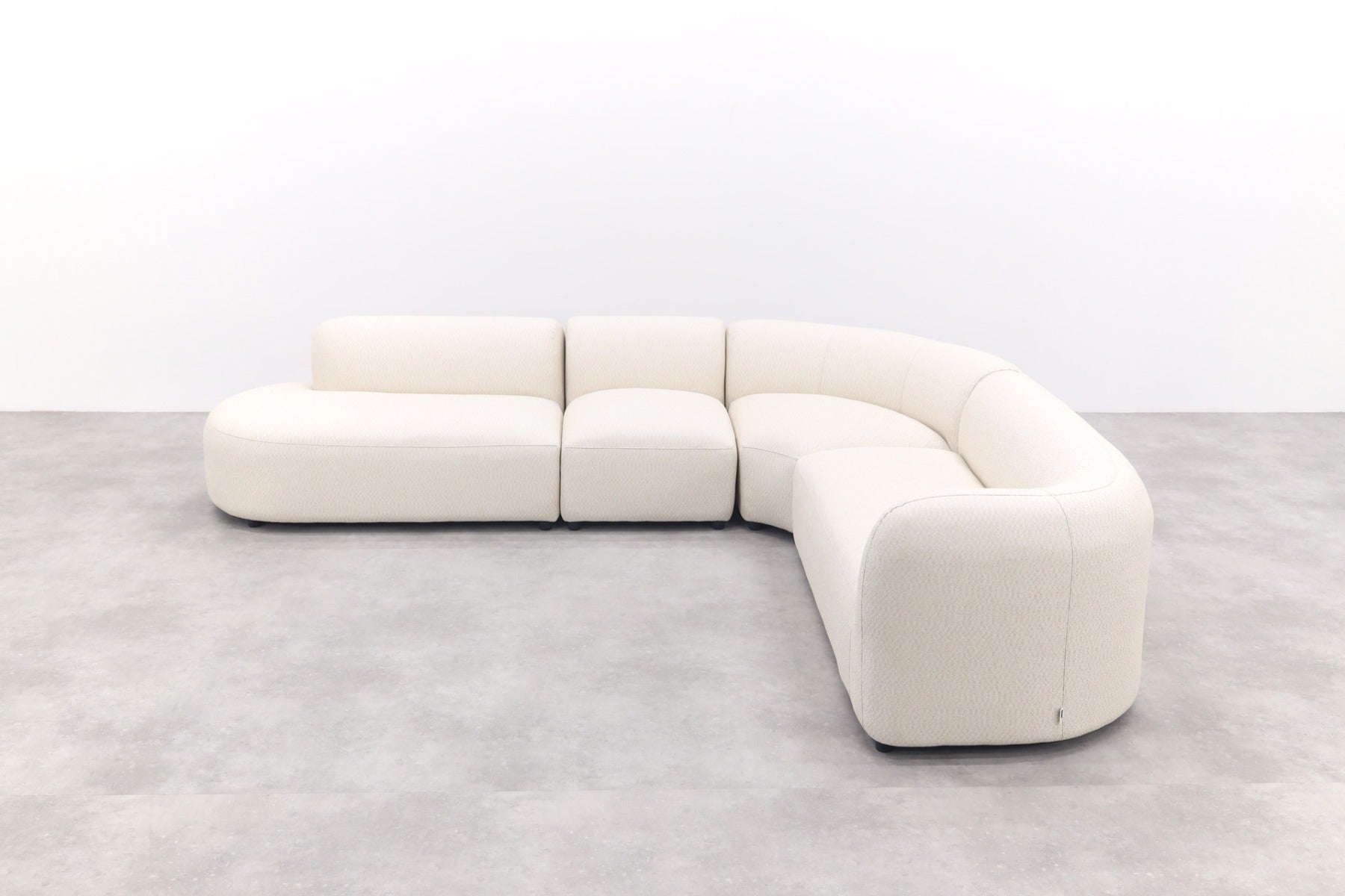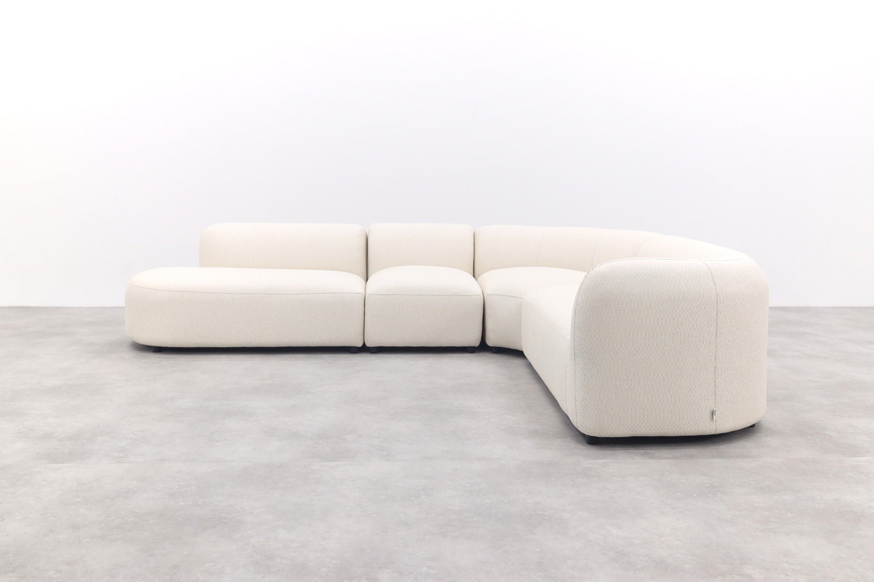 1x Lounge-element met armleuning (links) 1x Rond hoekelement 1x Lounge-eiland (rechts) 1x Midden lounge-element