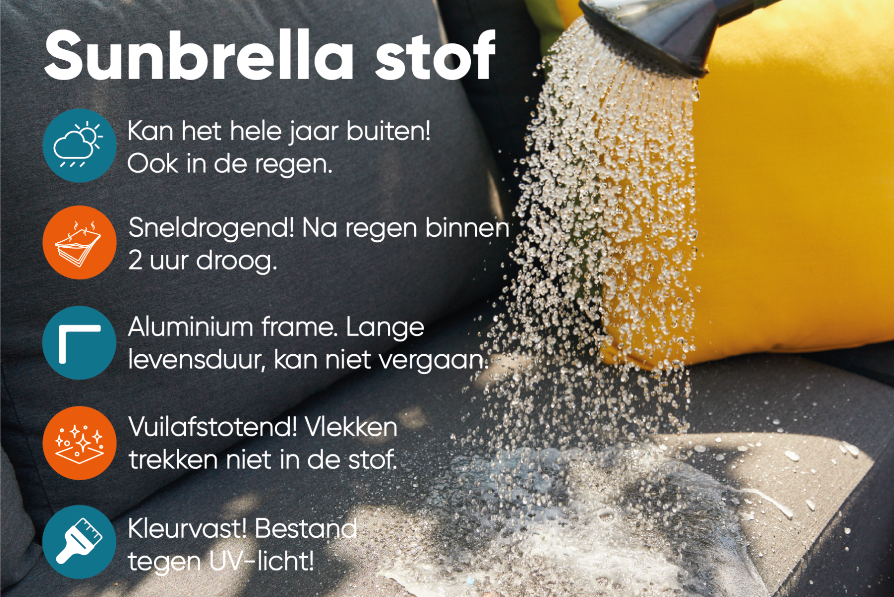De Madeira is bekleed met Sunbrella-stof, een hoogwaardige outdoorstof die bestand is tegen zon, regen en dagelijks gebruik. Deze stof is niet alleen kleurvast en waterafstotend, maar voelt ook verrassend zacht aan. Het sterke aluminium frame zorgt voor stabiliteit en een moderne afwerking. De toevoeging van het middenelement maakt het mogelijk de bank langer te maken of flexibel in te delen. Met deze modulaire set combineer je comfort, design en duurzaamheid – elke dag opnieuw. Deze samenstelling bestaat uit: