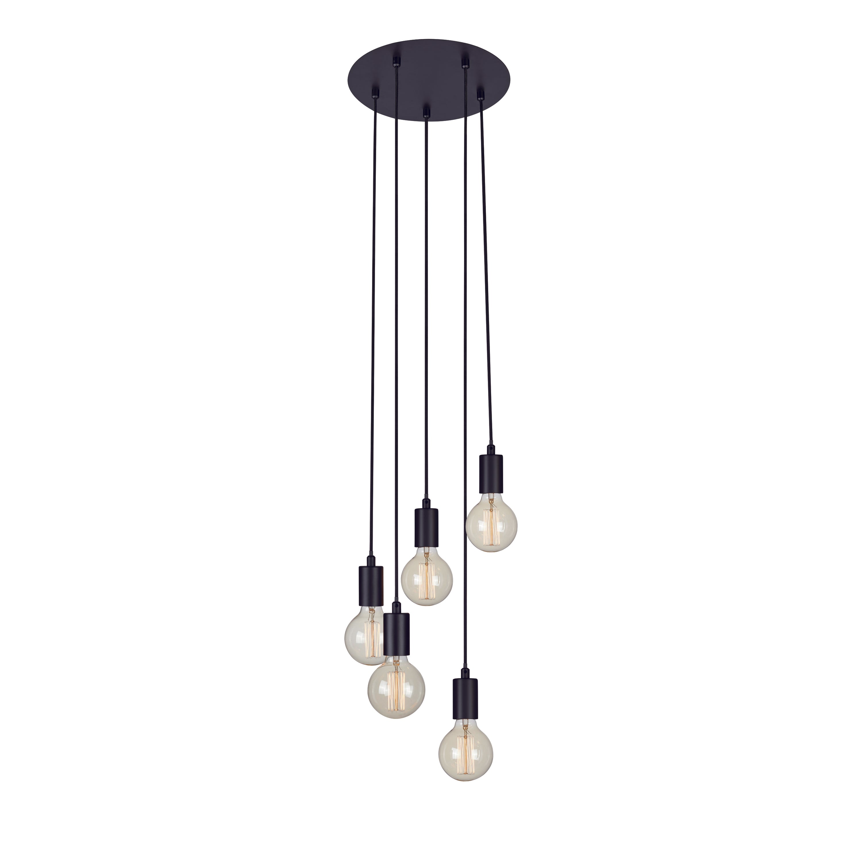 Nieuw in ons assortiment! De Sky 5 lichts Hanglamp zwart met metalen plafondplaat van Scandinavisch design. Deze plafondlamp heeft een kabellengte van 1,5 meter en is hiermee zeer geschikt voor een hoog plafond.