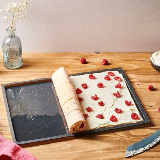 De siliconen bakplaat van Mastrad biedt een uitkomst voor creatief en efficiënt bakken. Gebruik deze rechthoekige bakplaat voor het maken van rolcakes, dunne taartlaagjes, koekjes, plaatpizza’s en meer! Dankzij de flexibele, non-stick uitvoering kan je jouw baksels eenvoudig uit de vorm halen (of erin rollen) zonder deze te beschadigen; ideaal voor het maken van Swiss rolls! Na gebruik is de vorm eenvoudig te reinigen in de vaatwasmachine of met de hand.