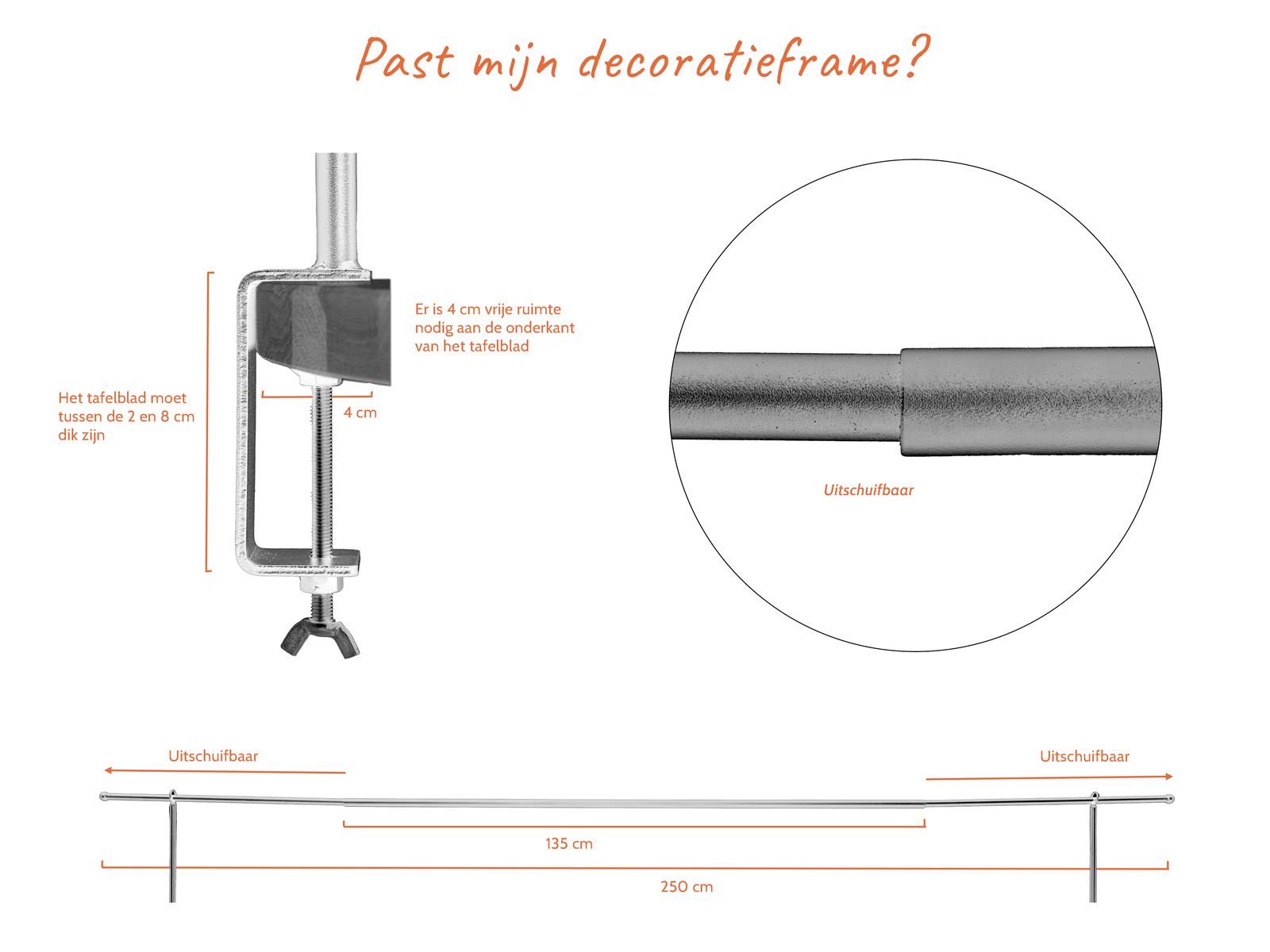 Dit dennengroene decoratieframe past op tafels van 135 cm lengte tot 250 cm lengte met een bladdikte van 2 cm tot 8 cm. Twijfel je of het frame past op je tafel? Kijk dan even naar foto 5 waar exact staat aangegeven waar je tafel aan moet voldoen. Check goed de maten van je tafel zodat we niet onnodig pakketten heen en weer sturen en samen het milieu onnodig belasten. Een decoratieframe bestaat uit twee staanders van 90 cm hoog met een tafelklem die je met een vleugelmoer op je tafelblad schroeft/klemt. De dwarsligger is uitschuifbaar tot ca. 250 cm