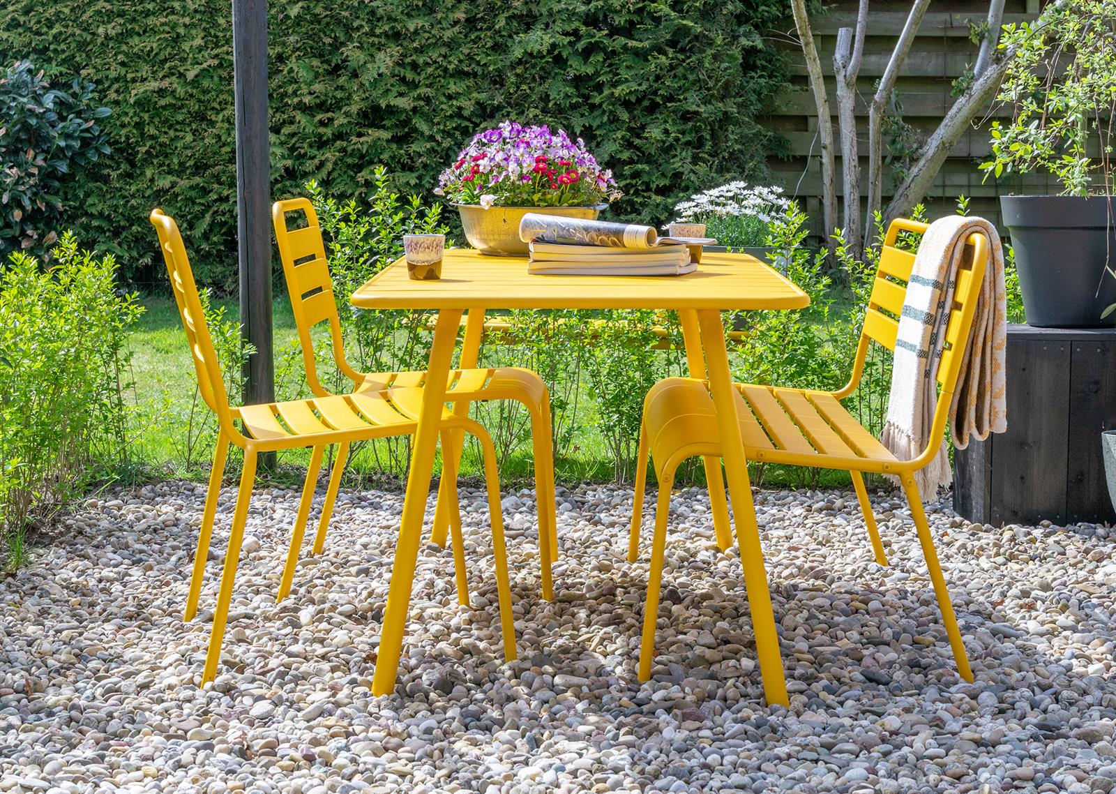 Dit is de tuinset Max in de kleur okergeel. Geel wordt geassocieerd met energie, zon, lente, zomer, een nieuw begin, levensplezier en geluk. De kleur geel stemt vrolijk en positief. Wist je dat het wetenschappelijk is bewezen dat je vrolijk wordt van de kleur geel? Wat wil je nog meer! Wij hebben gekozen voor de kleur okergeel, omdat deze kleur heel mooi te combineren is met bijvoorbeeld olijfgroen, roestbruin en bordeaux rood. Tip van ons: Bij permanent buiten gebruik is voor metaalproducten roestvorming nooit 100% uit te sluiten, vergeet daarom niet de onderhoud spray mee te bestellen, zo kun je beschadigingen direct bijwerken!