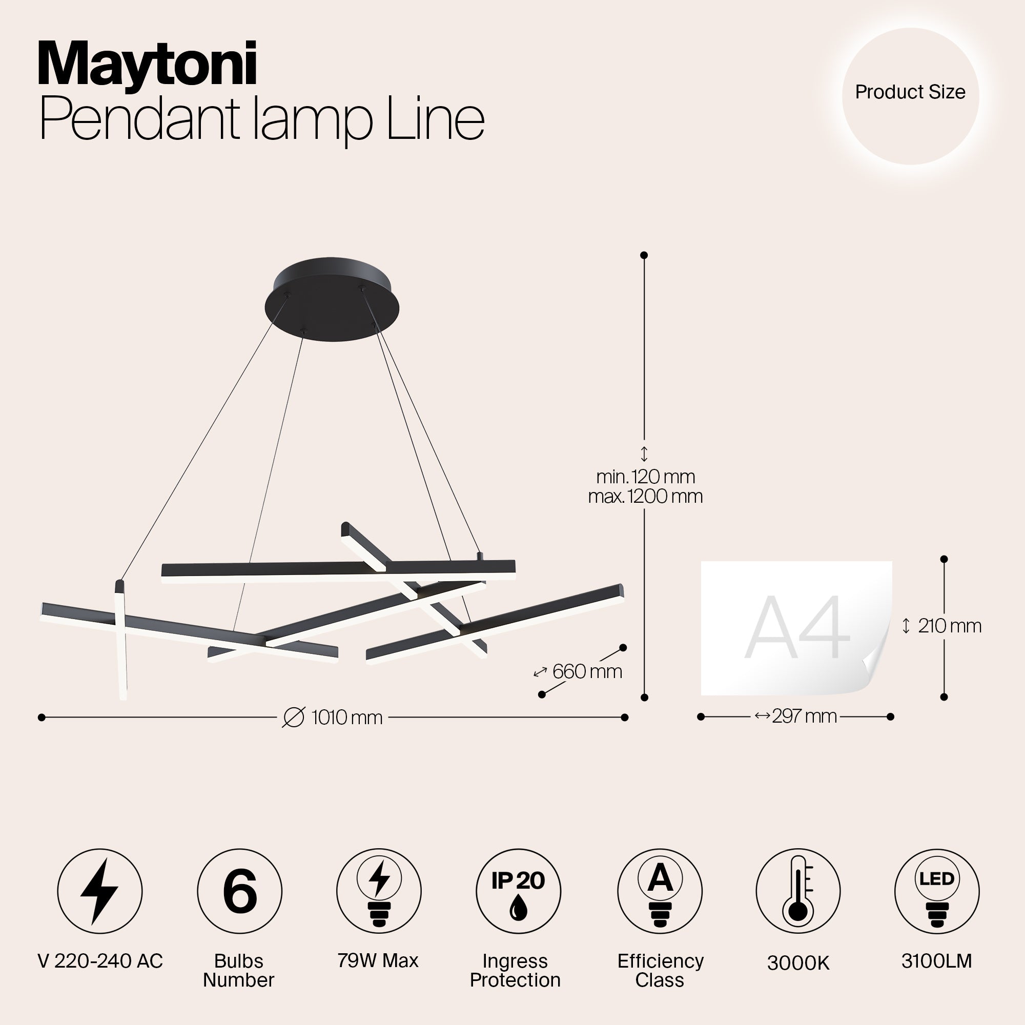 Line Serie: De Line-serie is ontworpen in een minimalistische stijl. De armaturen zijn geschikt voor moderne interieurs, zonder deze te overladen met onnodige details. Dankzij de verstelbare hoogte zijn de hanglampen in de serie geschikt voor kamers met elke plafondhoogte. De LED-lichtbron maakt het mogelijk om tijdens de installatie de gewenste kleurtemperatuur te kiezen, ofwel 3000K of 4000K. Moderne Industriële Ontwerp: Deze hanglamp heeft een strak en eigentijds industrieel ontwerp, perfect om de esthetiek van je woonkamer, slaapkamer, keuken, eetkamer, kantoor, studeerkamer, gang, café of restaurant te verbeteren.Optimale Afmetingen: Met een hoogte van 120 cm, een lengte van 101 cm en een breedte van 66 cm, is deze lamp ontworpen om een statement te maken terwijl hij voldoende verlichting biedt voor elke ruimte.Hoogwaardige LED-Verlichting: Uitgerust met een LED-lamp die een warm licht van 3000 kelvin uitstraalt en 3100 lumen produceert, wat zorgt voor heldere en efficiënte verlichting met een Color Rendering Index (CRI) van 80 voor nauwkeurige kleurweergave.Duurzaam Aluminium Frame: Het zwarte frame is vervaardigd uit hoogwaardig aluminium, wat zowel duurzaamheid als een modern, stijlvol uiterlijk biedt dat bij elk interieur past.Veelzijdige Toepassing: Ideaal voor verschillende omgevingen, deze hanglamp is een veelzijdige verlichtingsoplossing die een vleugje moderne industriële charme toevoegt aan elke kamer of commerciële ruimte.