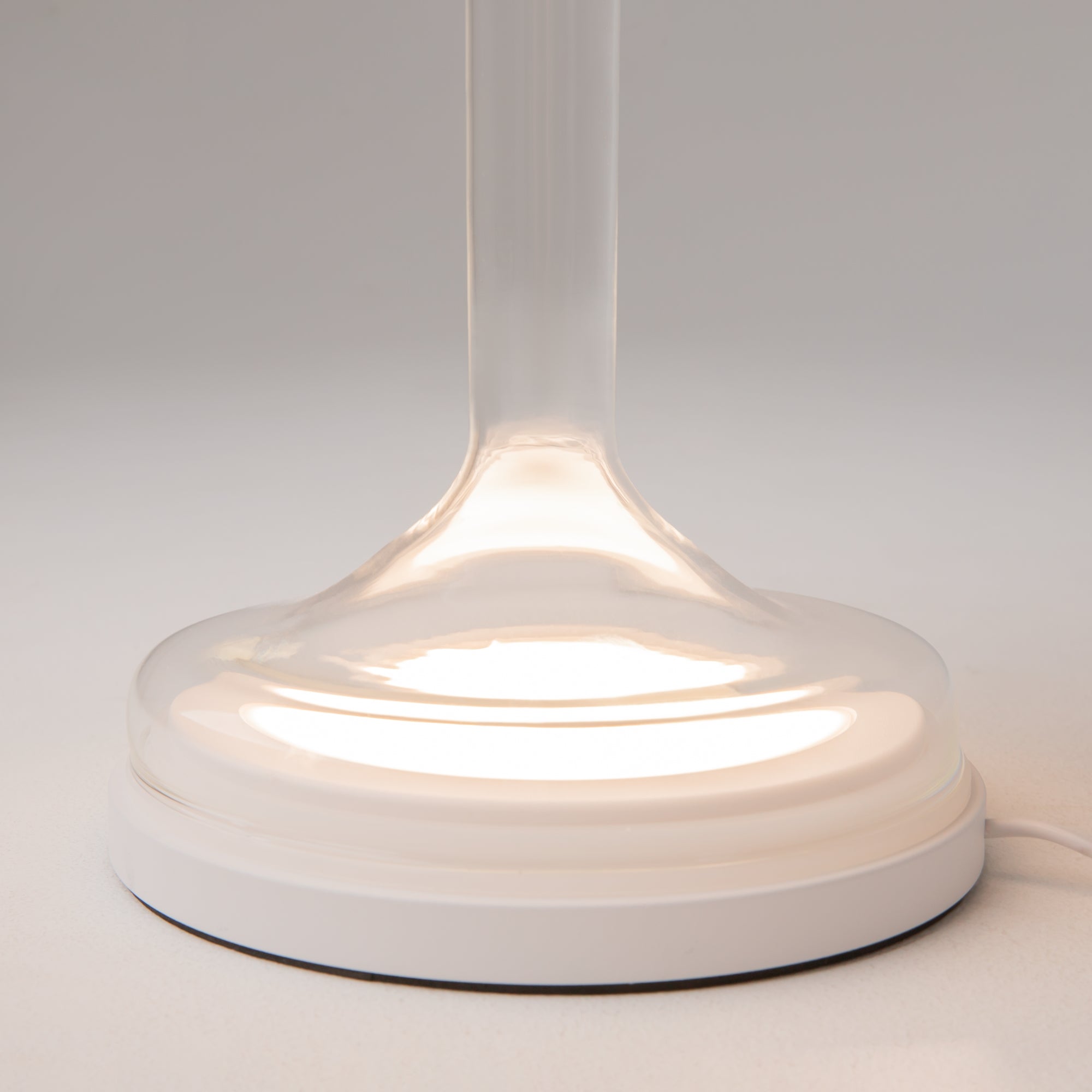 Wit Metalen en Glazen Frame met Witte Glazen Lampenkap IP 20 LED 820 lumen 3000K Tafellamp. Deze moderne tafellamp heeft een cilindrische witte stoffen kap gecombineerd met een slanke metalen basis in een geborstelde gouden afwerking. Het biedt een warme, sfeervolle gloed, ideaal voor het verbeteren van een gezellige sfeer. Het minimalistische ontwerp is goed geschikt voor eigentijdse interieurs.