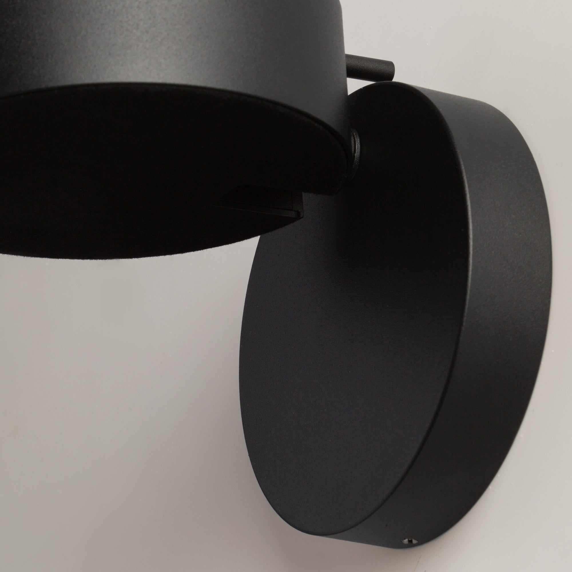 Zwarte aluminium frame IP 20 LED wandlamp met 200 lumen en 3000K. Met een modern ontwerp en een matzwarte afwerking heeft deze lamp een cilindrisch lichaam met een licht taps toelopende boven- en onderkant. Het is gemonteerd op een rechthoekige zwarte wandplaat, wat een minimalistische en eigentijdse uitstraling biedt. De lichtbron is naar beneden gericht, waardoor het geschikt is voor accent- of taakverlichting.
