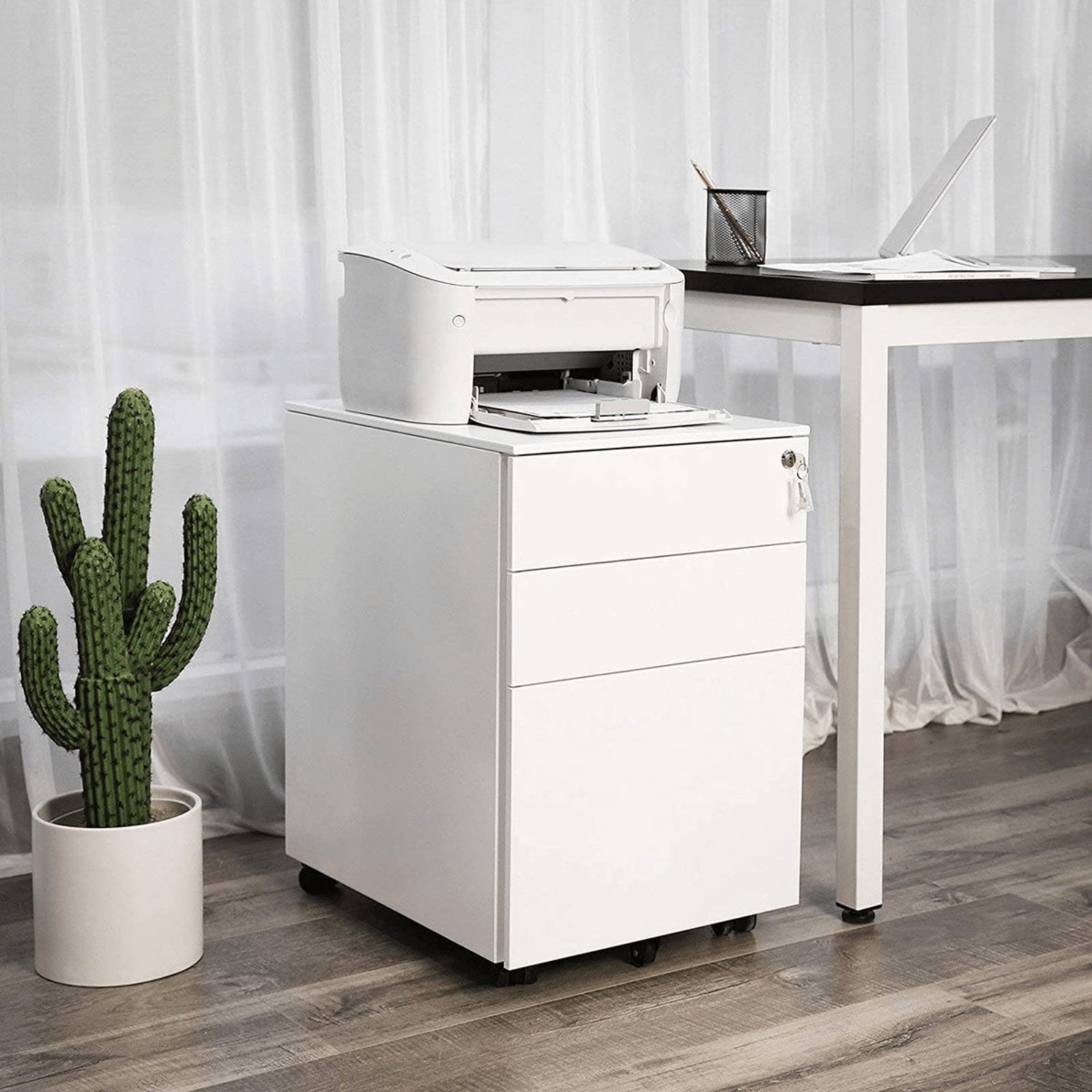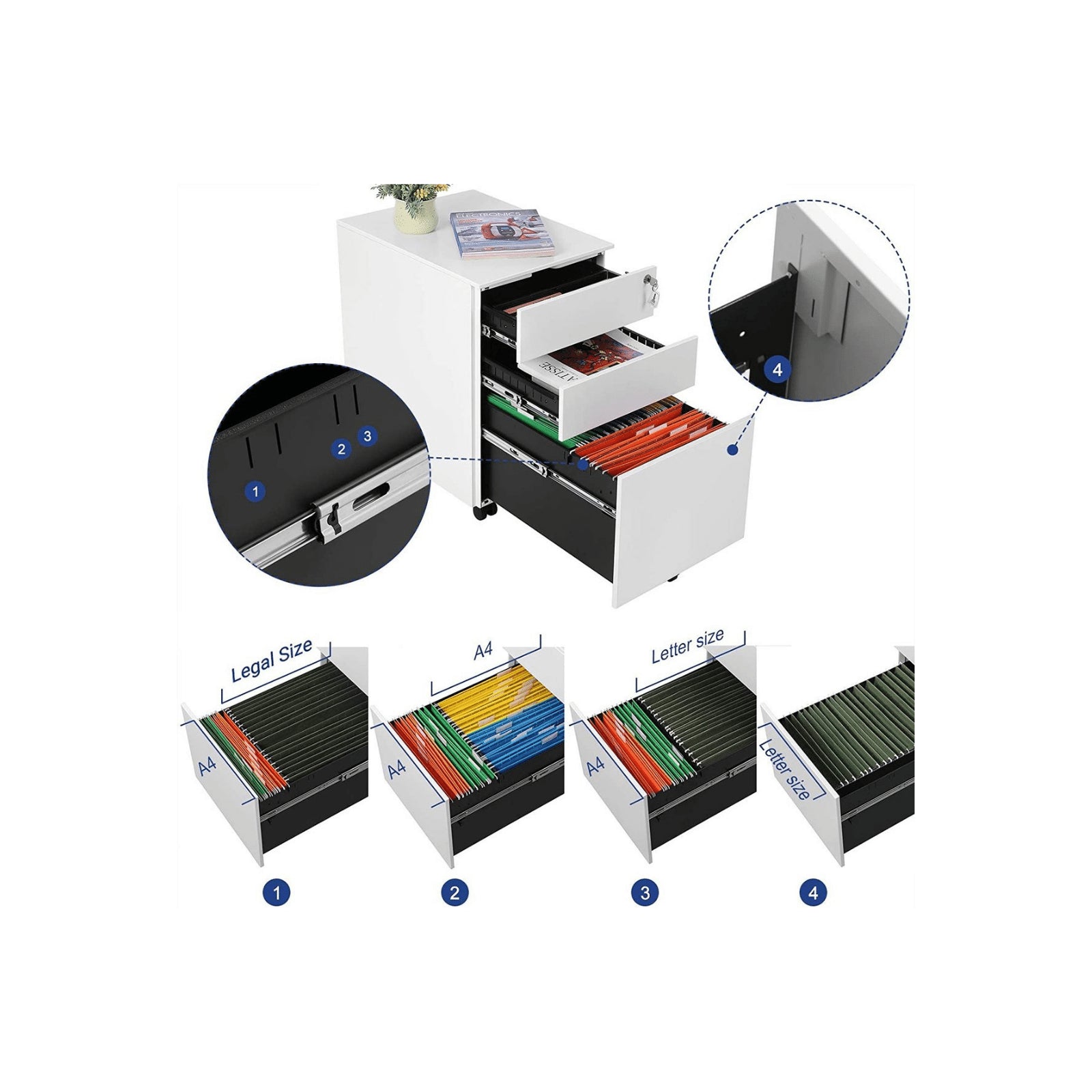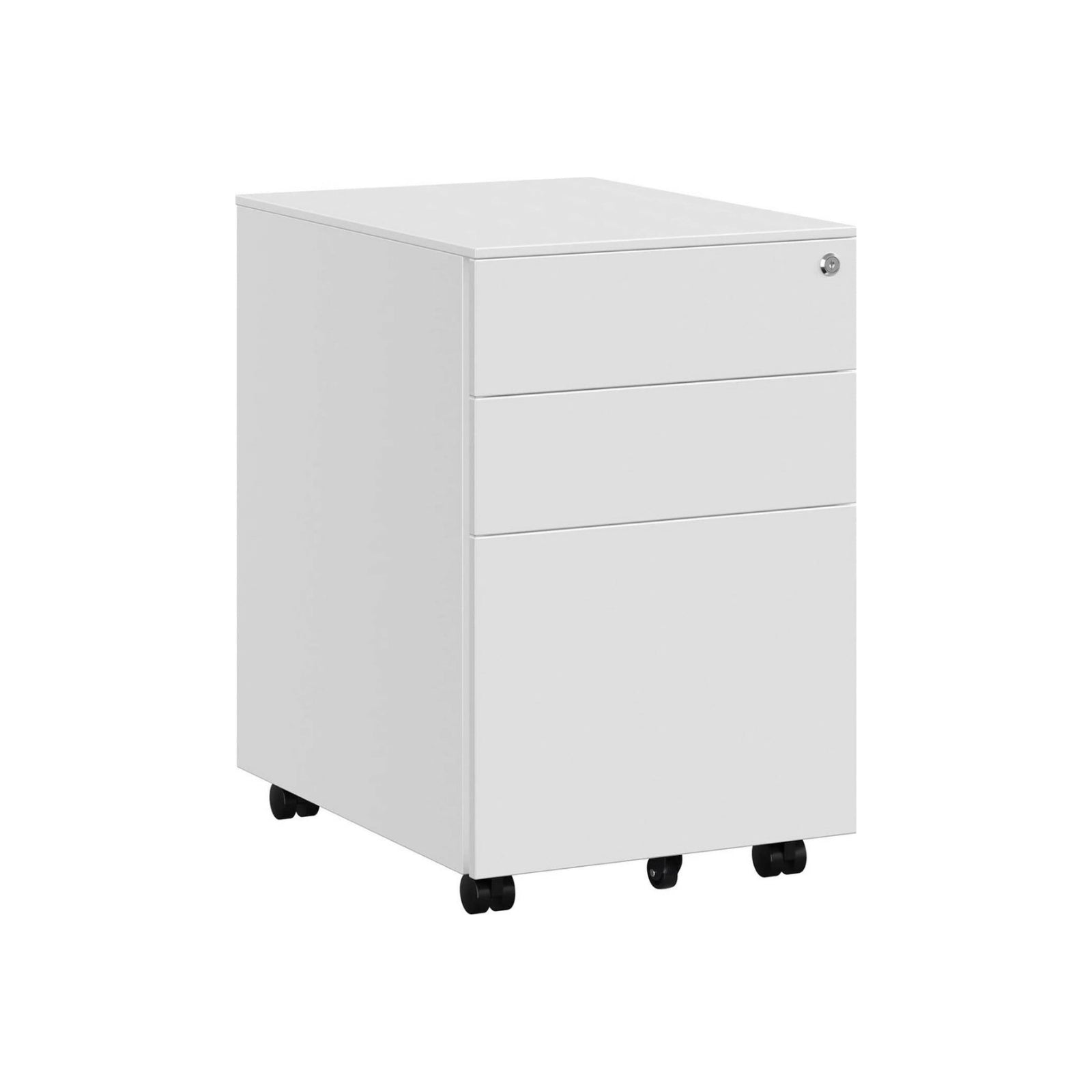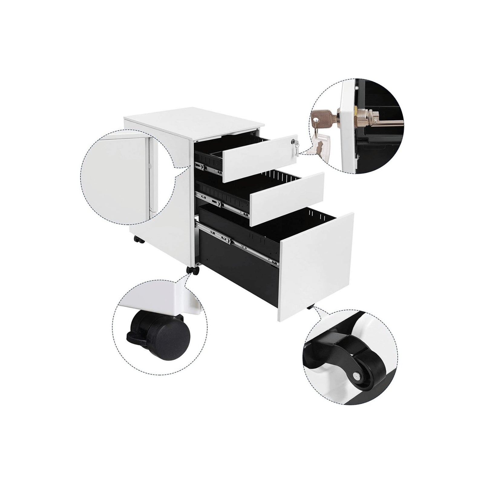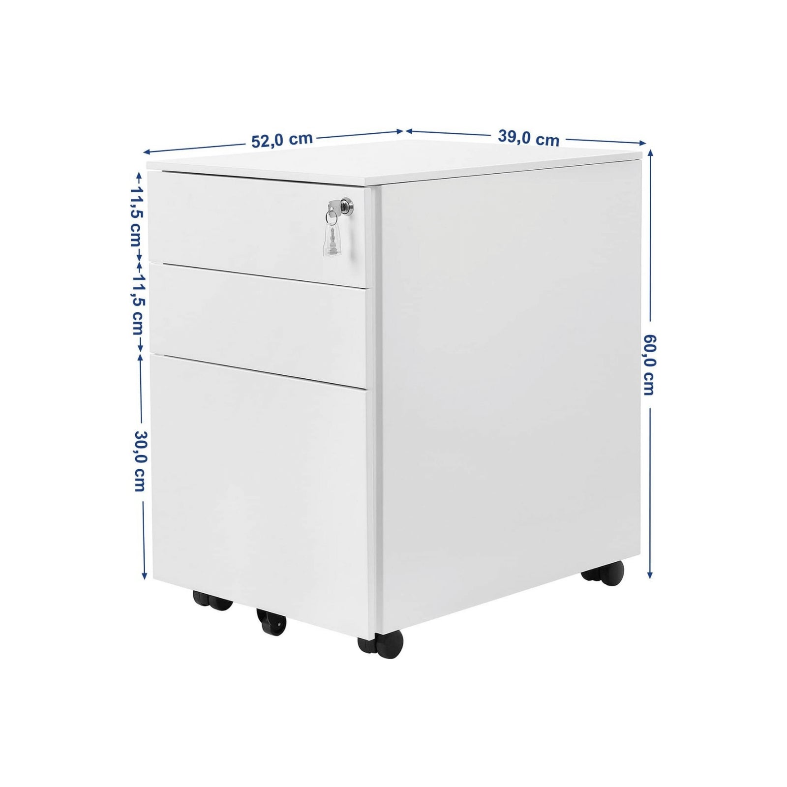 VERGRENDELBARE VERGRENDELING MET ROLLEN: Met behulp van het slot kunnen alle 3 de lades veilig worden vergrendeld. De rollen draaien 360 graden en rollen de kast in elke gewenste positie. Met zijn grootte past hij ook onder bureaus.