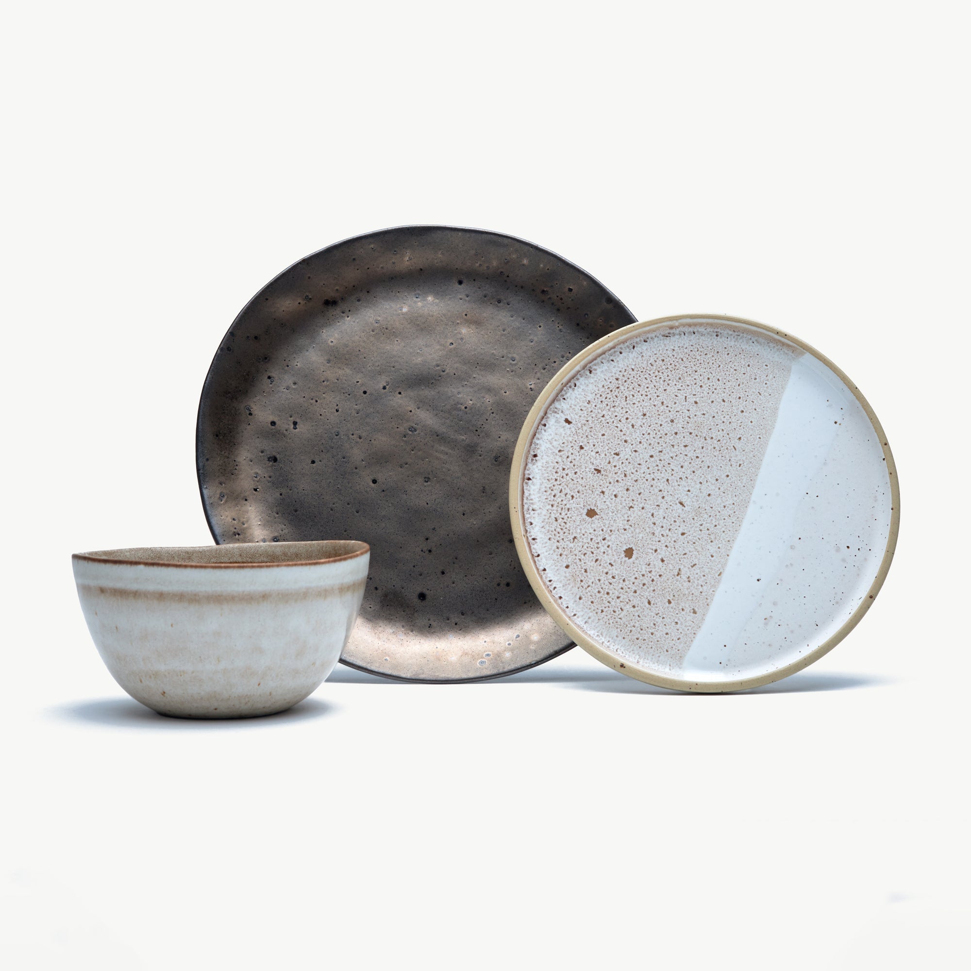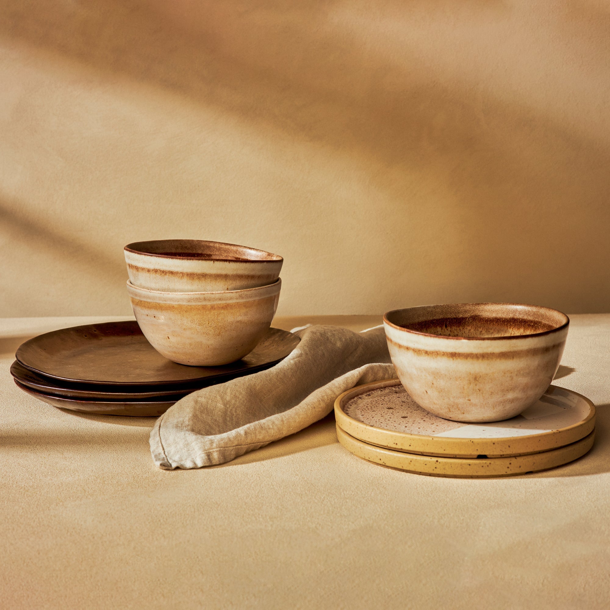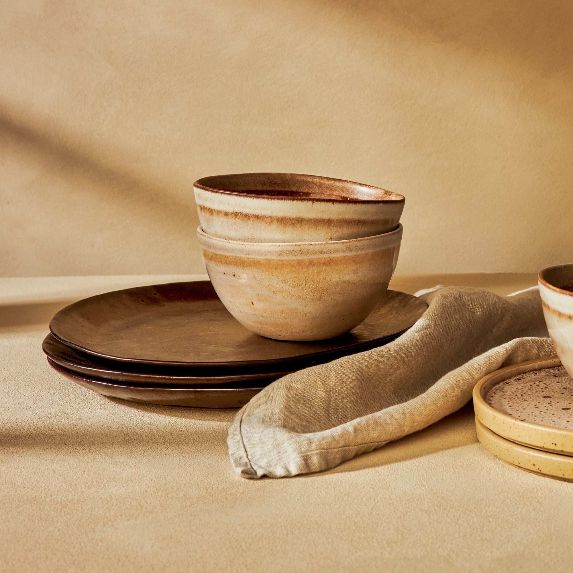 Bijzonder brons met een tintje beige! Voor iedereen die een bijzondere en uniek tafel wil dekken. Door de strepen is elk Moinhos ontbijtbord en de Oravalho kom uniek. In combinatie met de Bouro is dit een stoere set die elegantie toevoegd aan menig interieur.