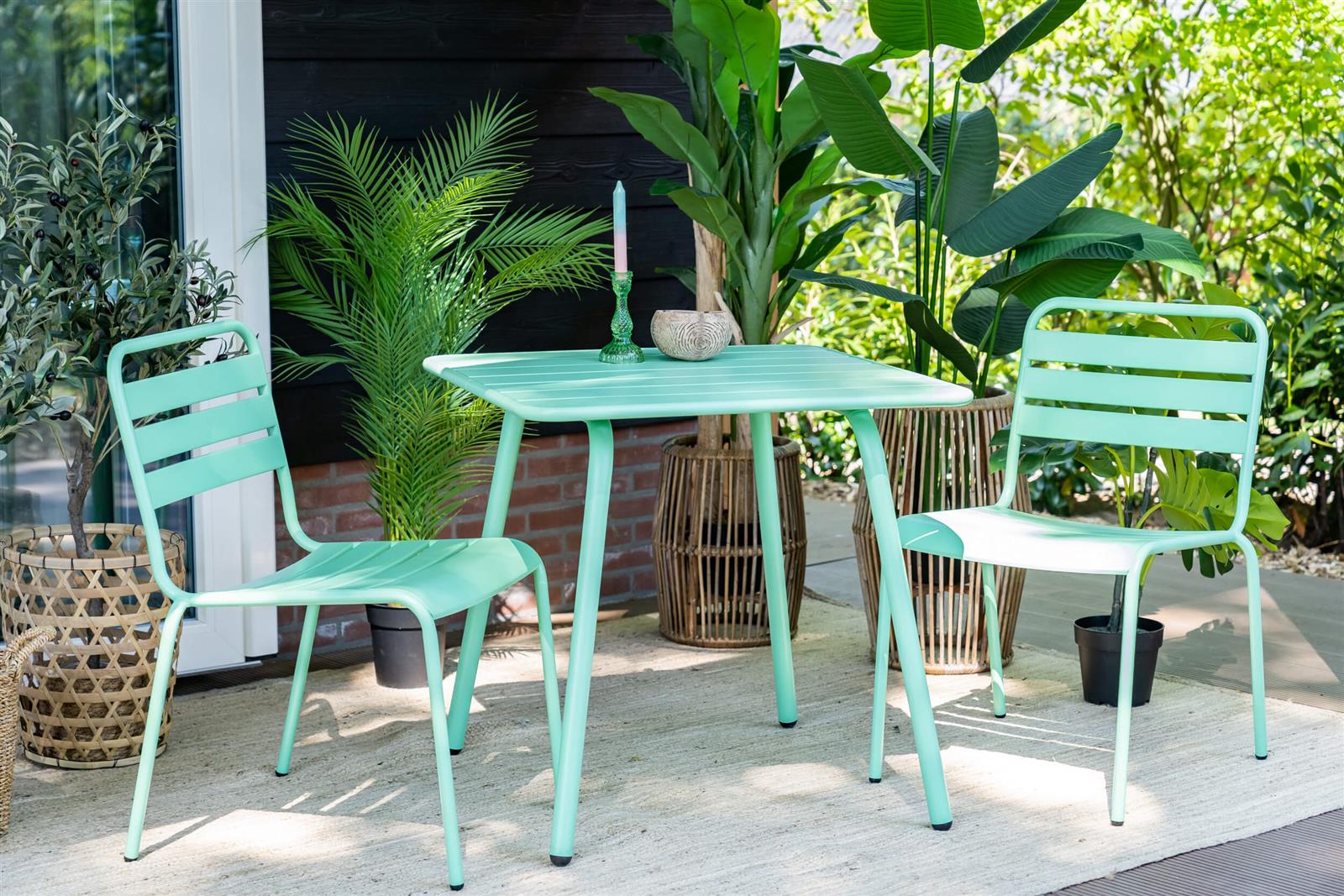 Deze tuinset is met zijn compacte maat van 80 cm uitermate geschikt voor de kleinere tuin of dakterras. Als je wat meer ruimte hebt zou je nog twee extra stoelen kunnen aanschaffen. Door de robuuste metalen uitvoering een topper voor scholen, horeca en recreatie!