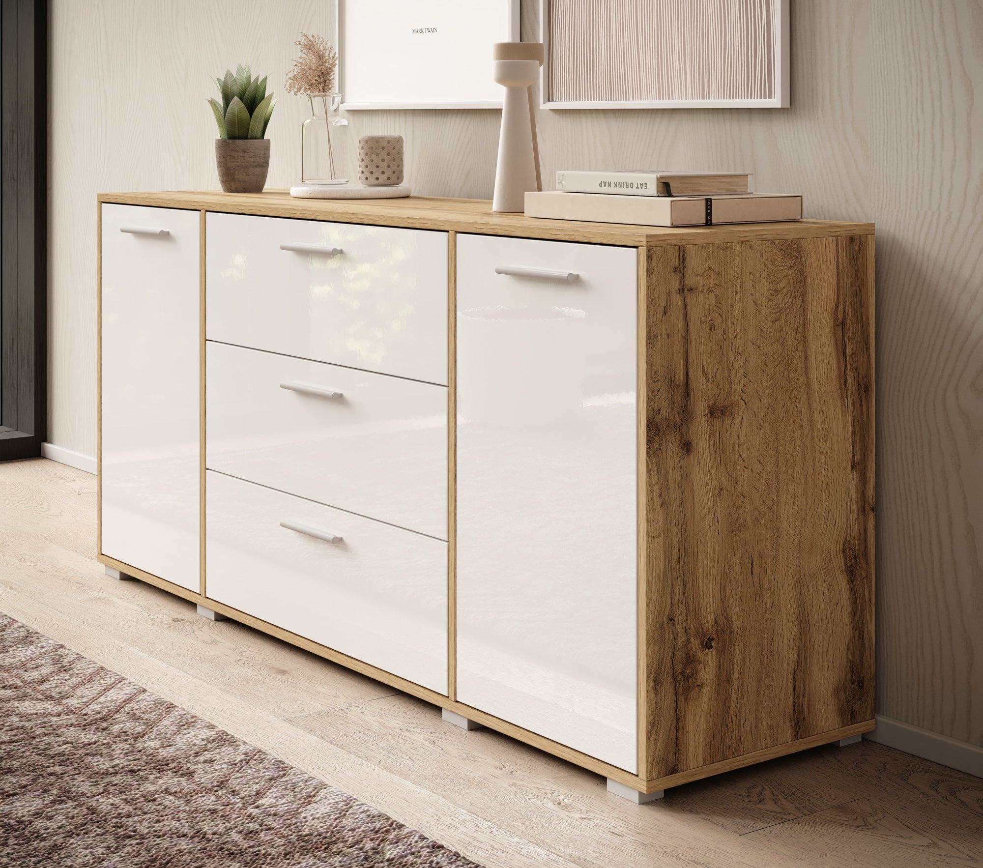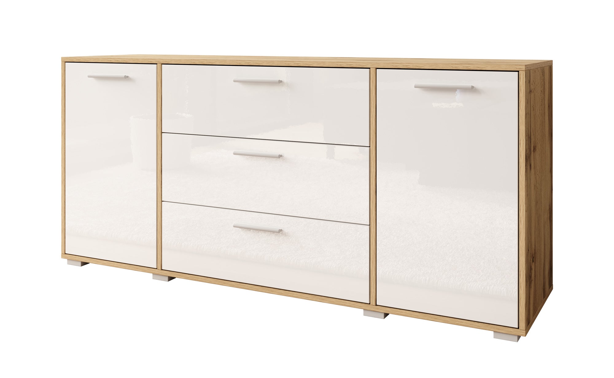 - Deuren en lades met zilverkleurige handgrepen