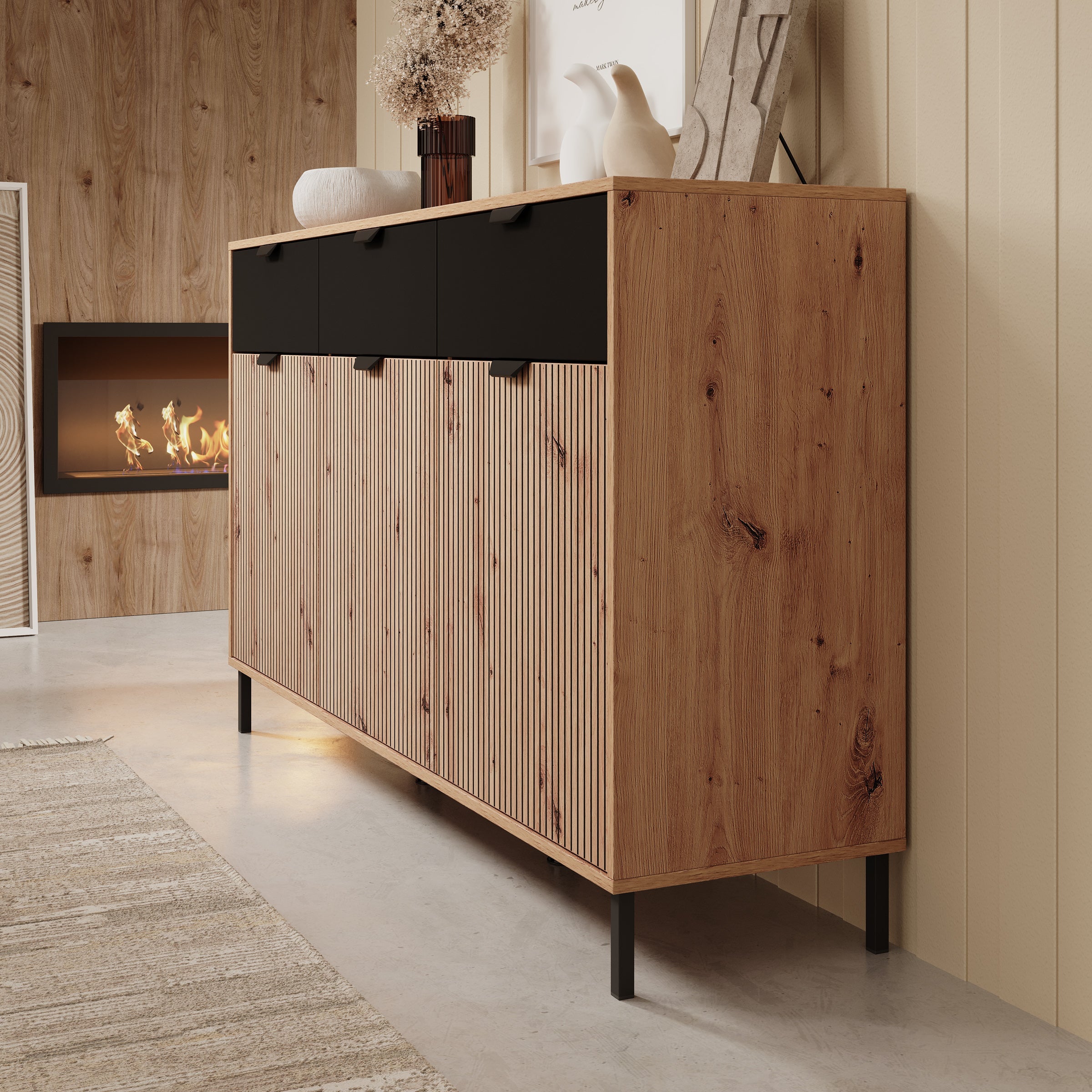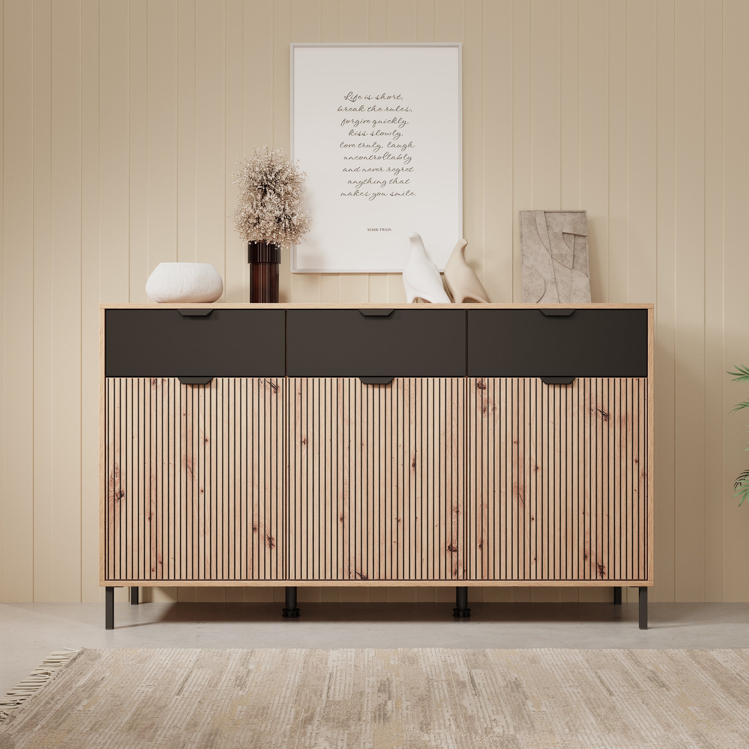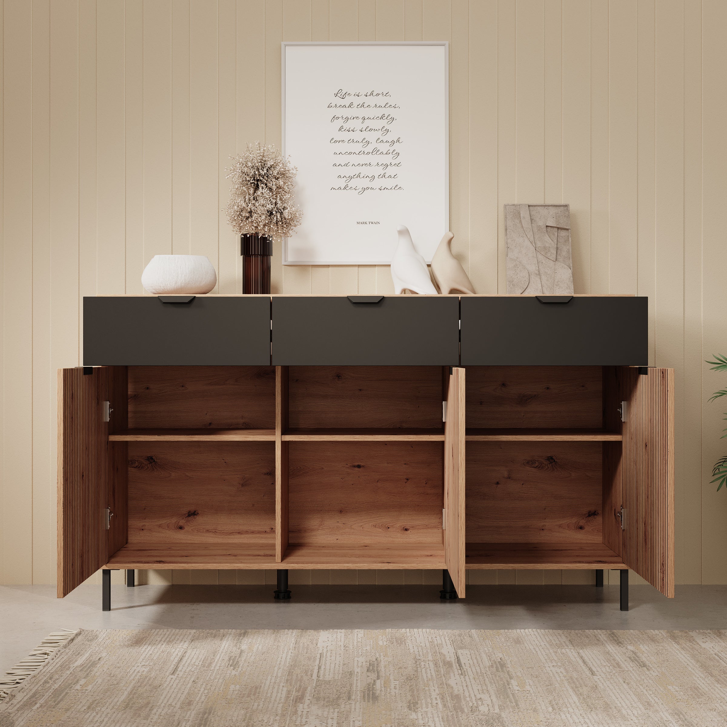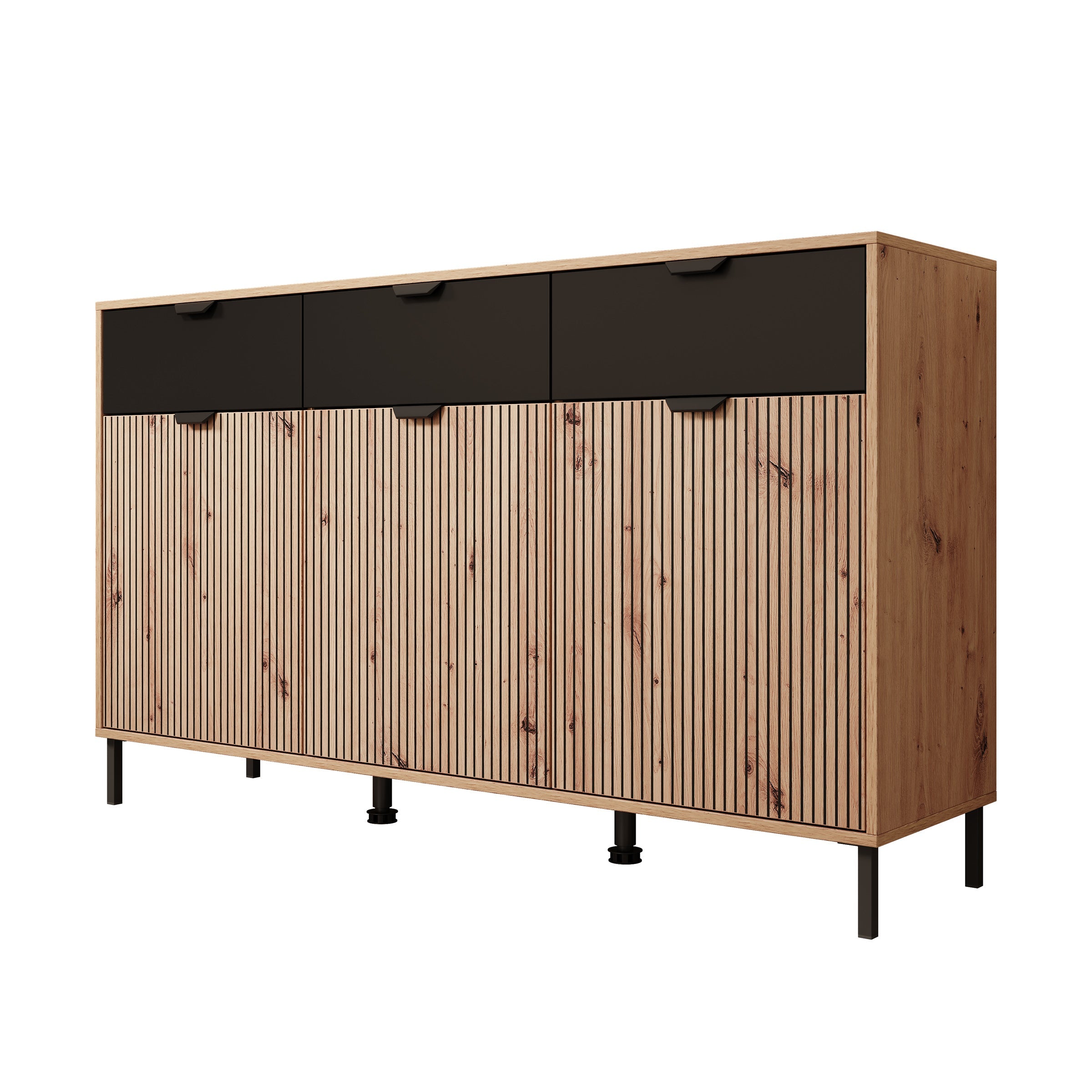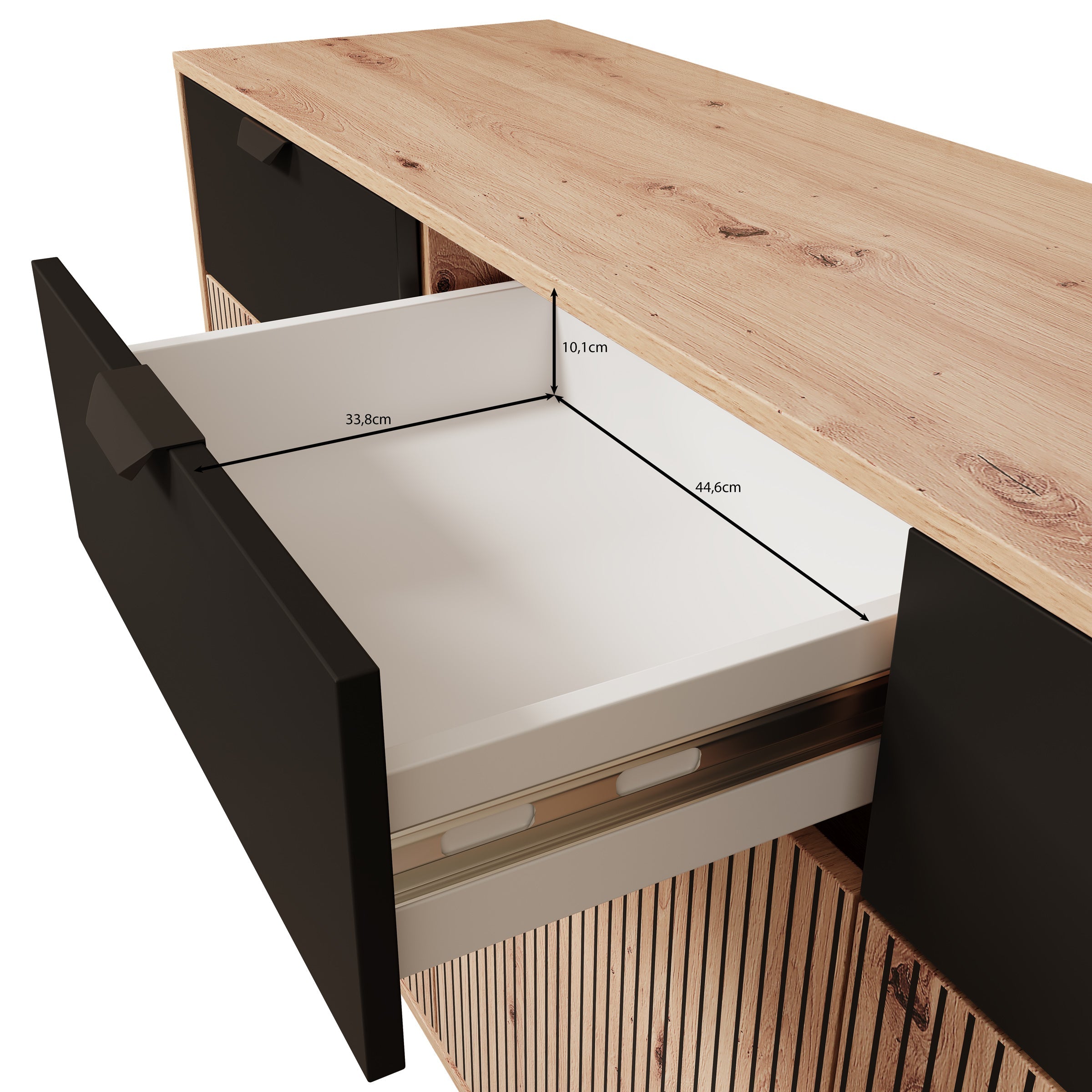 - Deuren en lades met zwarte handgrepen