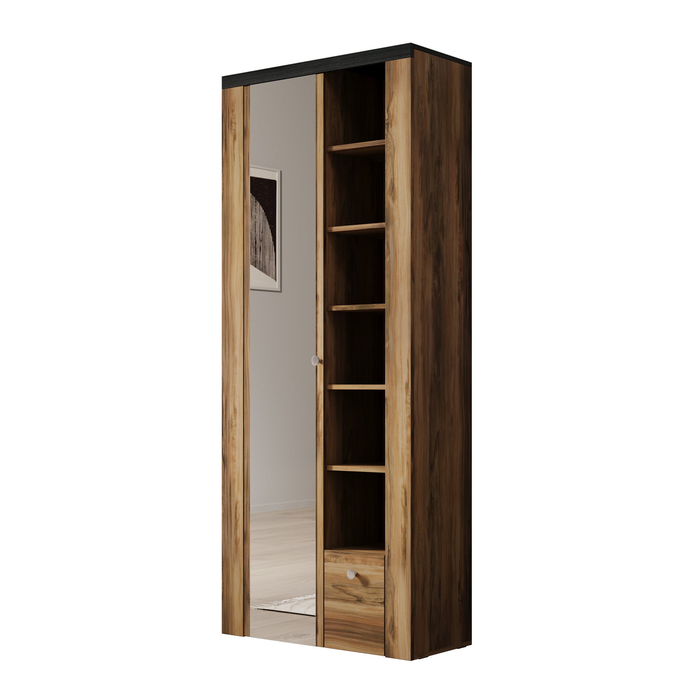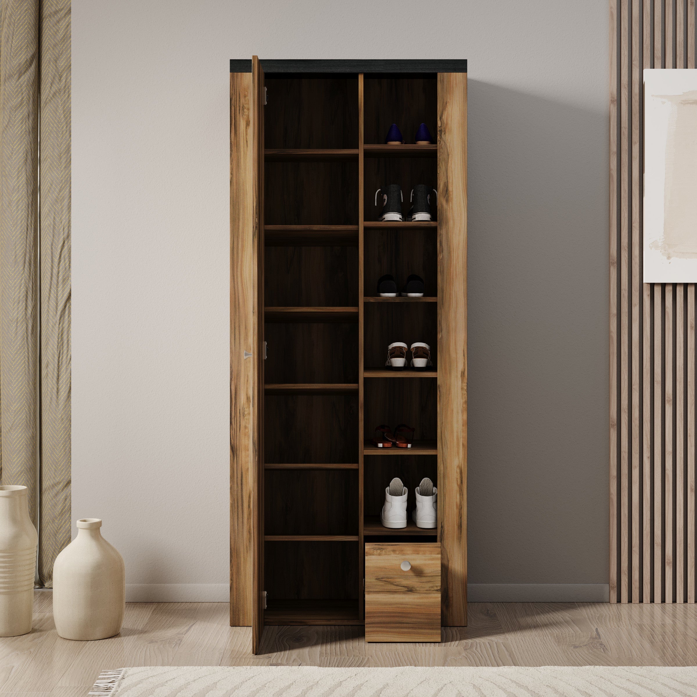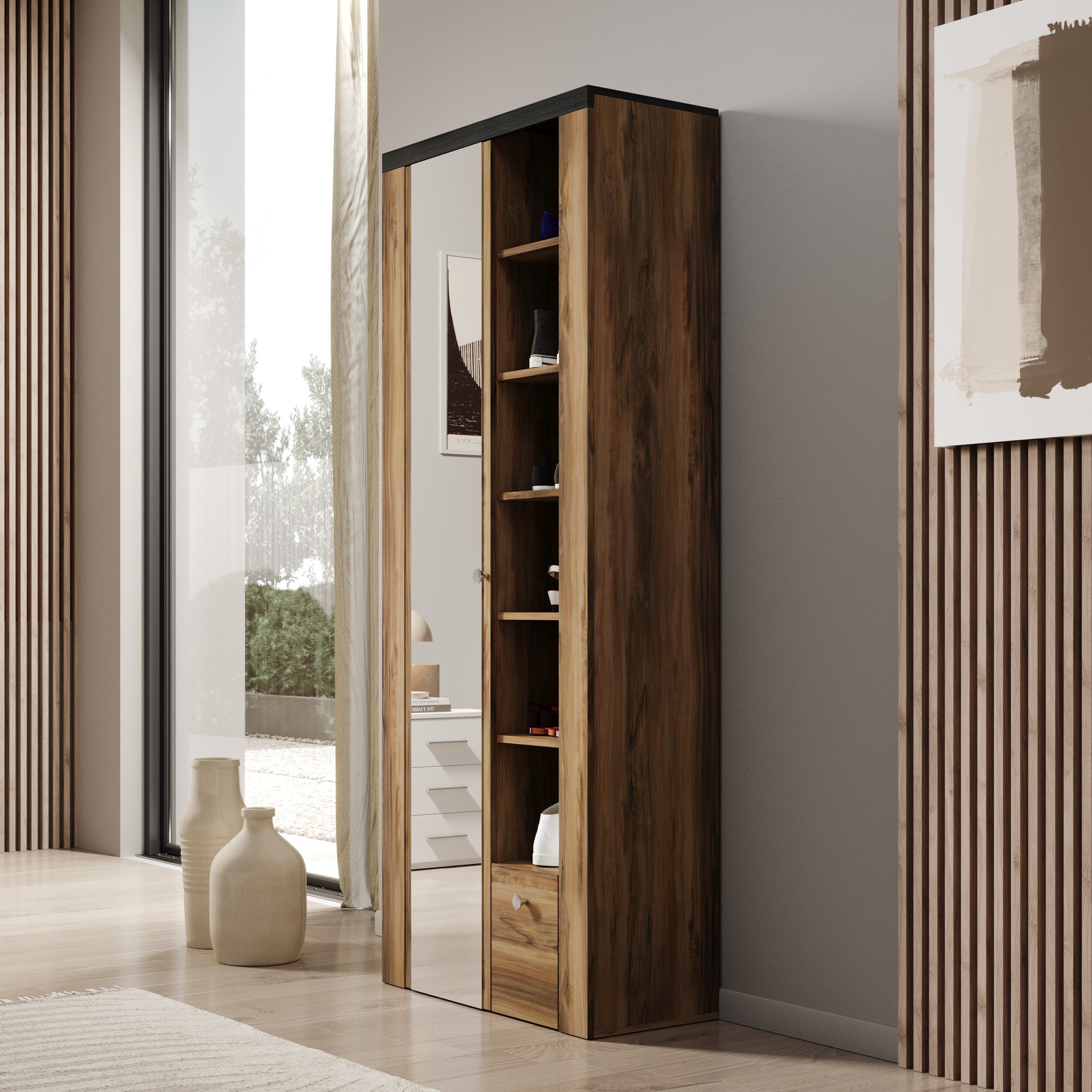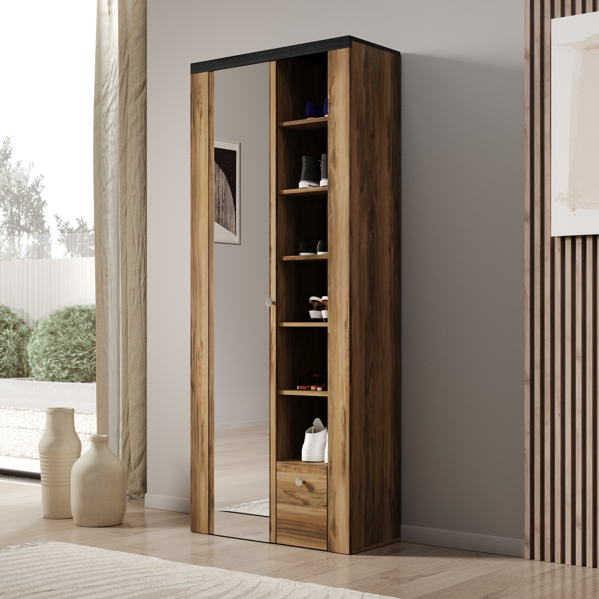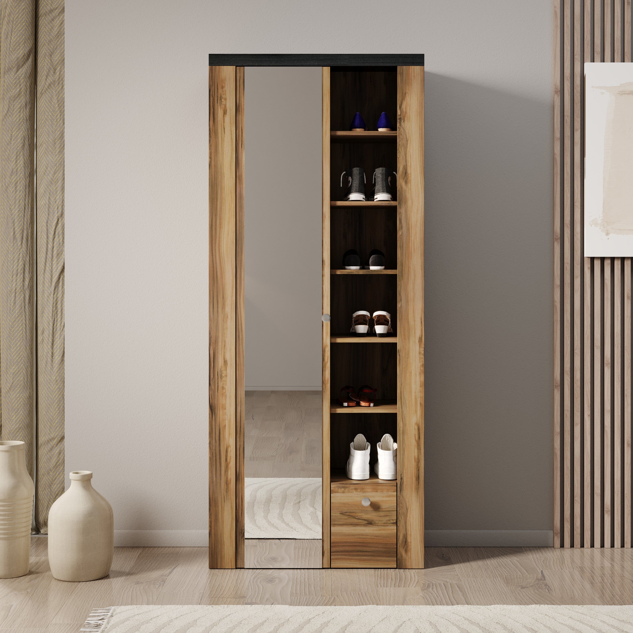 Meubella - Schoenenkast Linford - Donker eiken - 80 cm - Met spiegel
