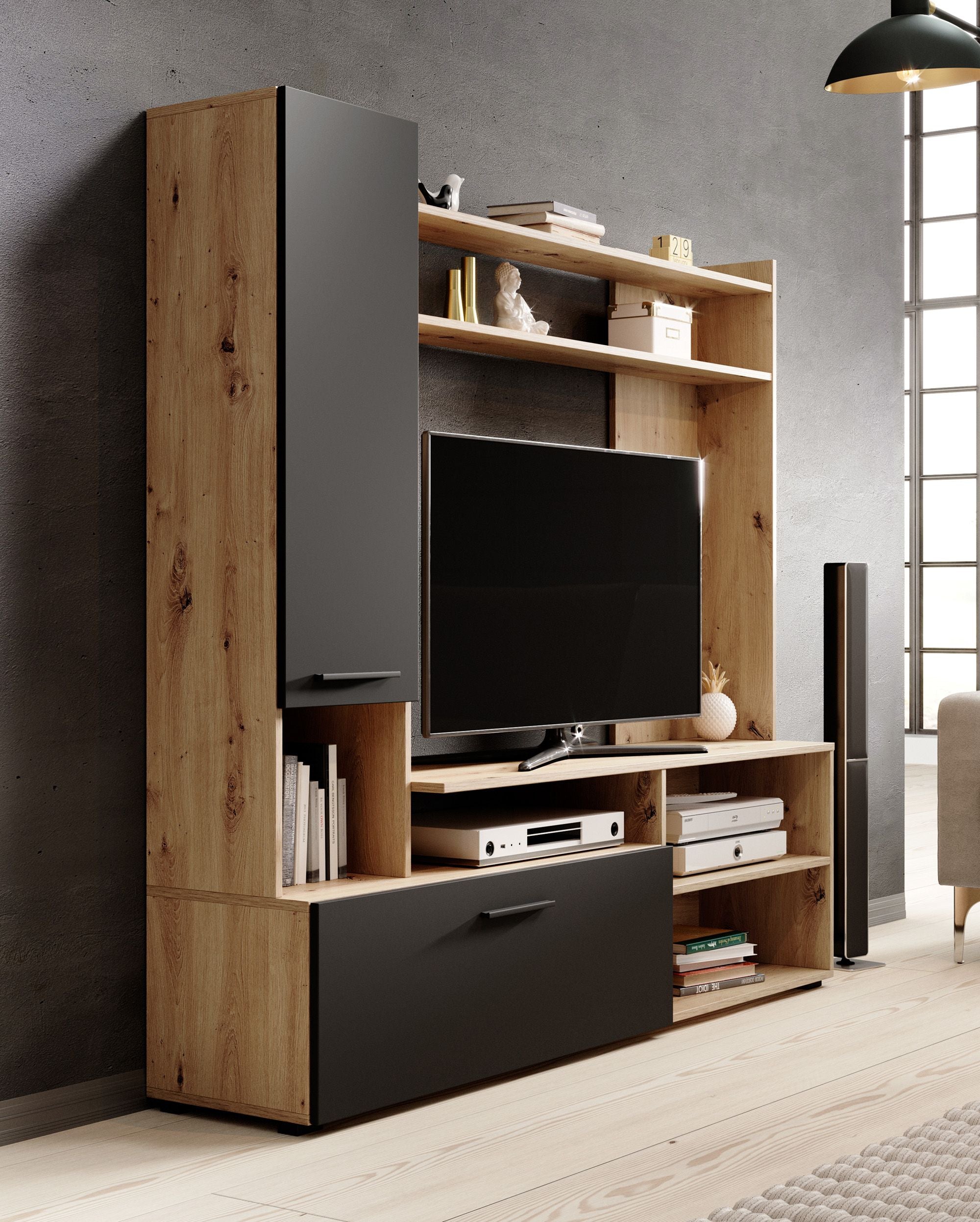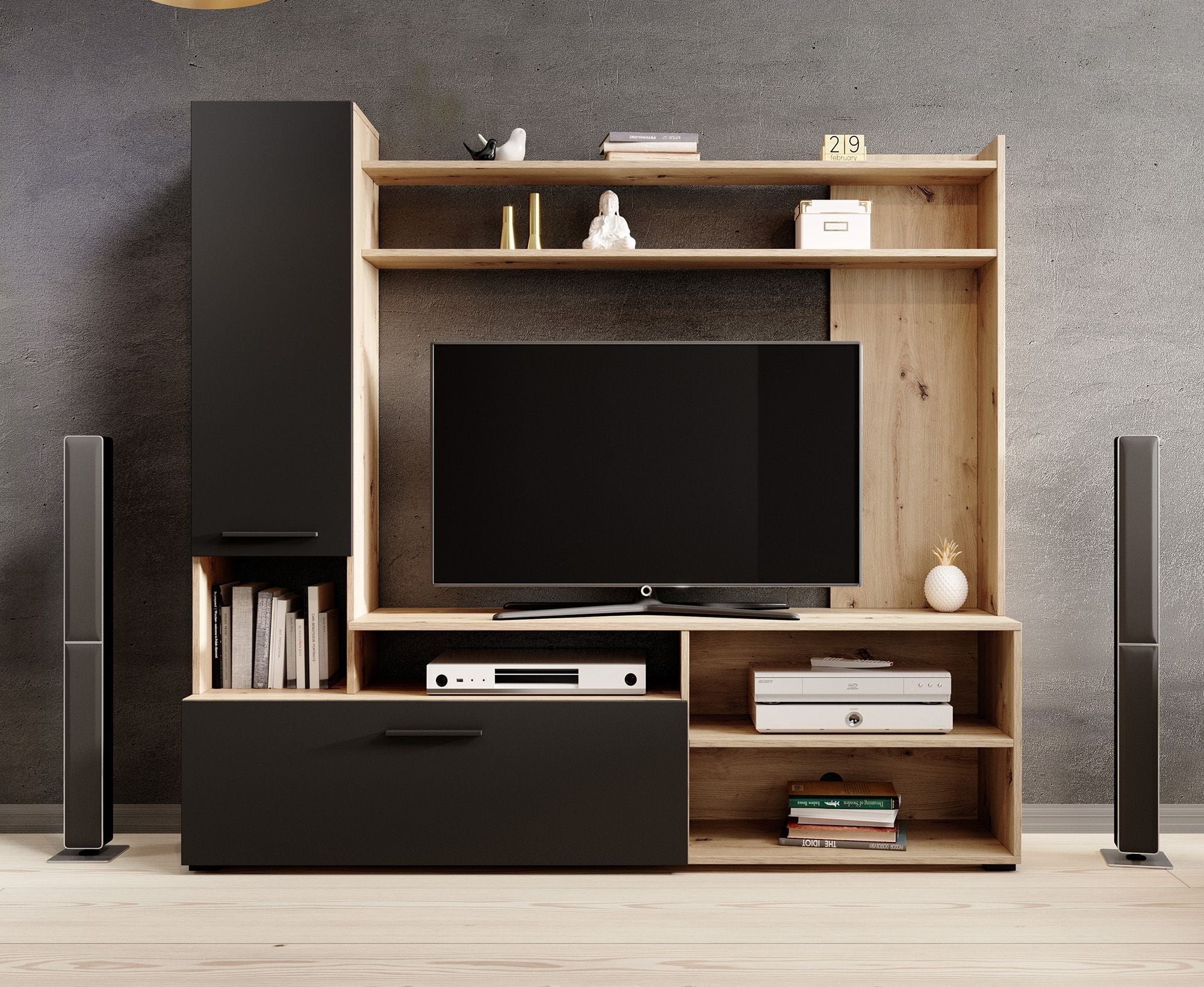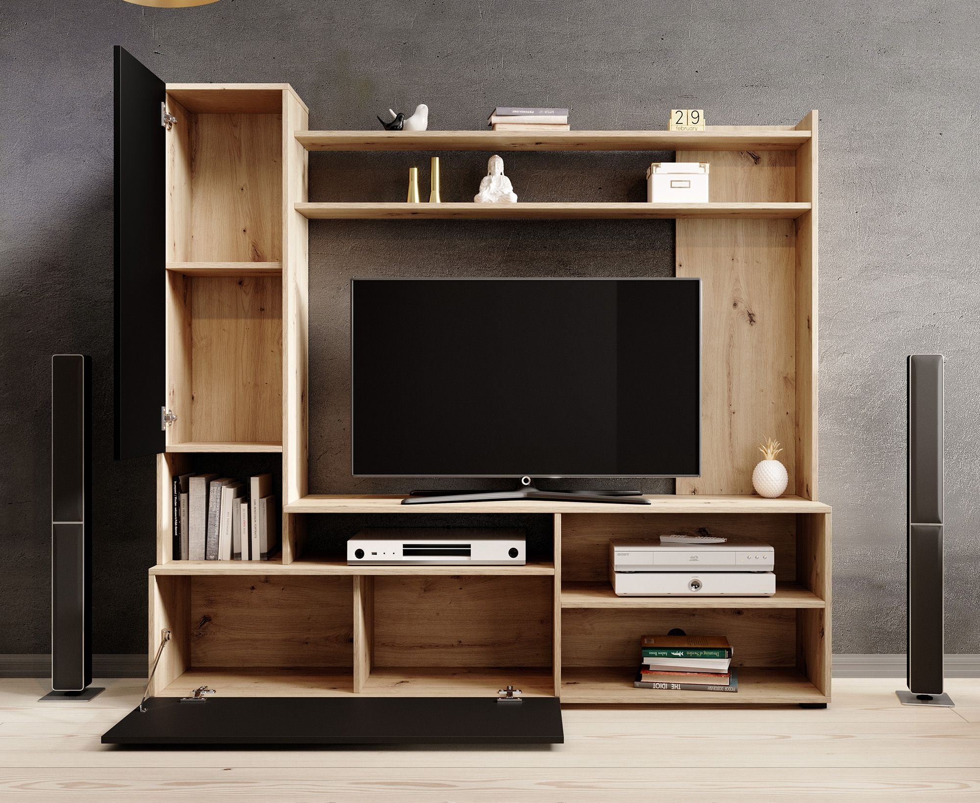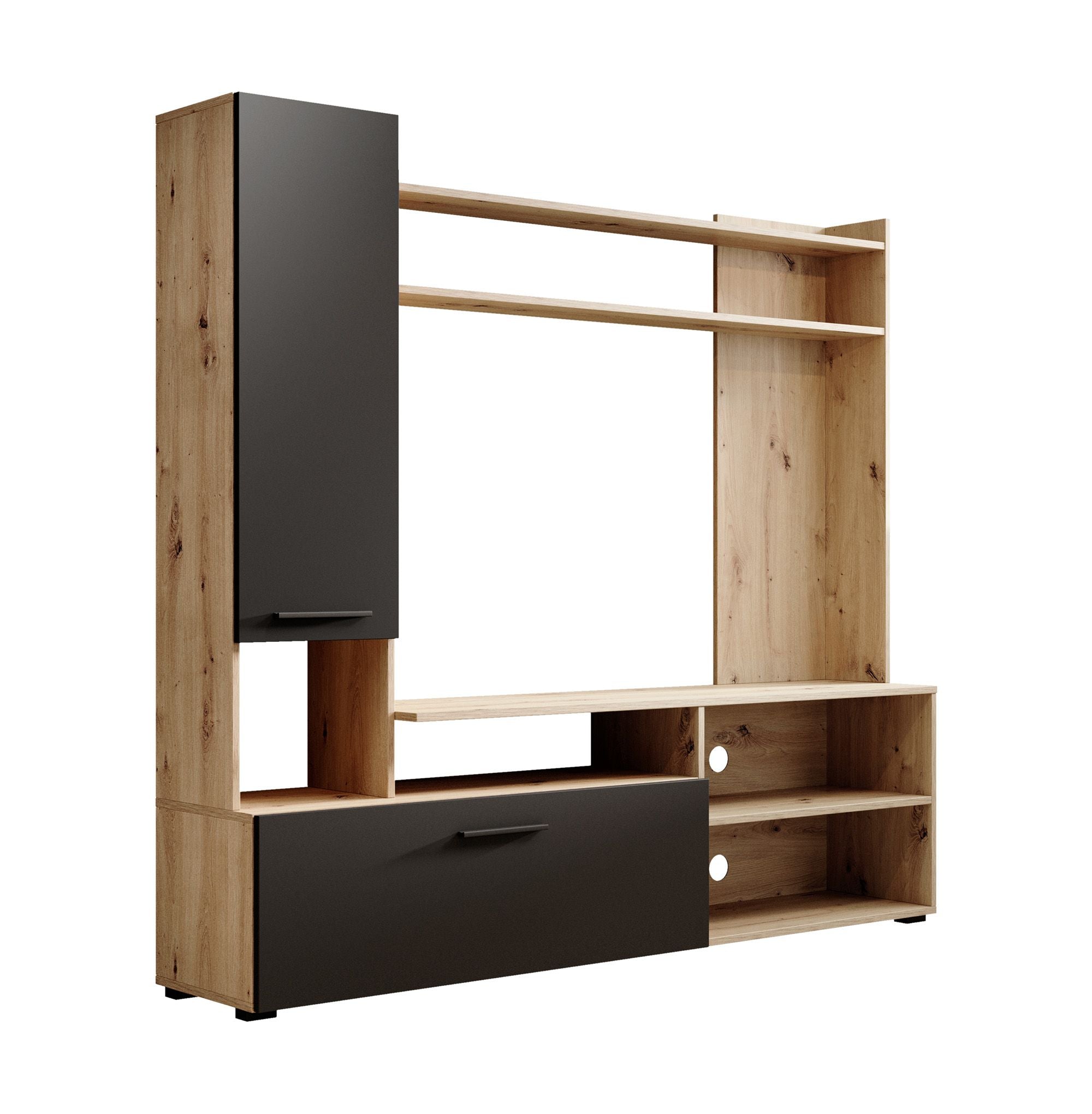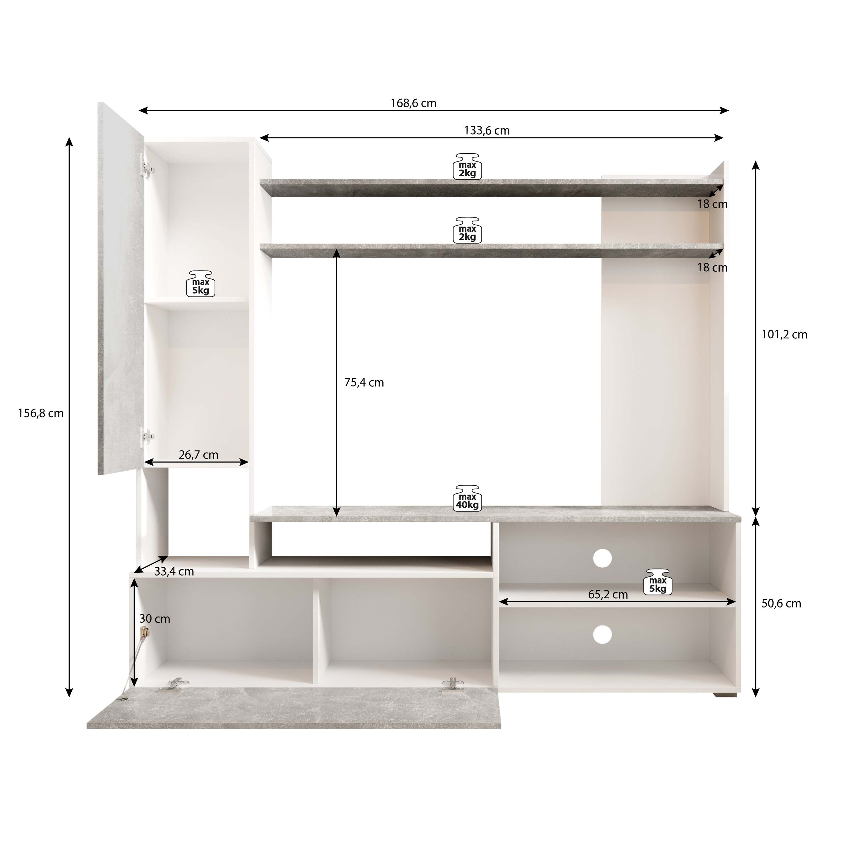 Wandmeubel Bridge bestaat uit een tv-meubel met daarop twee wandkasten en bijpassende wandplanken. De set staat op lage pootjes. Het tvmeubel heeft 1 klep. Het wandmeubel beschikt over 9 opbergvakken.