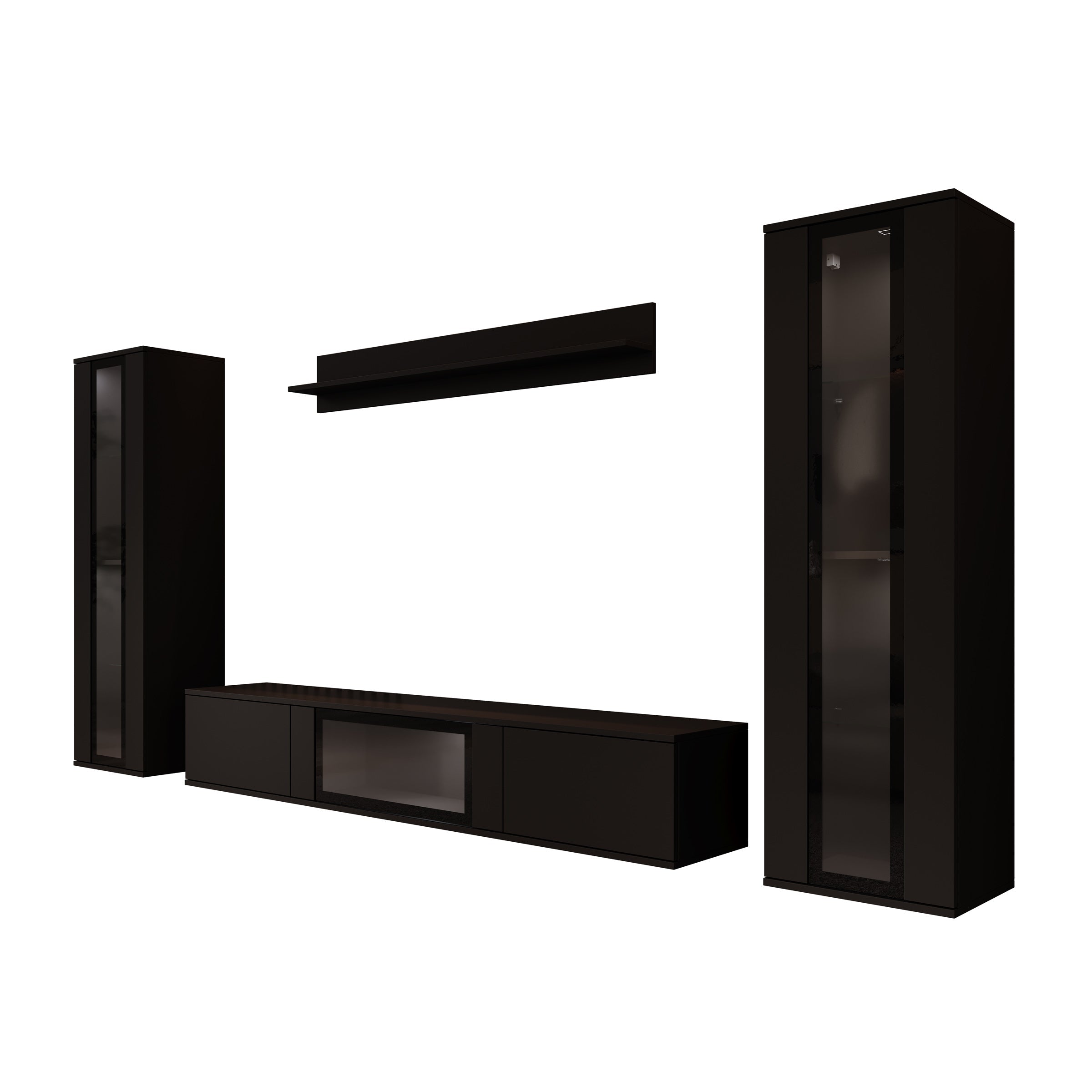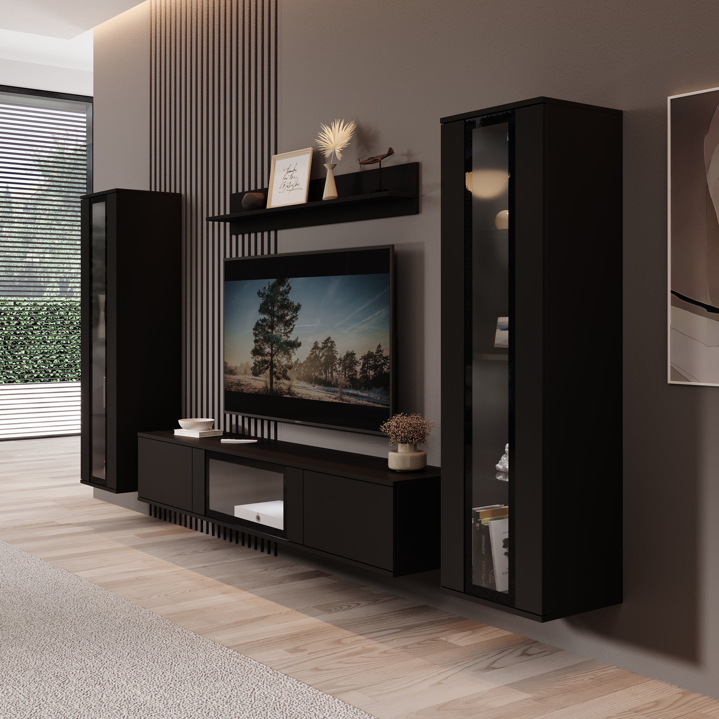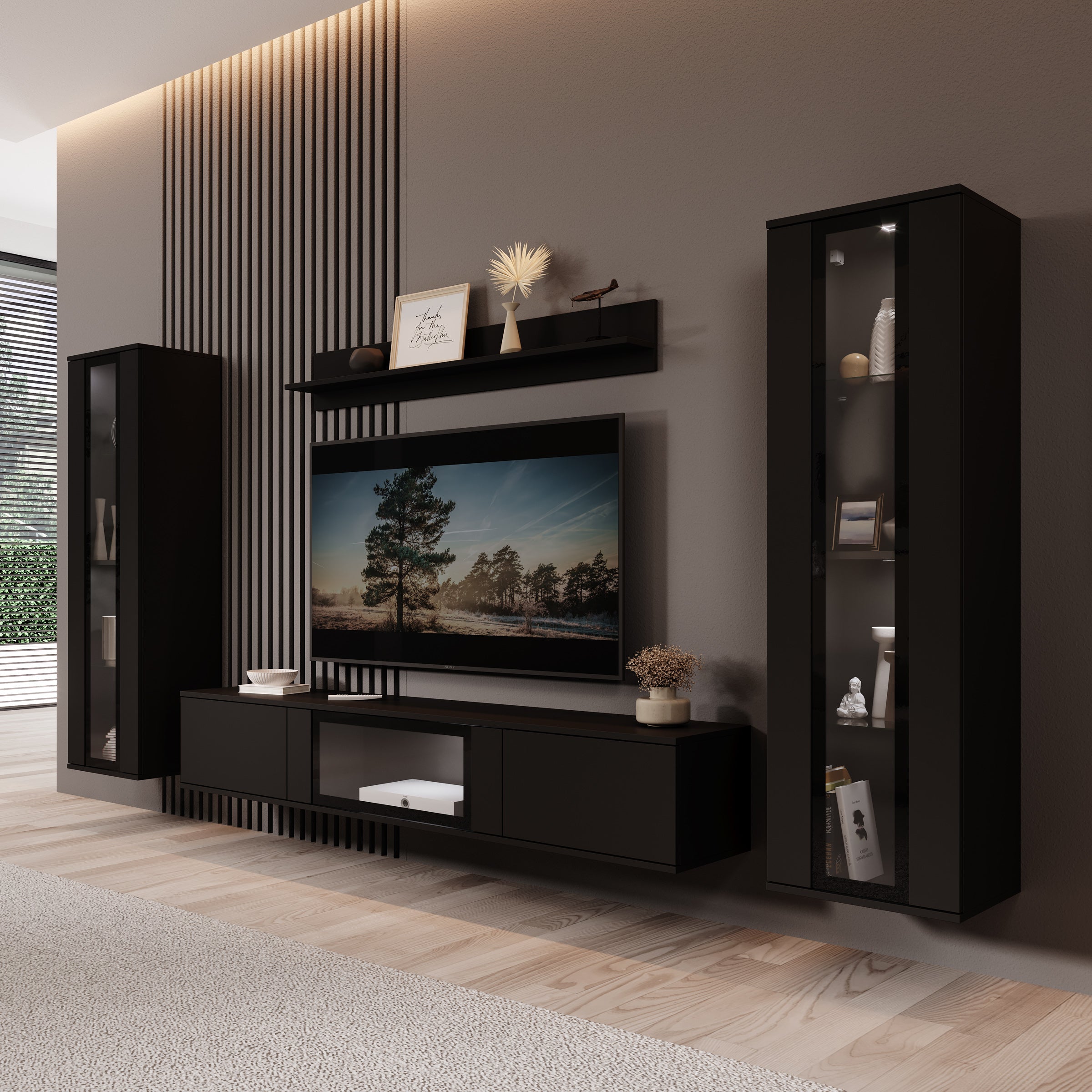 Wandmeubel Capone bestaat uit 1 wandplank, 2 vitrinekasten en 1 tv-meubel. De 3 kasten zijn hangend of staand te monteren. De pootjes van 5 cm hoog zitten erbij. De kasten zijn greeploos en voorzien van verlichting. De Capone is uitgevoerd in zwart.