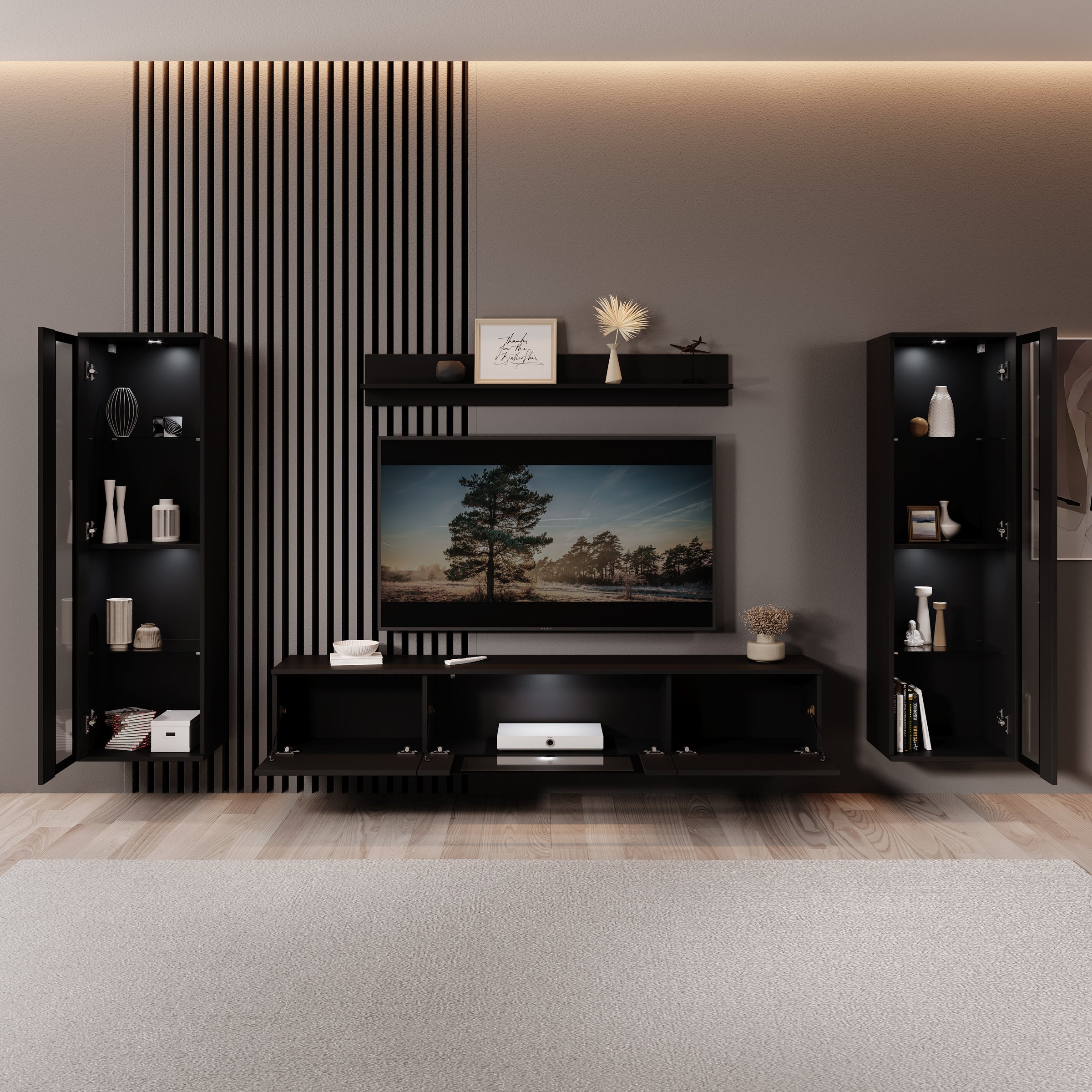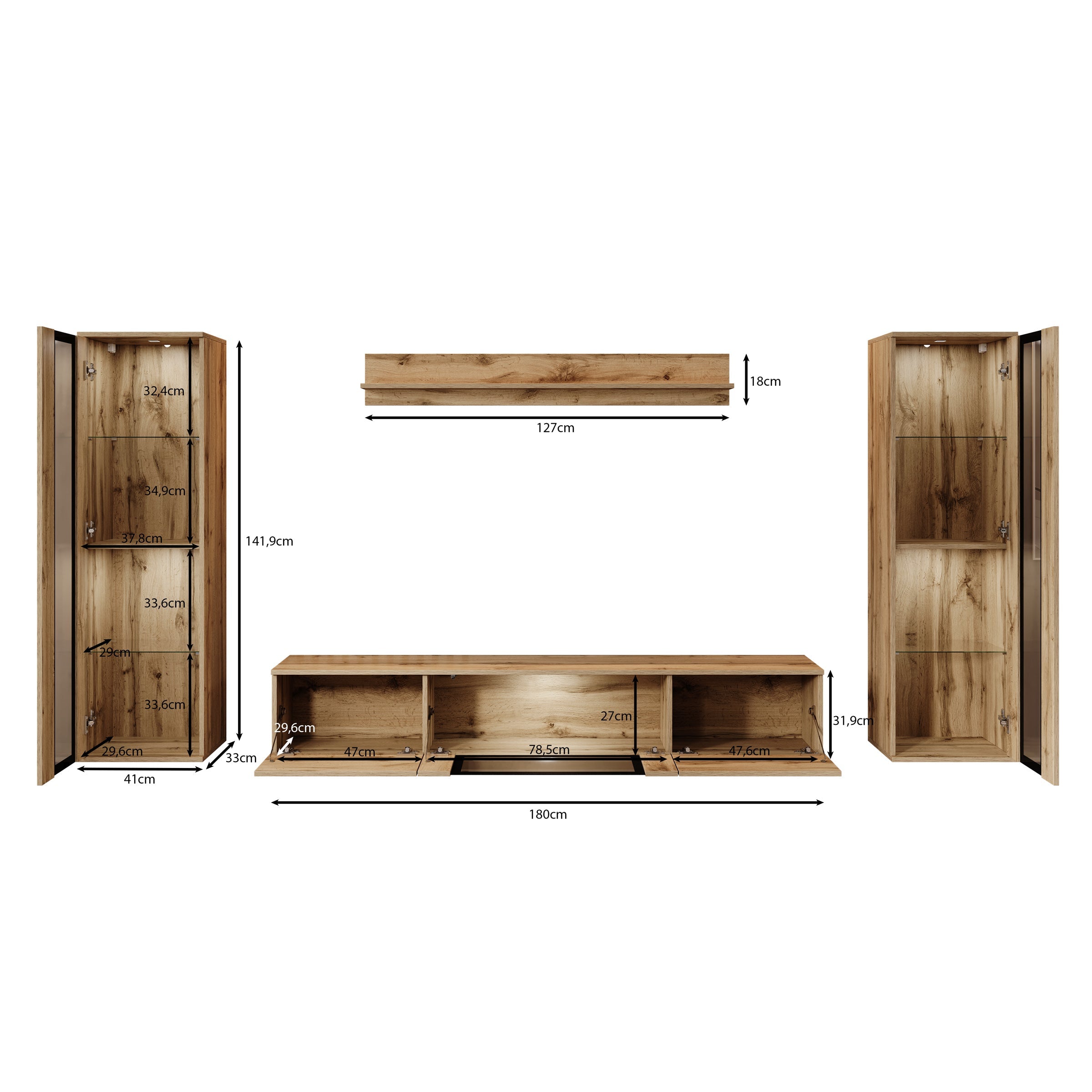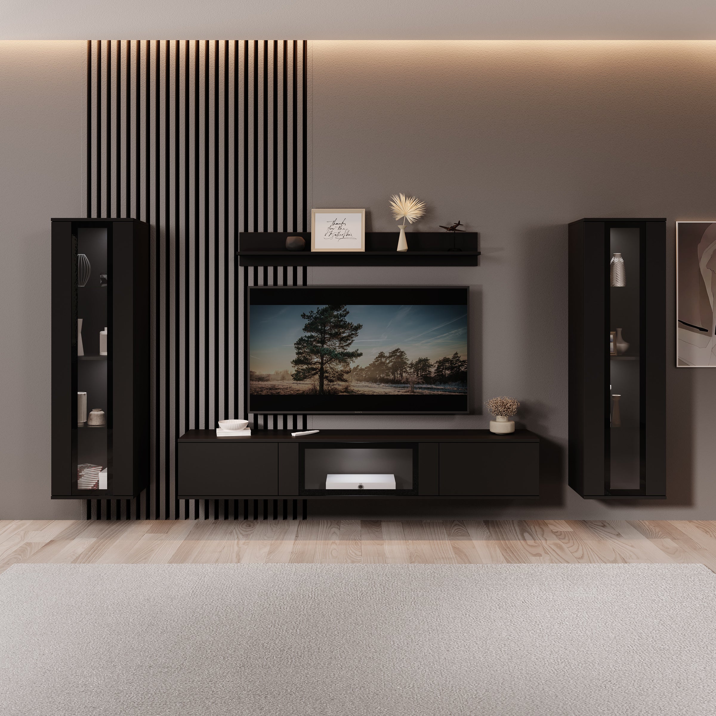 Wandmeubel Capone bestaat uit 1 wandplank, 2 vitrinekasten en 1 tv-meubel. De 3 kasten zijn hangend of staand te monteren. De pootjes van 5 cm hoog zitten erbij. De kasten zijn greeploos en voorzien van verlichting. De Capone is uitgevoerd in zwart.