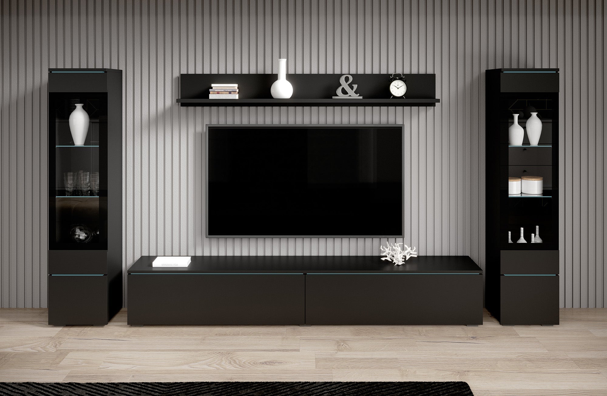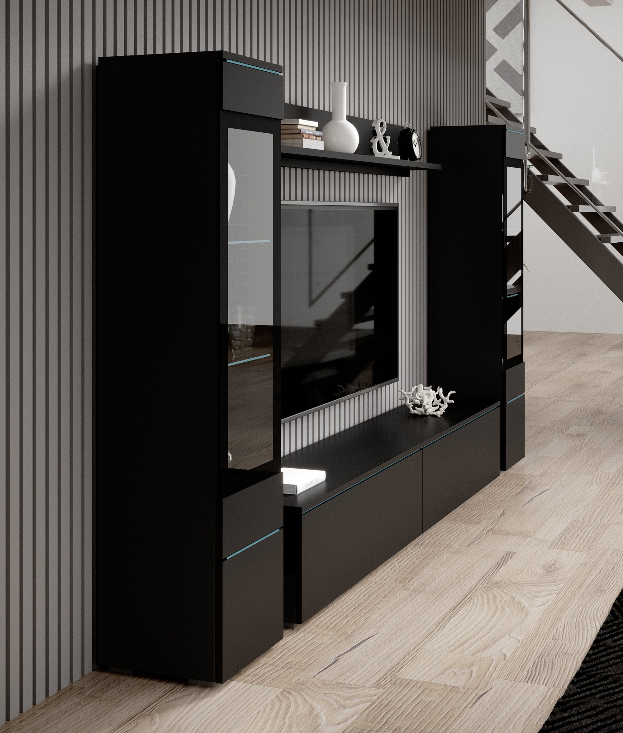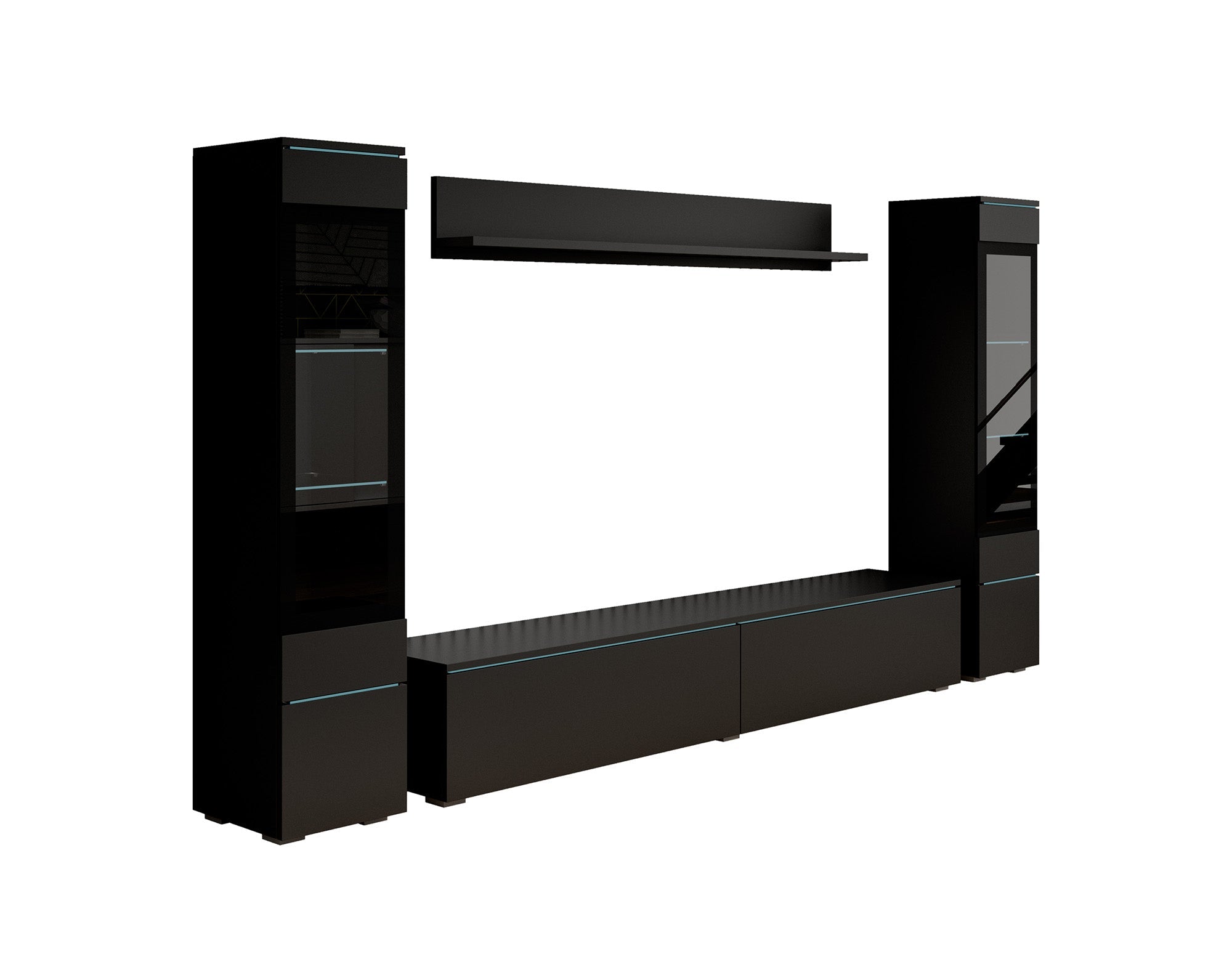 Wandmeubel Variety bestaat uit een tv-meubel, 2 vitrinekasten en bijpassende wandplank. Dit model is zowel staand als hangend te monteren. De kast is gemaakt van een stevige spaanplaat constructie. Uitgevoerd in een mat zwarte kleur.