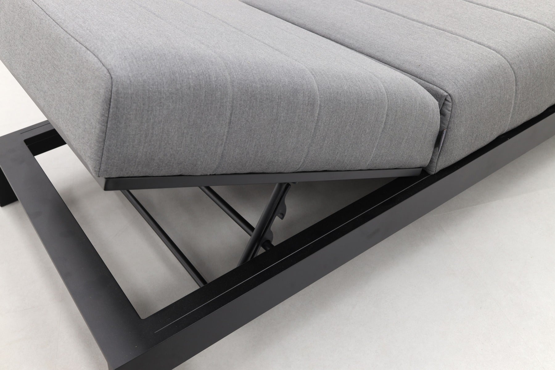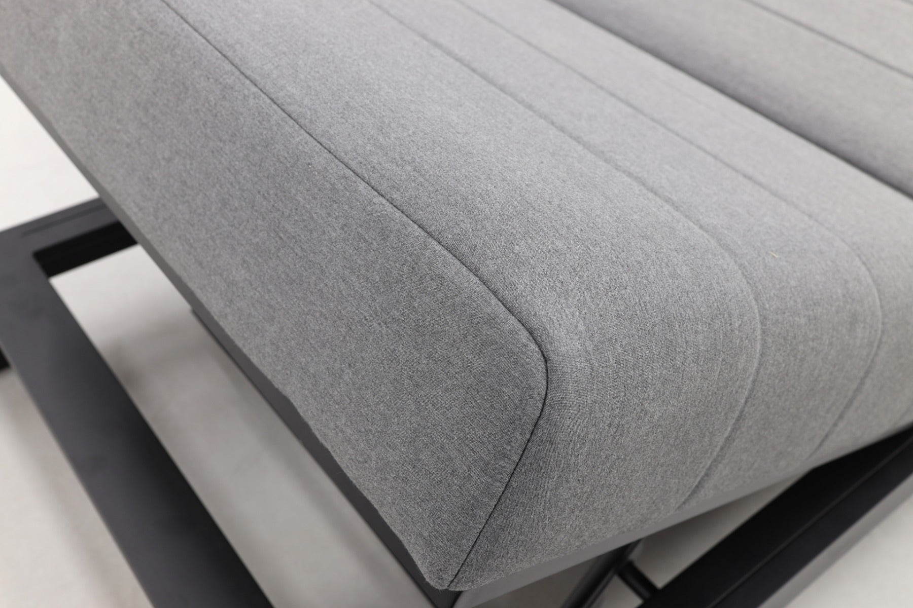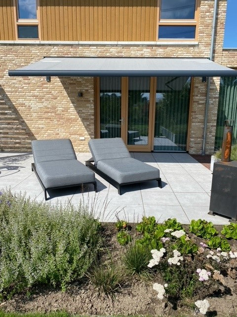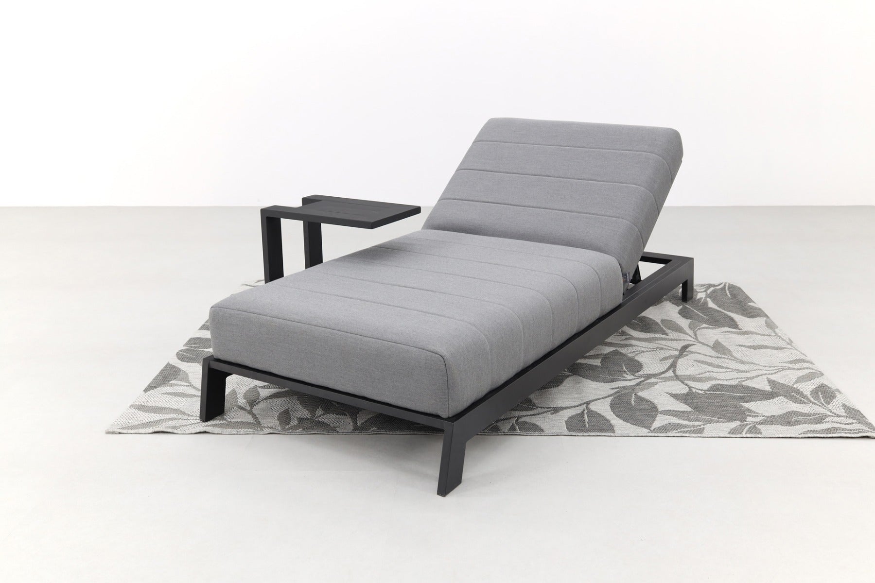 Het ligbed heeft een aluminium gepoedercoated frame. De kleur van het frame is antraciet. Op dit frame is een stevige vulling gemaakt. Dit is een vulling met een erg open structuur zodat het water direct weg kan lopen. Om deze vulling is de Sunbrella bekleding gemaakt in de kleur Light grey. Sunbrella is een stof dat weersbestendig is en het hele jaar buiten kan blijven.